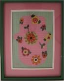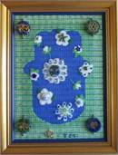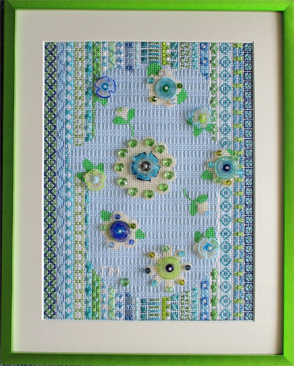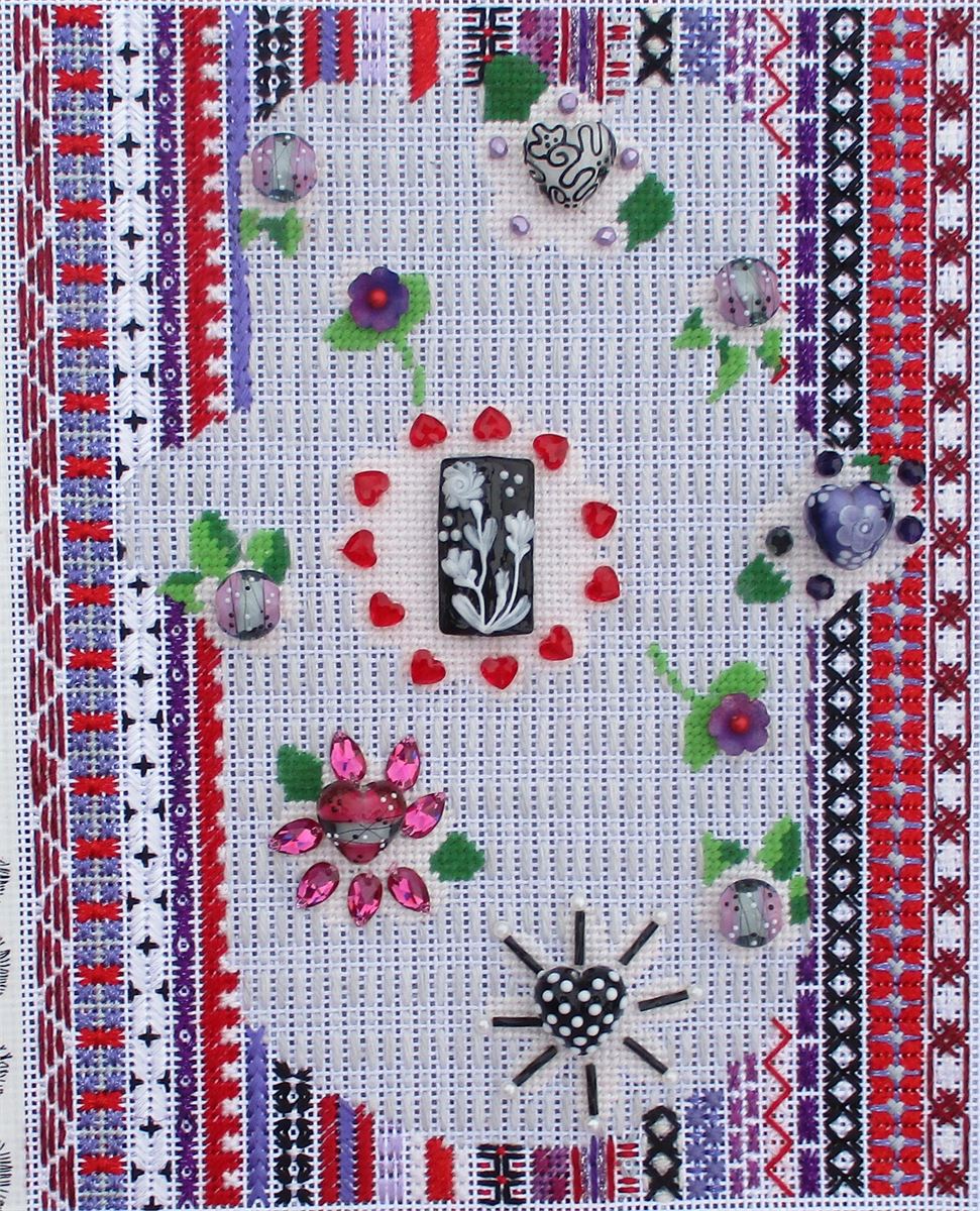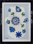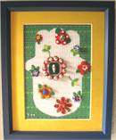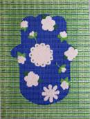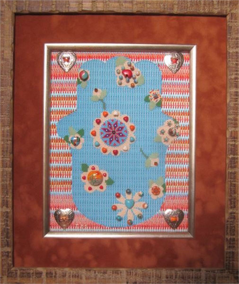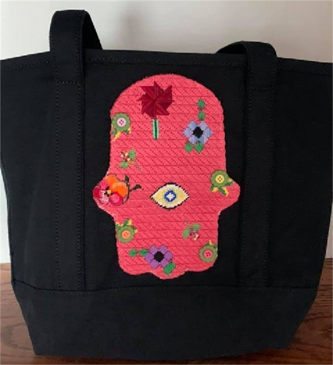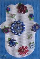 A Hamsa amulet hand to needlepoint. It is filled with art deco flowers. A hamsa is a palm-shaped amulet popular throughout the Middle East and North Africa and commonly used in jewelry and wall hangings. Flowers and floral design are among the most popular needlepoint designs. People have been stitching flowers and floral motifs for hundreds of years. Flowers are bright and pleasant, and most have underlying meanings to them.
