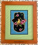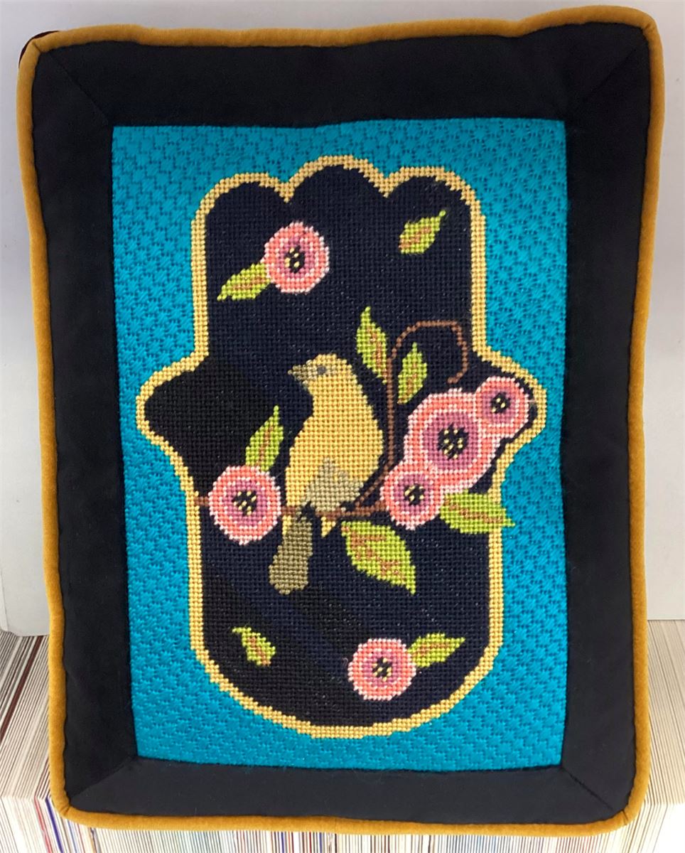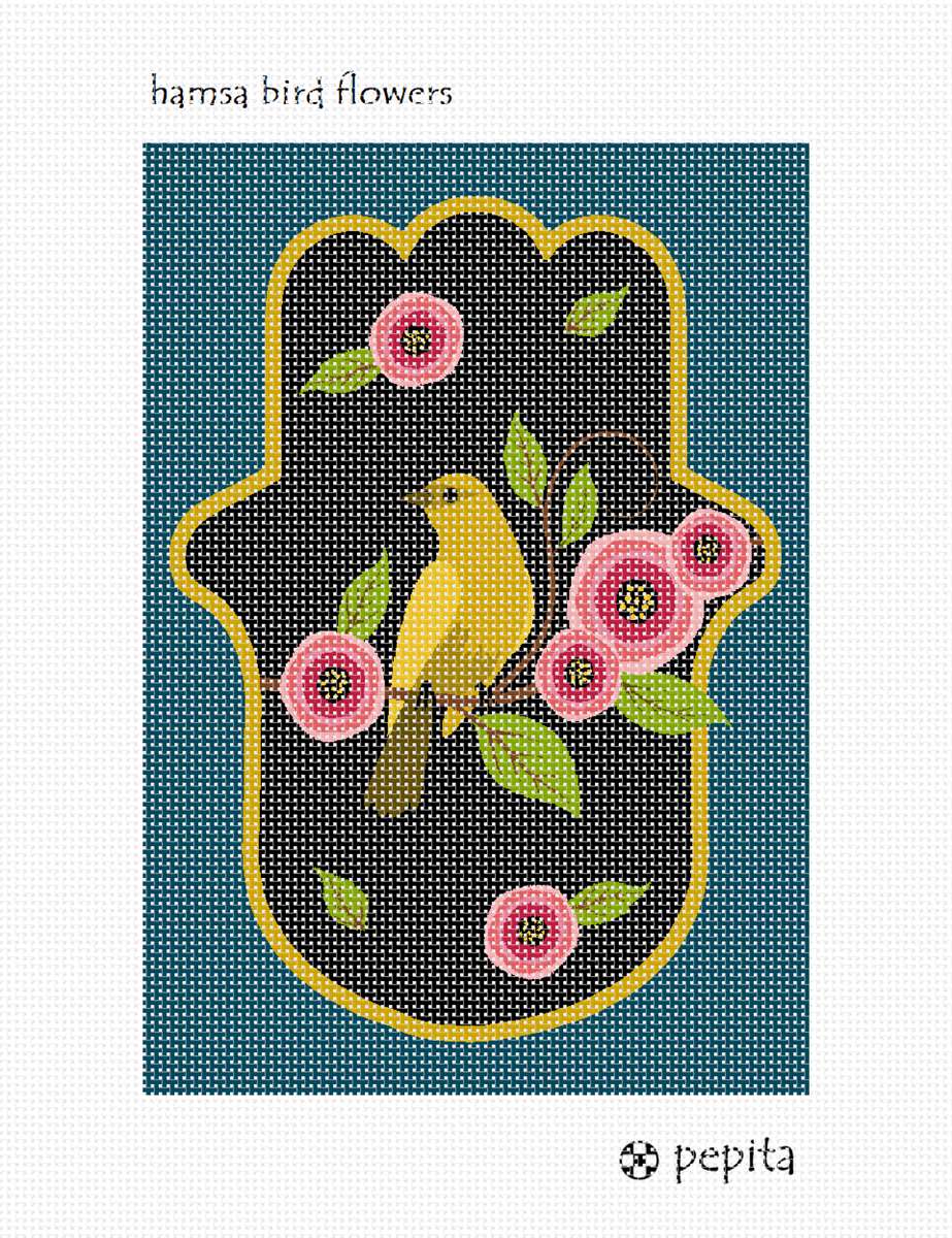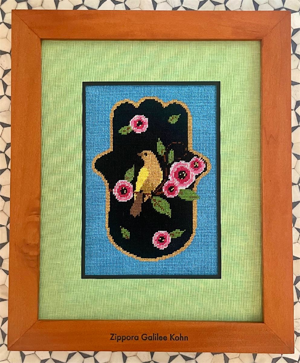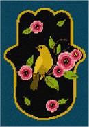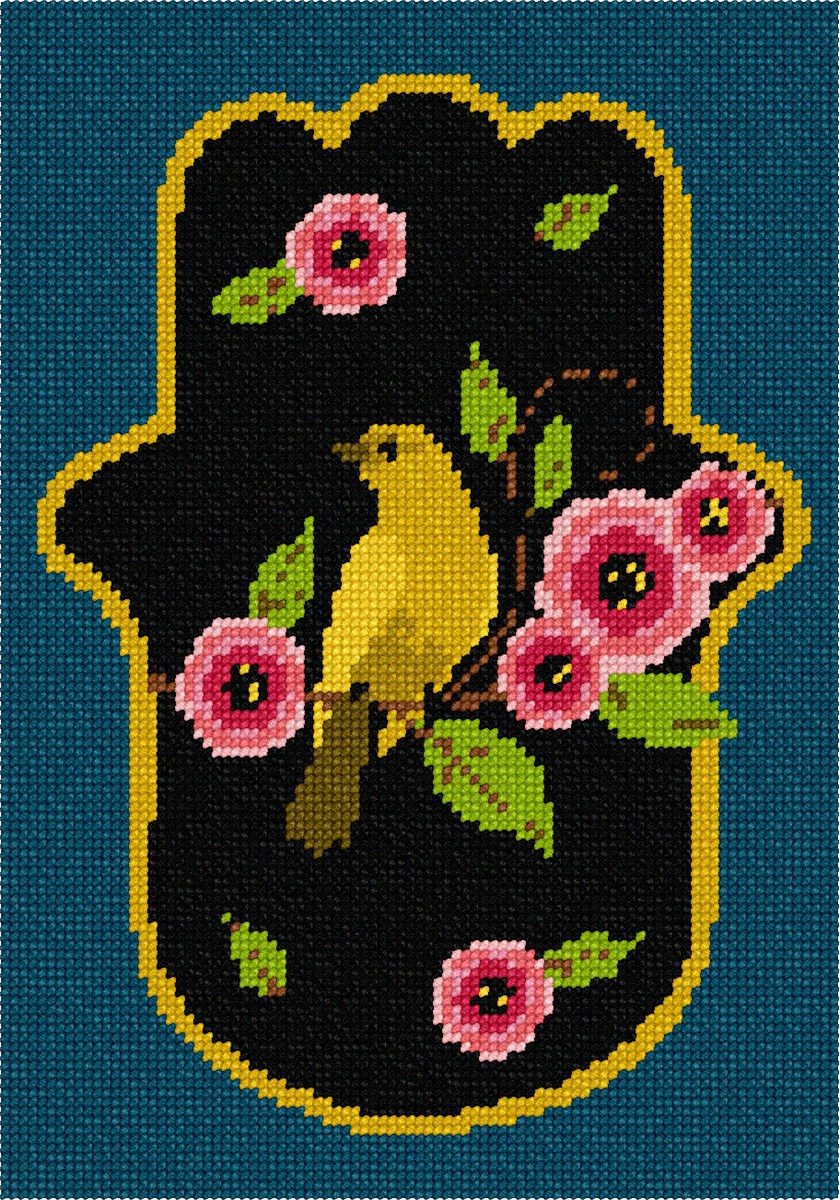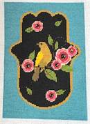 A hamsa is a palm-shaped amulet popular throughout the Middle East and North Africa and commonly used in jewelry and wall hangings. This one depicts a golden bird perched on a branch surrounded by flowers and greenery.