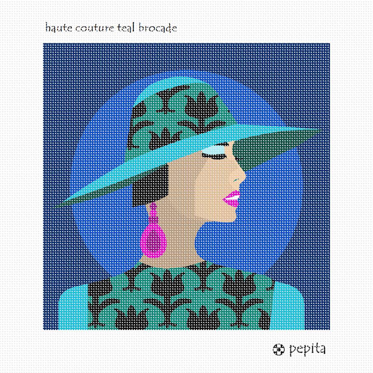 A fashionista dressed for a Paris stroll. Her teal brocade ensemble coordinates well with her magenta lipstick and earrings.
