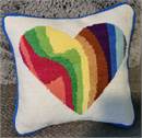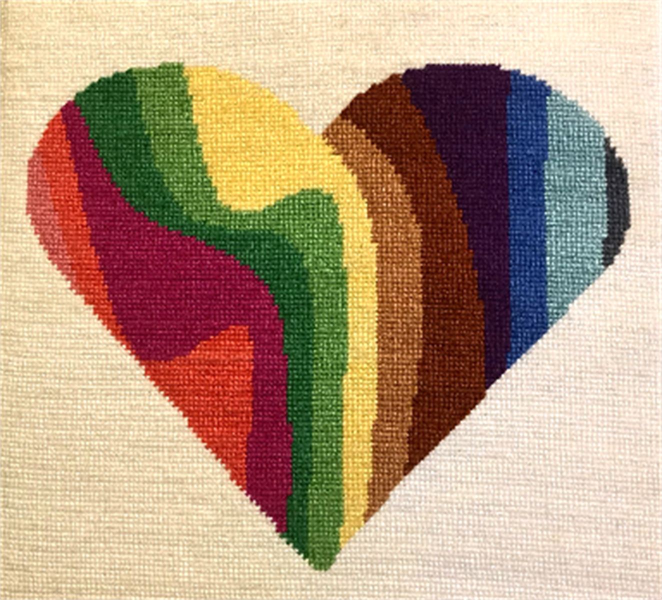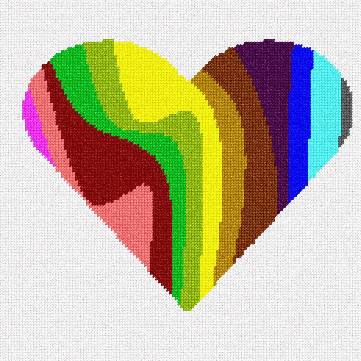 The shape of a heart filled with colorful stripes. There are many designs in our palette silhouette series. This heart is adorable and perfect for a beginner. Purchase as a kit, or buy just the plain canvas if you have many color threads in your stash.