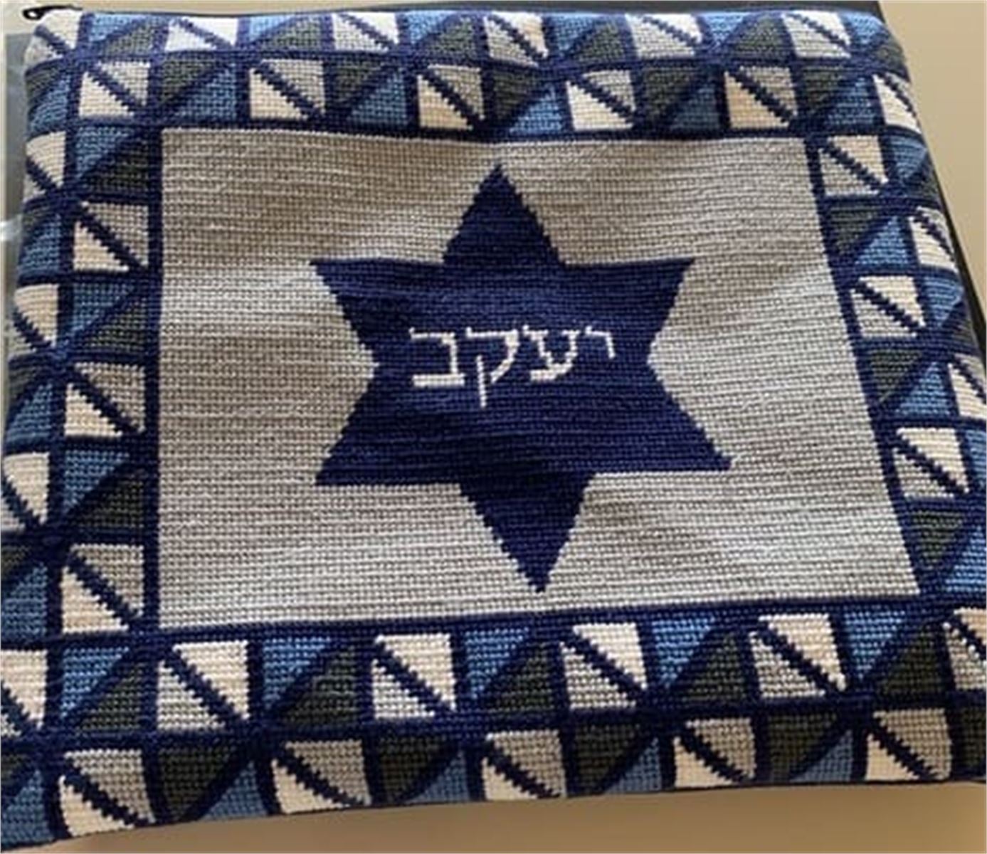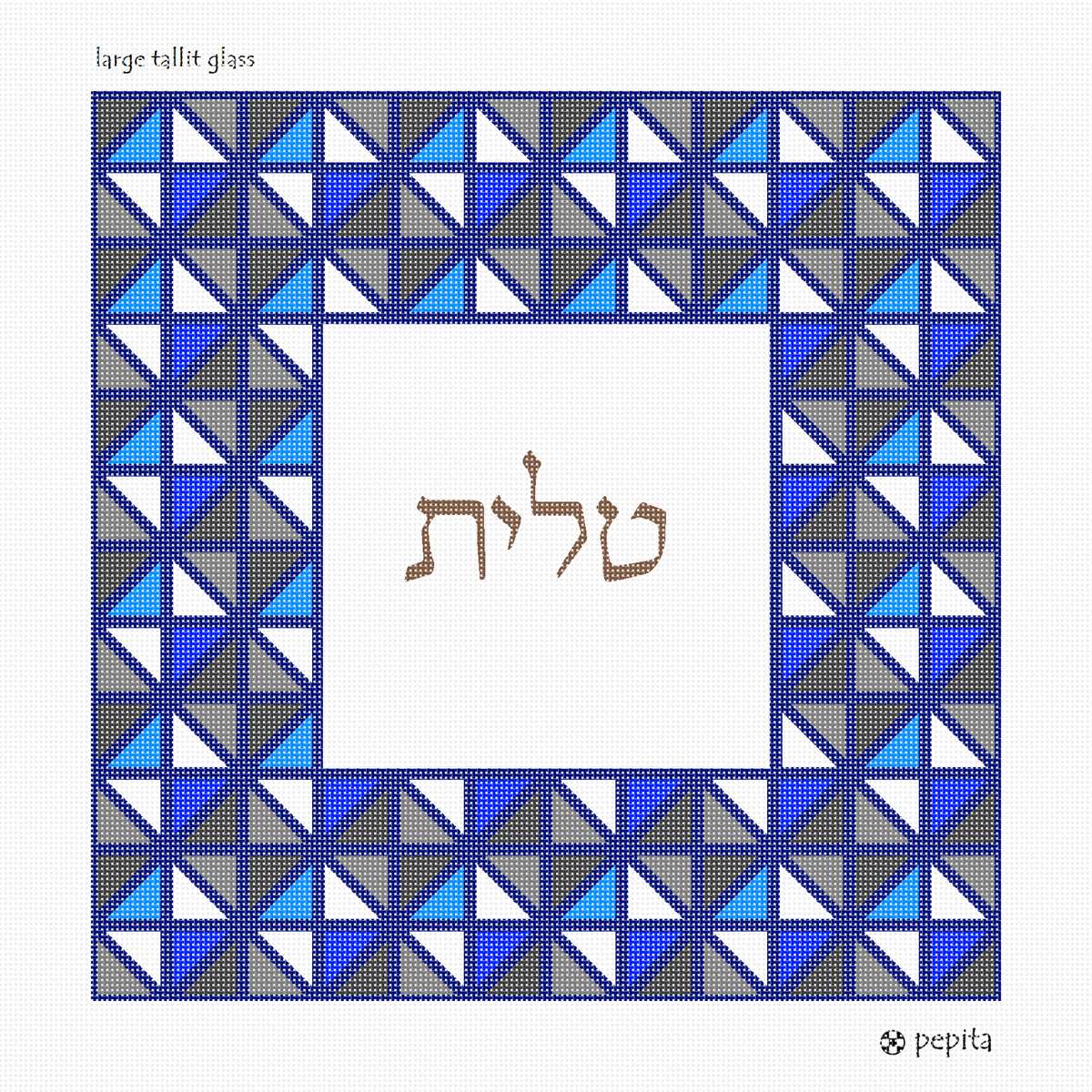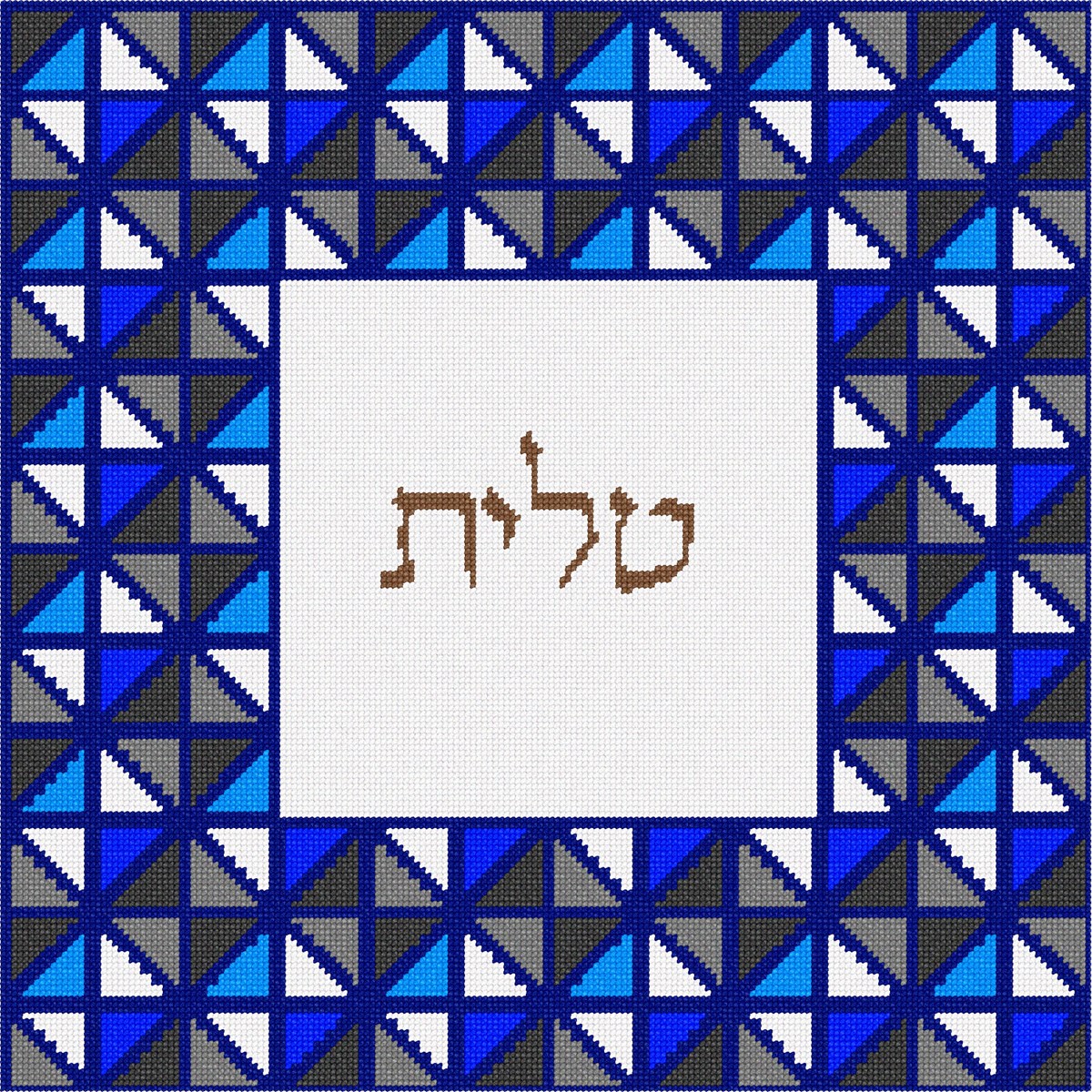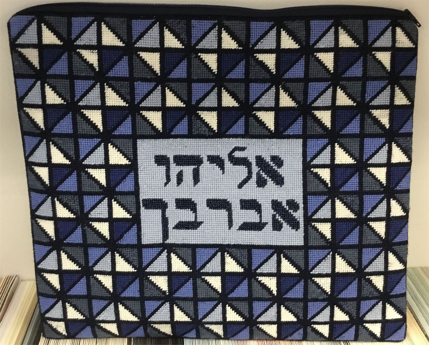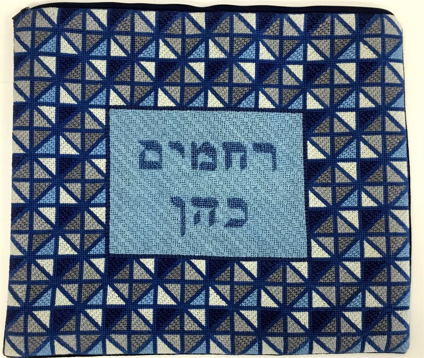 This unusual tallit bag is designed as though it is framed by stained glass. Reflecting triangles in blue and gray.