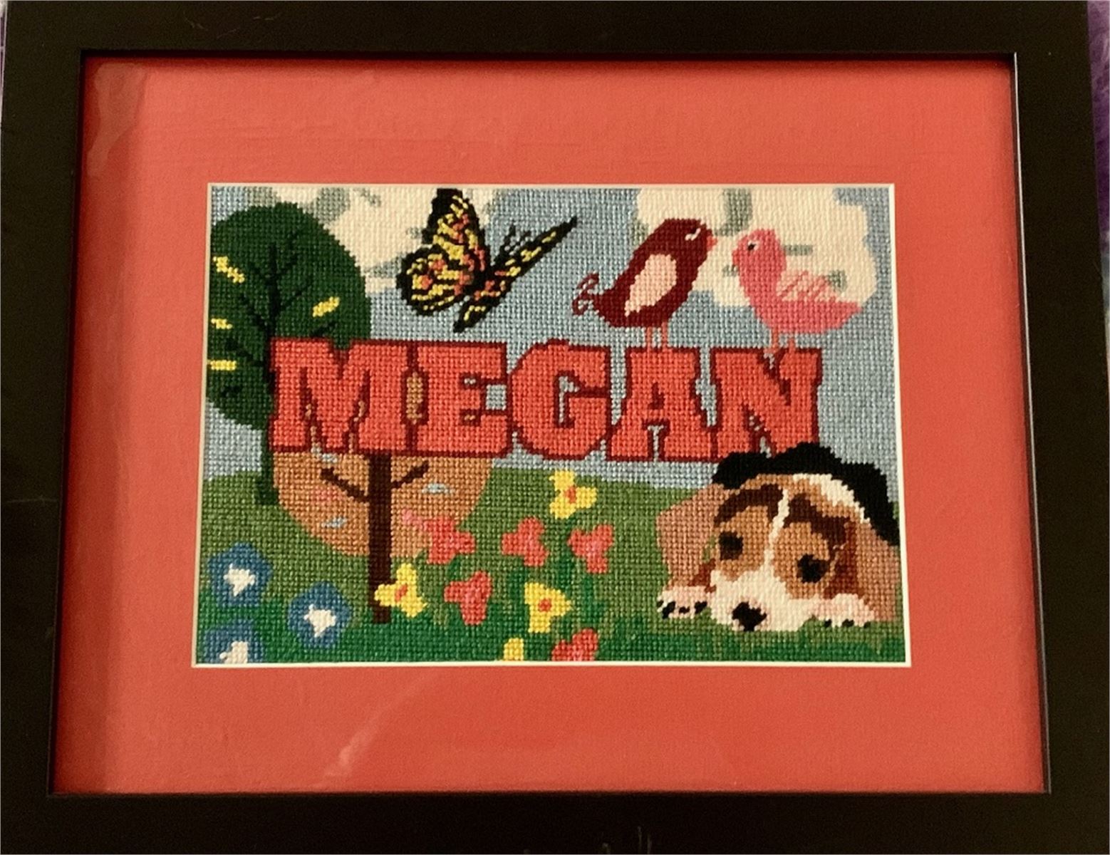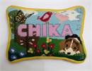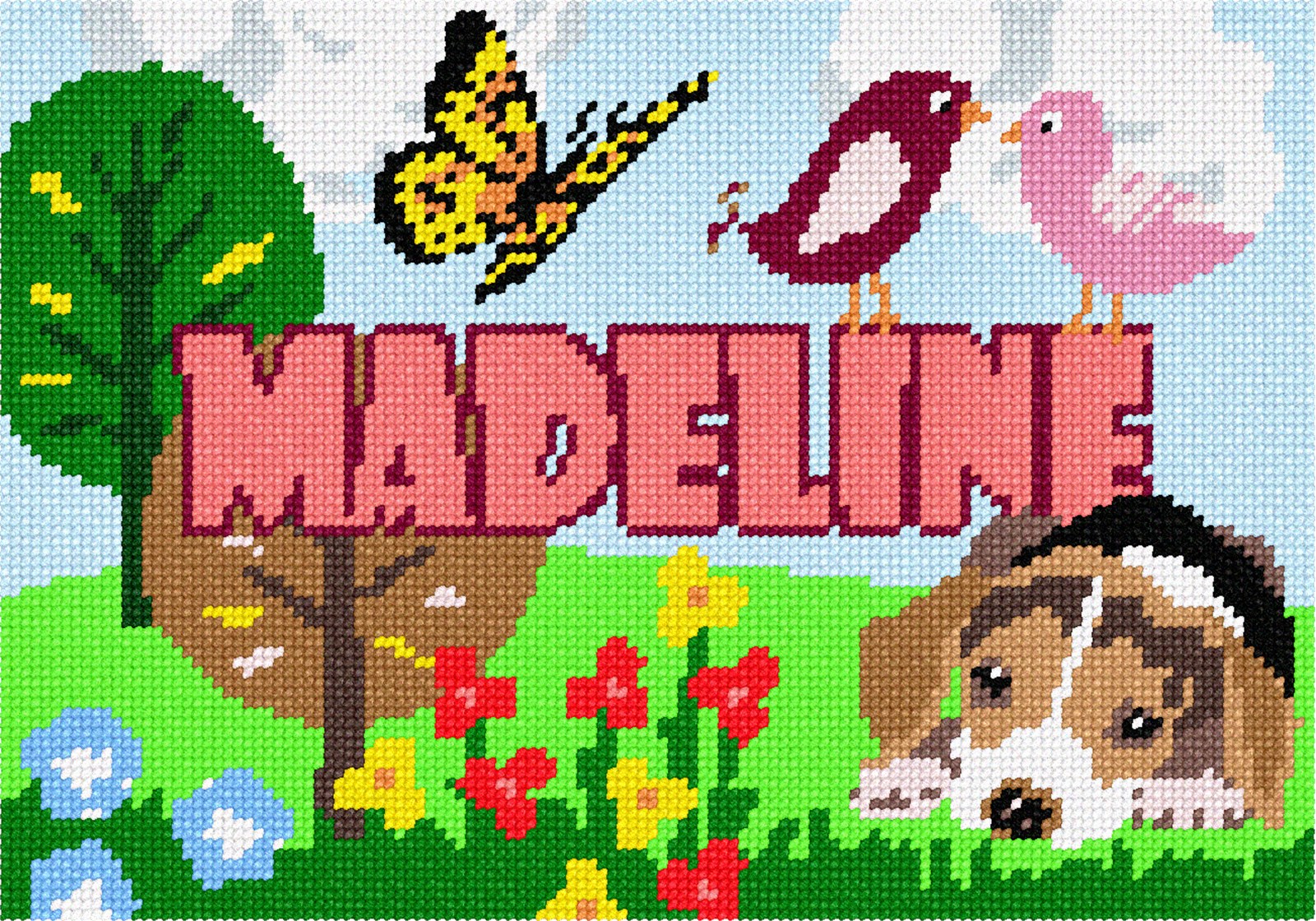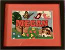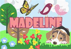 A name set against a floral scene and featuring a cute representative from multiple species. A hovering butterfly, two love birds, and a puppy, enjoy the summer weather among the grass, flowers and trees. Make sure to personalize this design with the name of your choice by clicking the "Customize" button, located above.