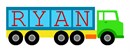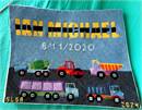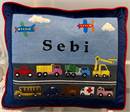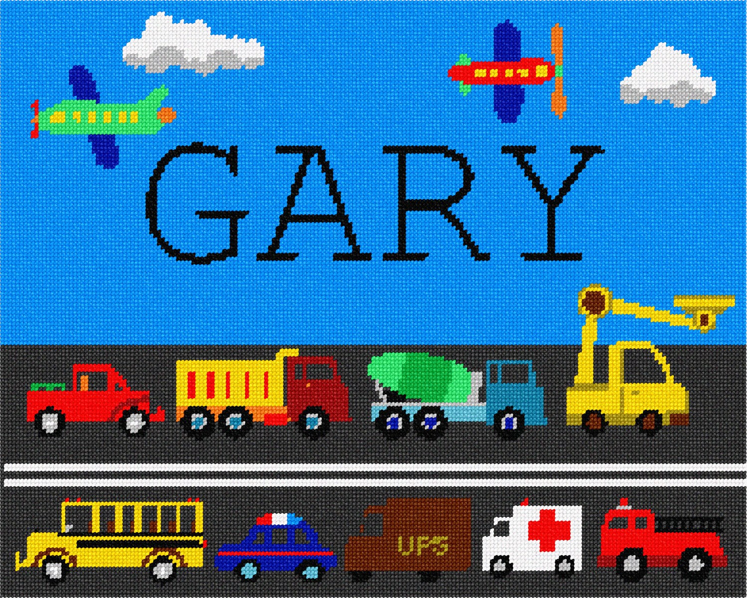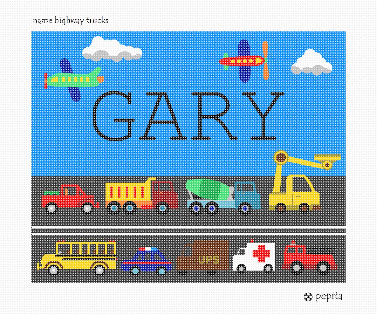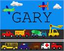 An excavator, dump truck, fire engine, police car, ambulance, pickup truck, mail truck, cement mixer, and a school bus are all riding along the highway. Personalize with your favorite little guy's name.