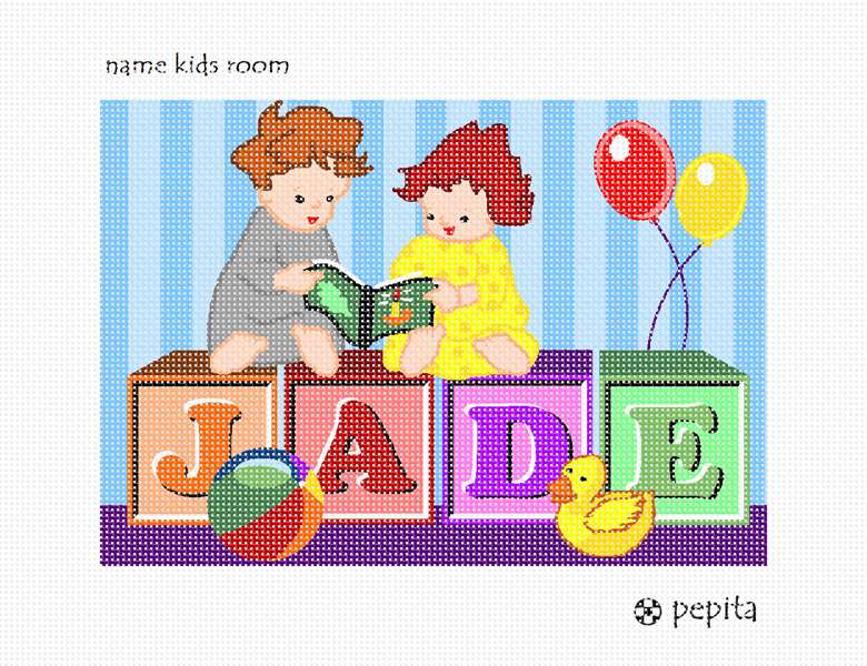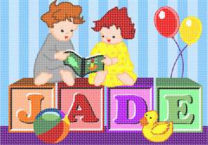Adorable design for a name spelled out with ABC blocks. A pair of children in pajamas read a book together on top, and toys in the foreground.