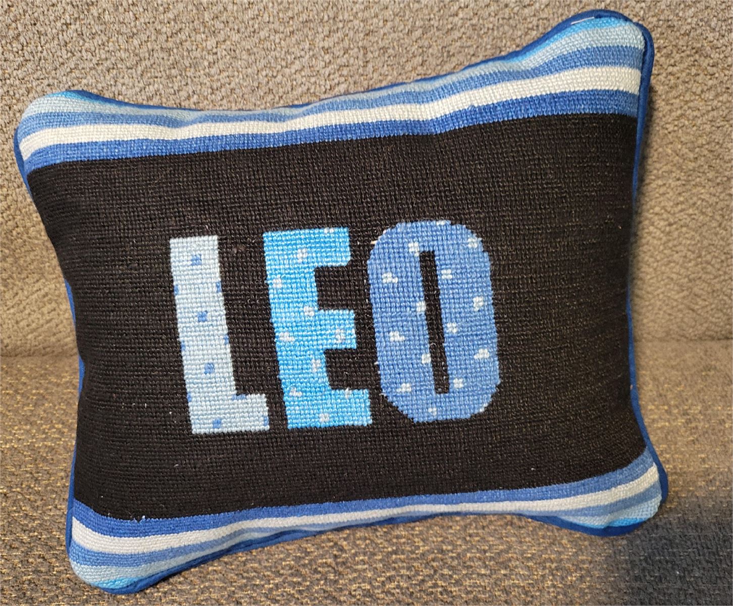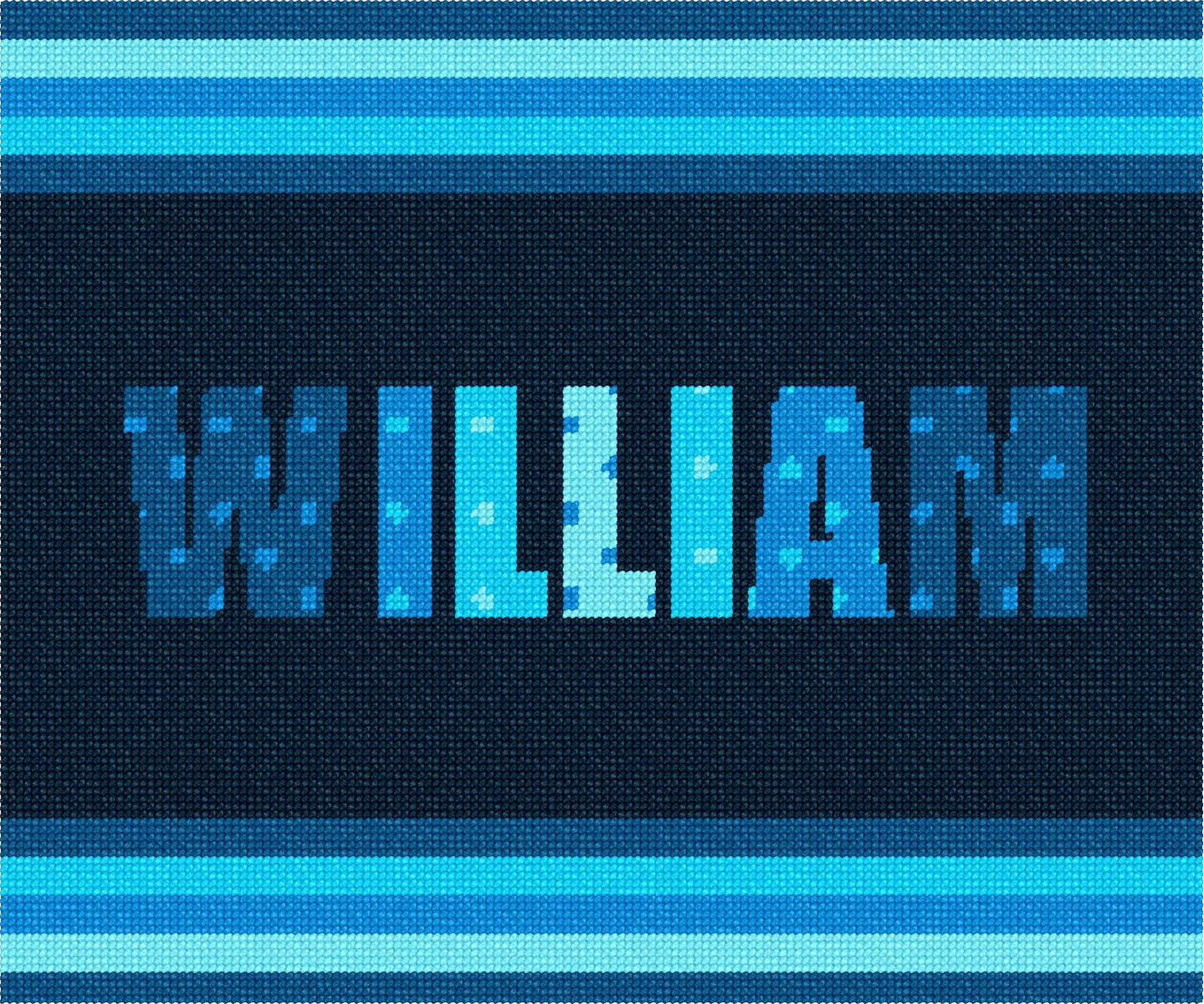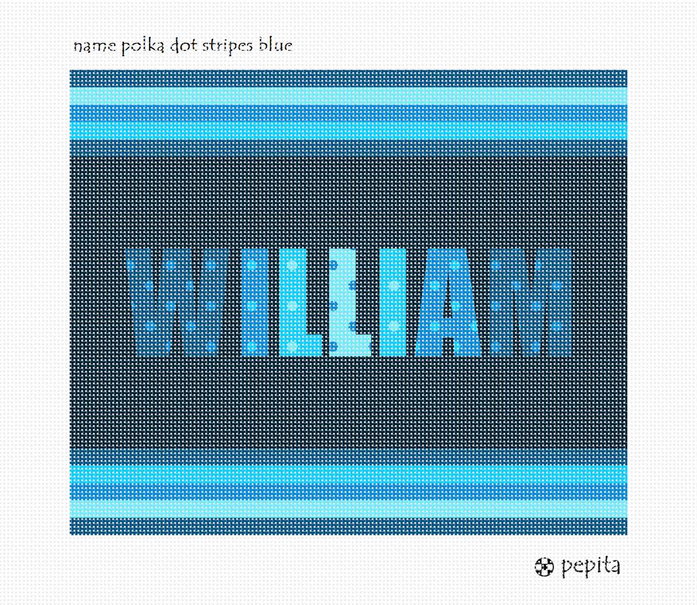 Stitch a happy blue themed custom name with polka dots and stripes. This design fits up to eight letters. Stitch a letter a day for a quick finish.