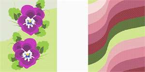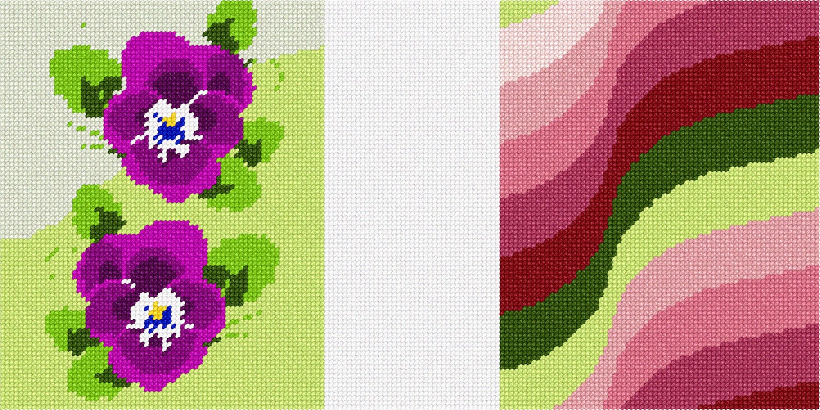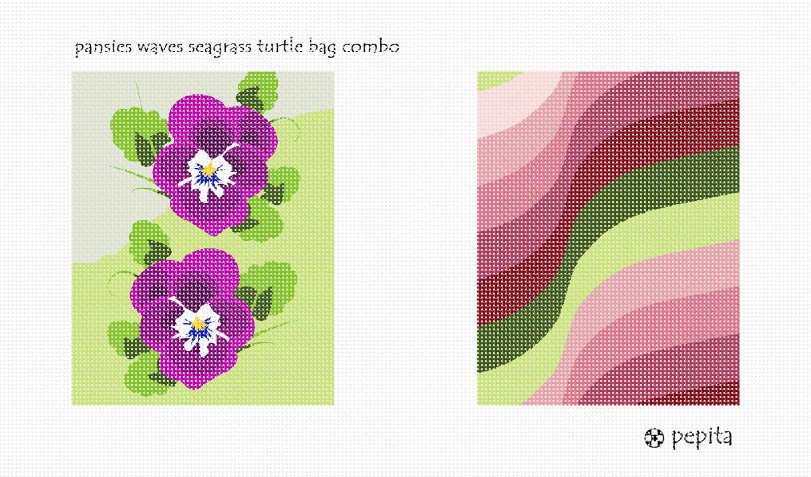 Stitch a shell for your new turtle bag. Turtle bags are tote bags that come with a window for interchangeable designs. This set has two designs to match the seagrass colored turtle bag. Stitch them both and switch off the inserts. Save money by purchasing a combo. These needlepoints can also be stitched as regular projects. They measure 5.5 X 7, so adjust the stitching area to 5 X 7 and frame with a ready made frame. This combo has a floral pansies design and a geometric wave pattern.
