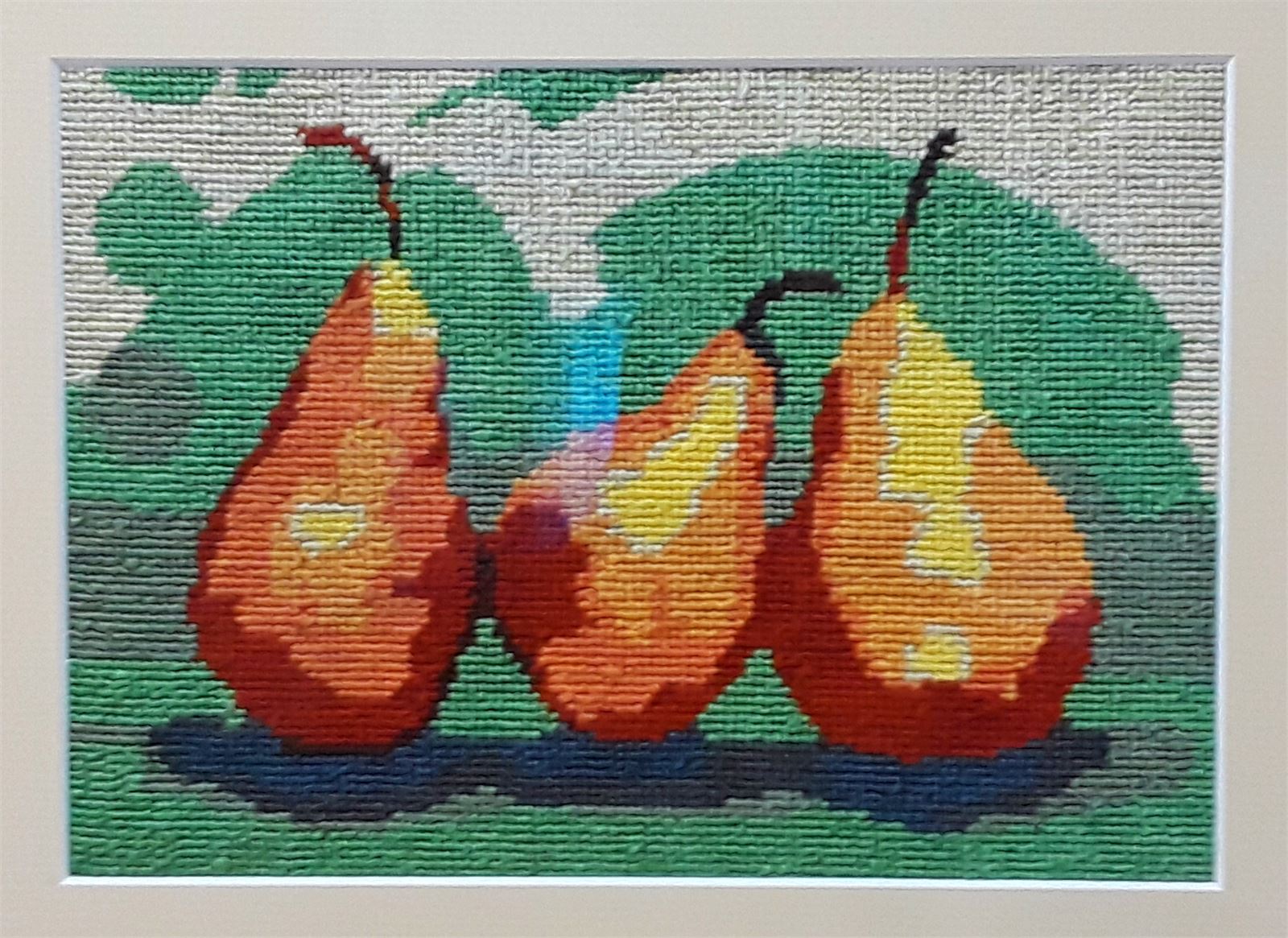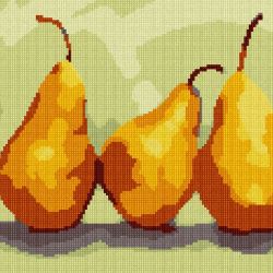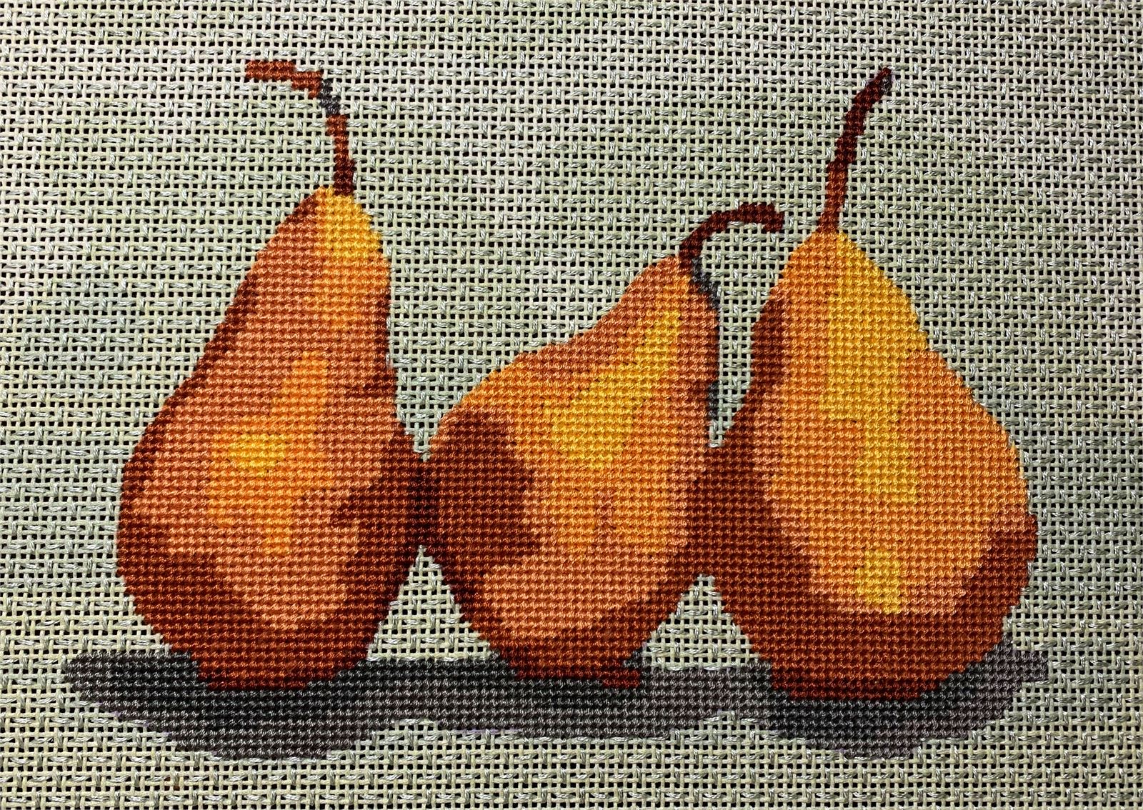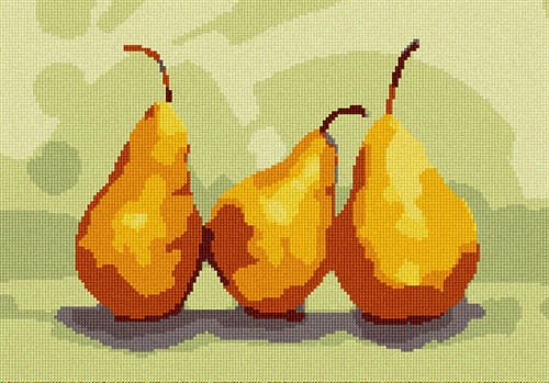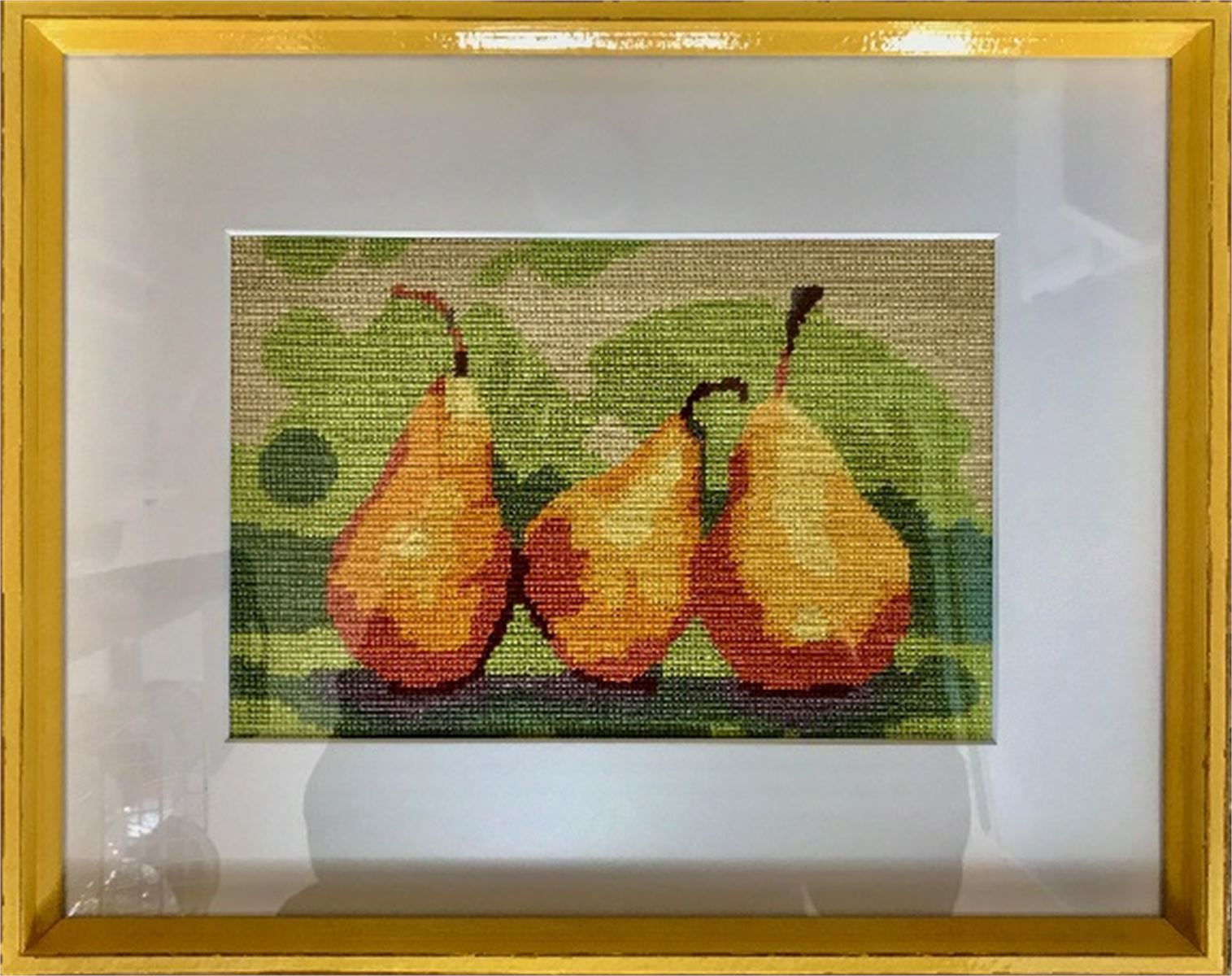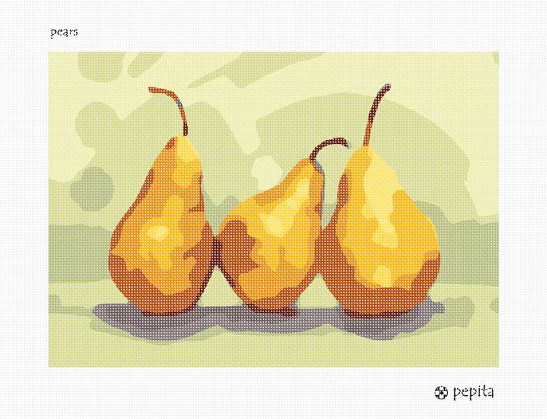 Positioned perfectly for this pear portrait, stitching these ripe specimens against a green-shaded background will be an enjoyable treat.