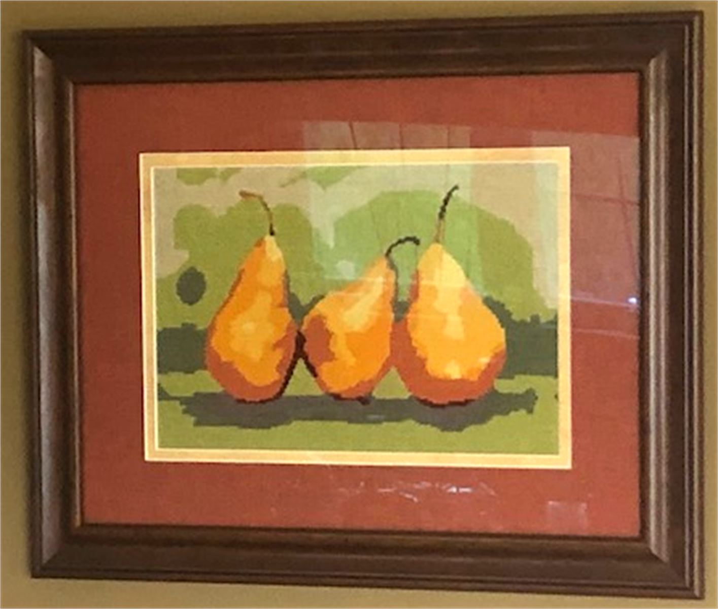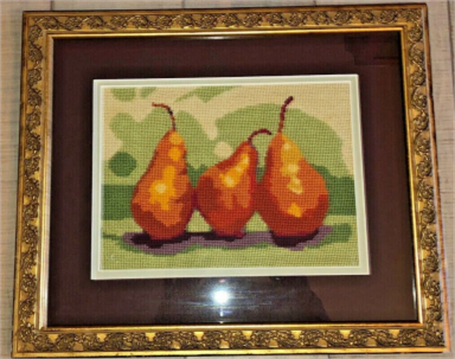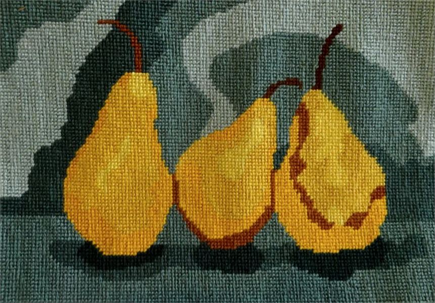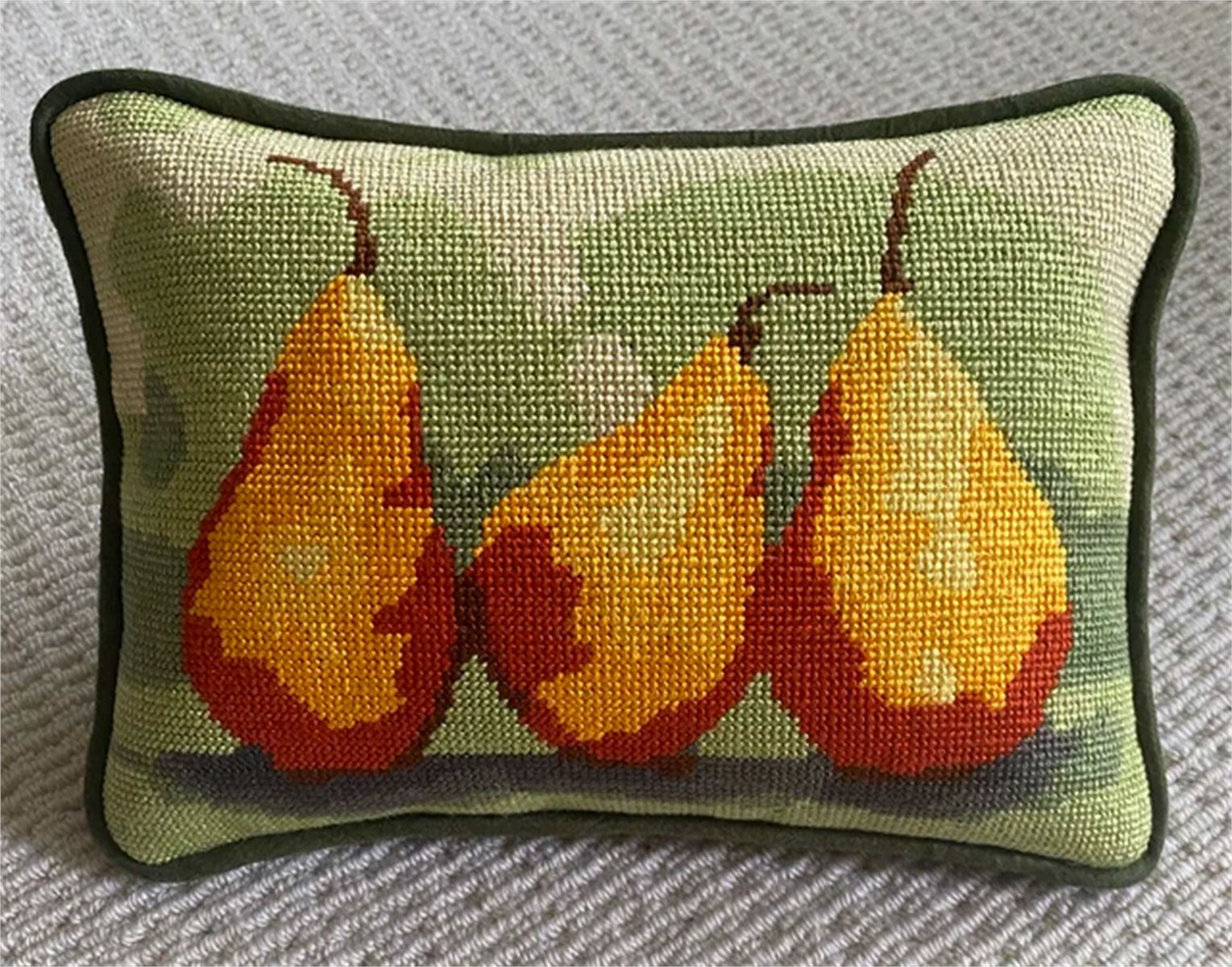 Positioned perfectly for this pear portrait, stitching these ripe specimens against a green-shaded background will be an enjoyable treat.