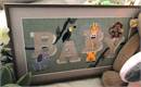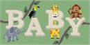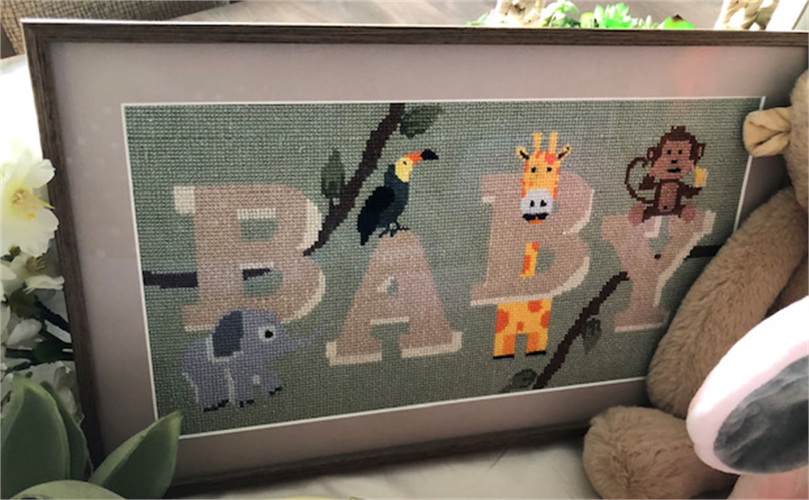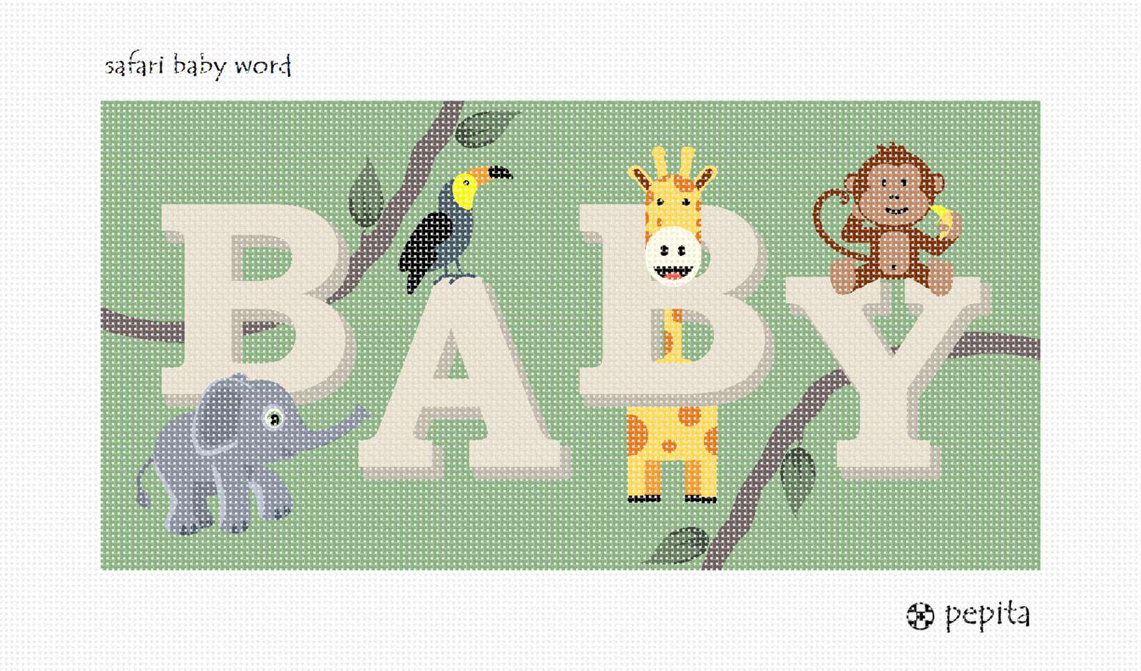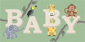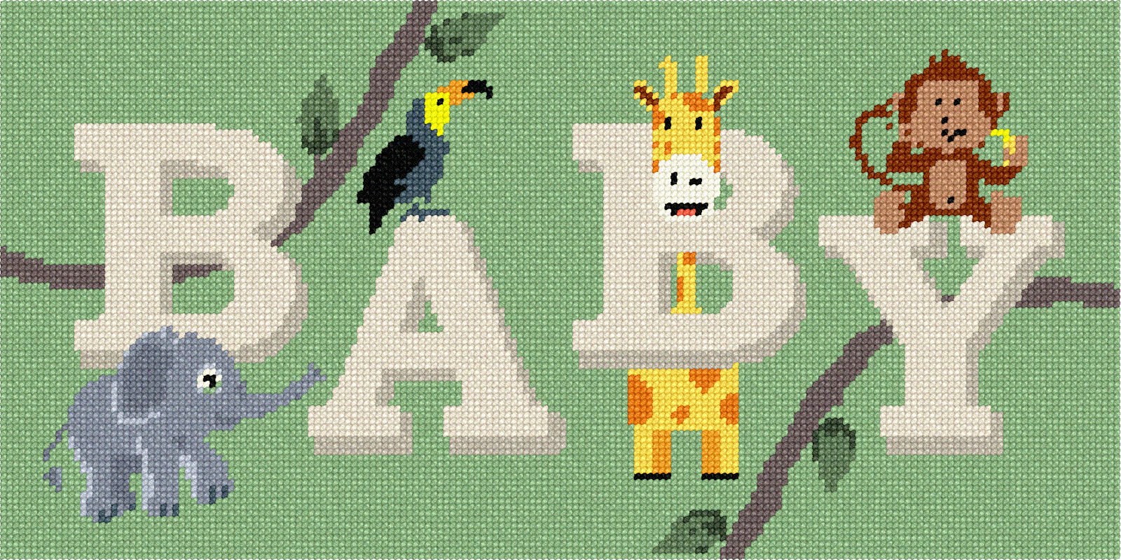 The word "Baby" in safari theme. A toucan, giraffe, monkey, and baby elephant adorn this adorable baby jungle scene. This is perfect for a baby shower gift. Its unisex design makes it appealing to stitch for a baby nursery.