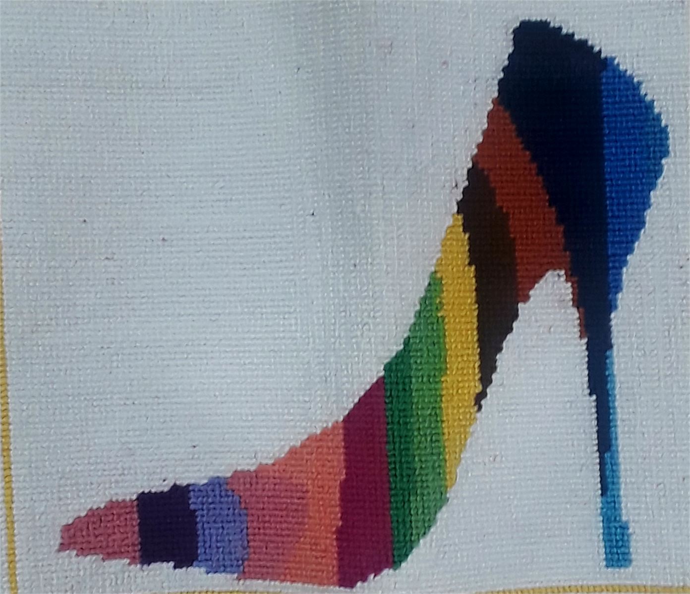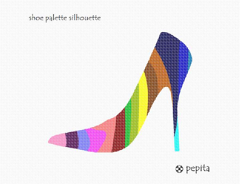 The shape of a high heel shoe filled with colorful stripes. There are many designs in our palette silhouette series. This shoe is adorable and perfect for a beginner. Purchase as a kit, or buy just the plain canvas if you have many color threads in your stash.
