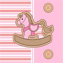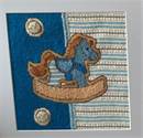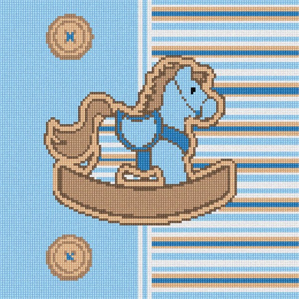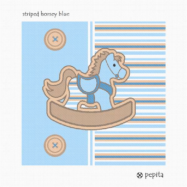 Soft pastel blue and brown stripes on one side - solid blue and cute buttons on the other side - and the sweetest rocking horse smack in the middle. When this piece is done you'll almost want to try it on.