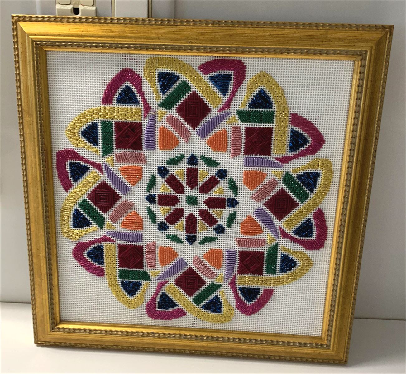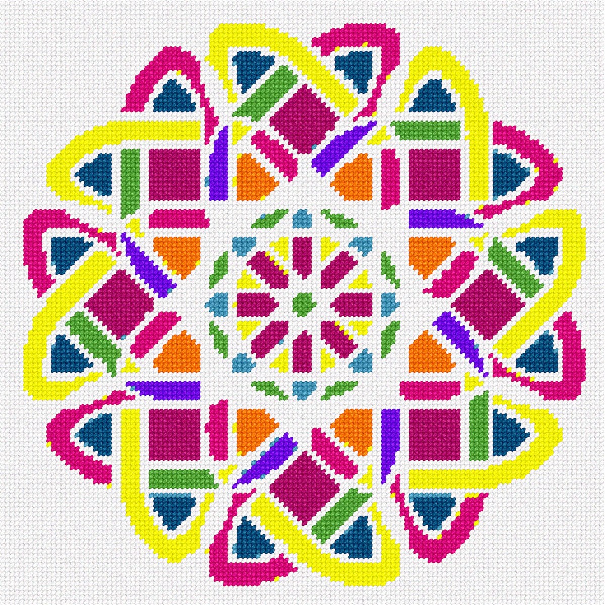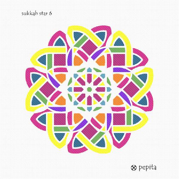 Stitch this geometric star pattern. It is for Sukkos. Sukkot commemorates the years that the Jews spent in the desert on their way to the Promised Land, and celebrates the way in which God protected them under difficult desert conditions. Sukkot is also known as the Feast of Tabernacles, or the Feast of Booths. We eat and sleep in the Sukkah, and we decorate it splendidly. This sukkah star does just that.