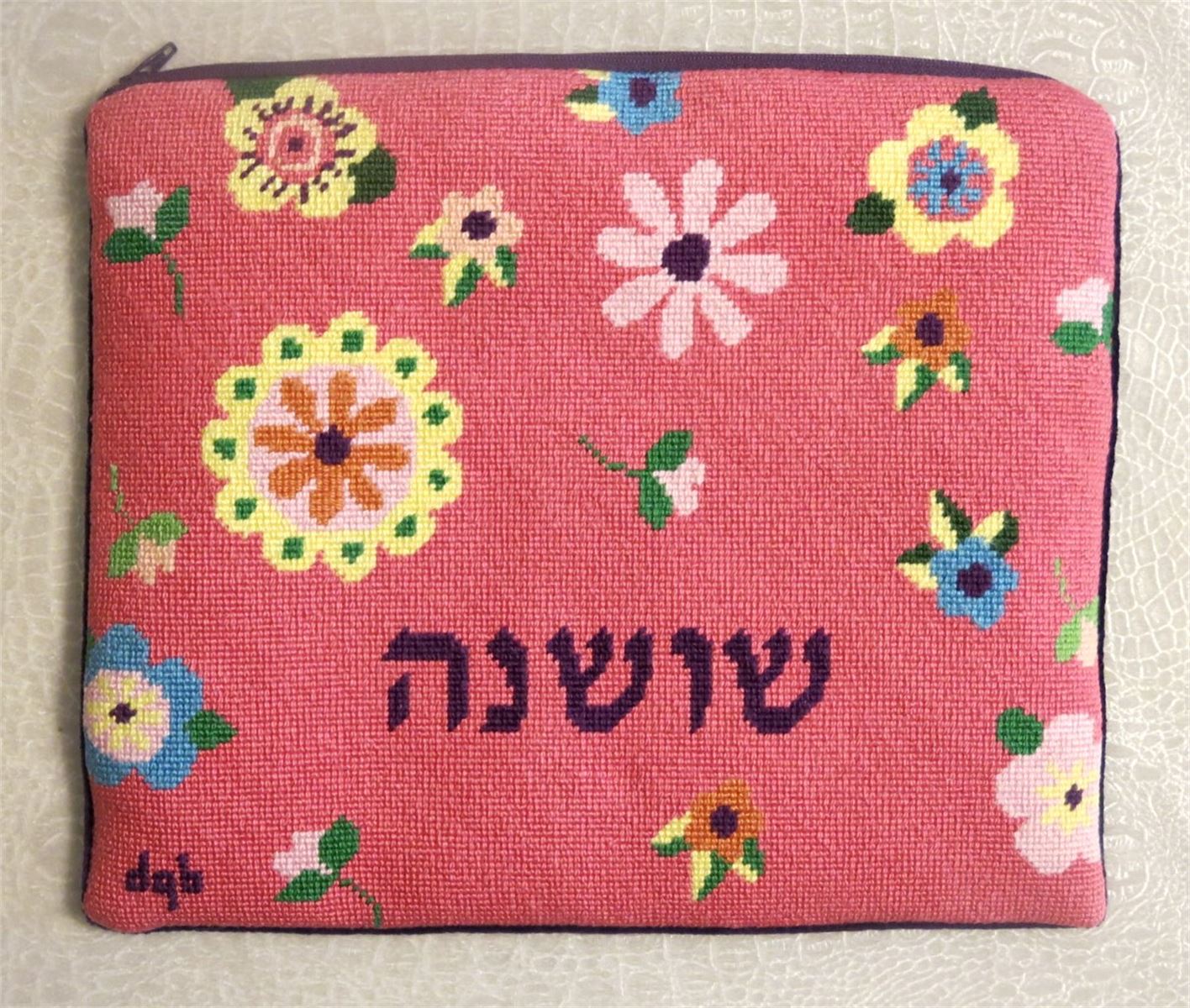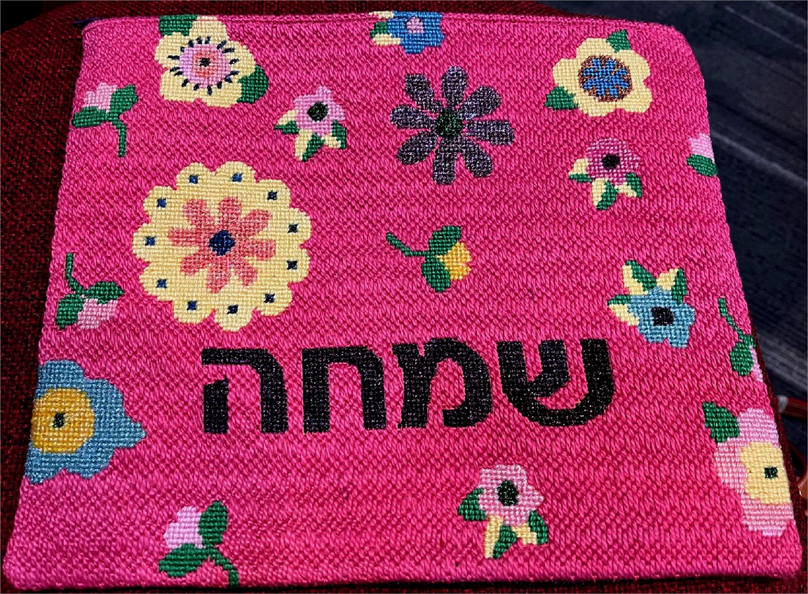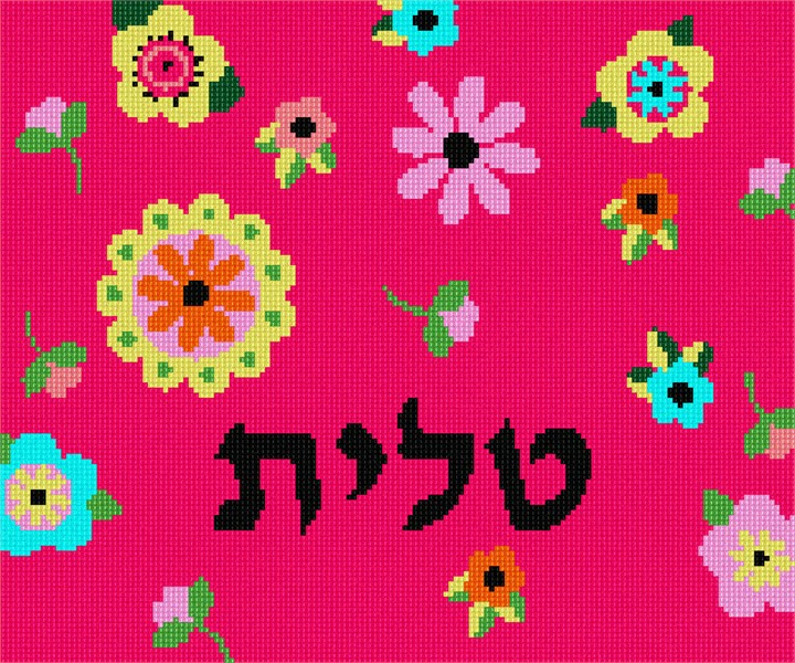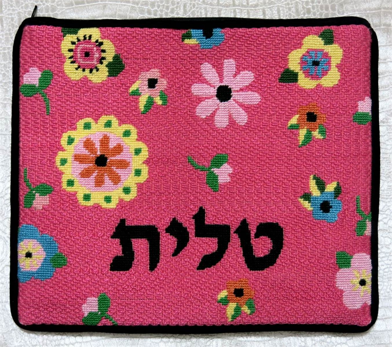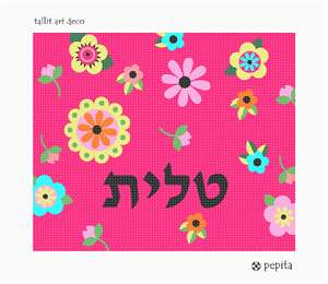 A tallit decorated in floral art deco. This is a modern, neat design. You stitch the front. After it is completely stitched, it is sent to a professional finisher who adds a lining, back, and matching zipper.There is a matching yarmulka available for this design.