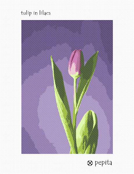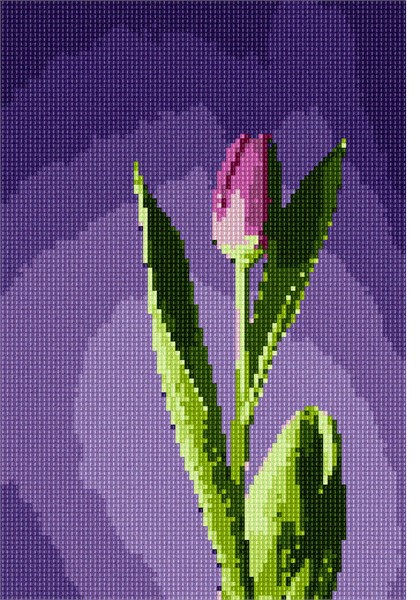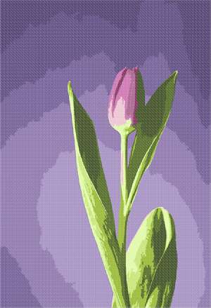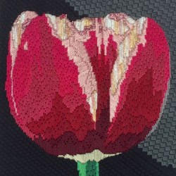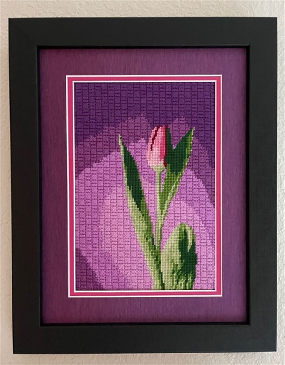 A tulip emerges. This canvas is so pretty. Both the background and the actual tulip complement each other perfectly. This is an excellent beginner floral canvas. Buy it as a kit or just the canvas. Real live tulips bloom once a year. Tulip needlepoints can be enjoyed throughout the year. Red tulips are most strongly associated with true love, while purple symbolizes royalty. The meaning of yellow tulips has evolved somewhat, from once representing hopeless love to now being a common expression for cheerful thoughts and sunshine.