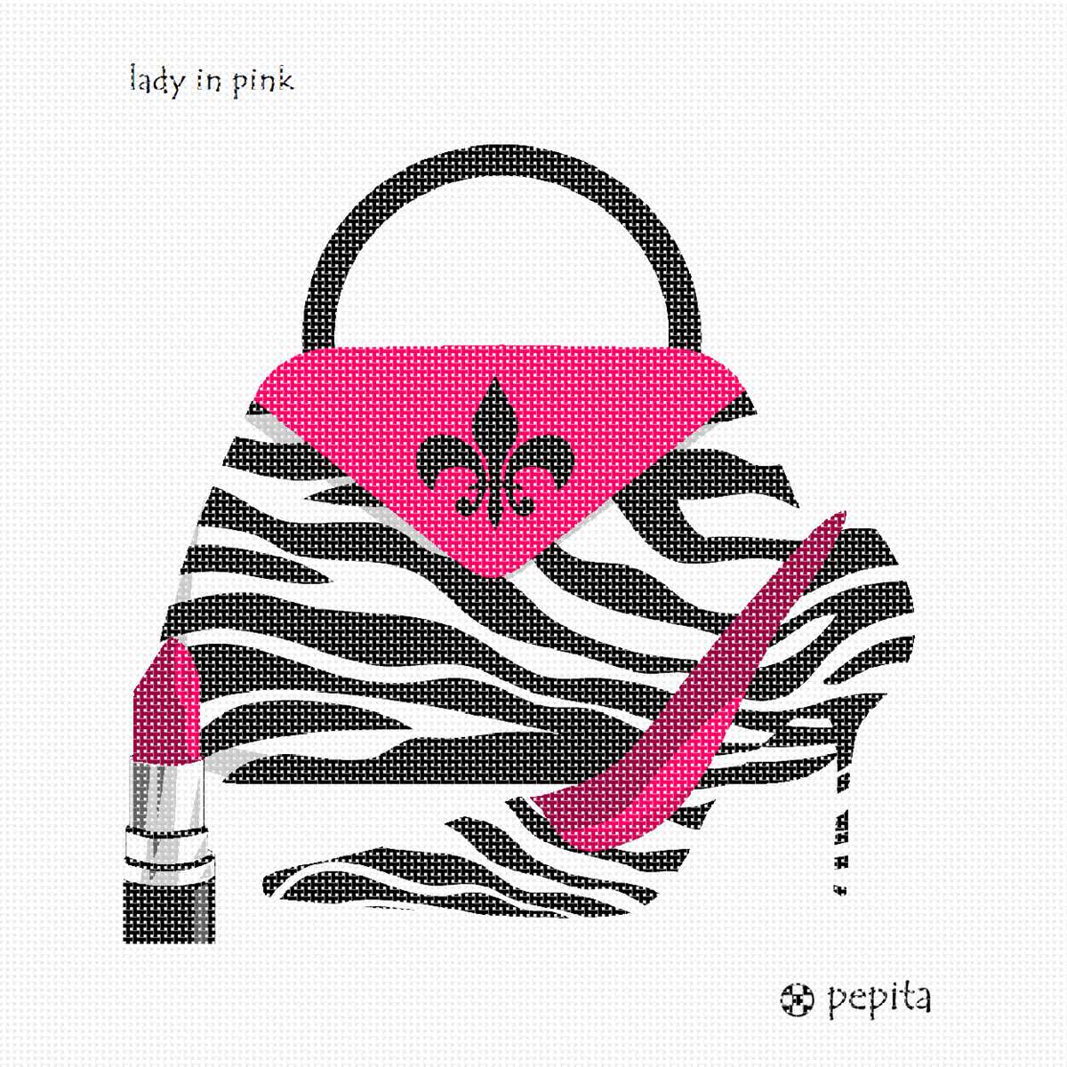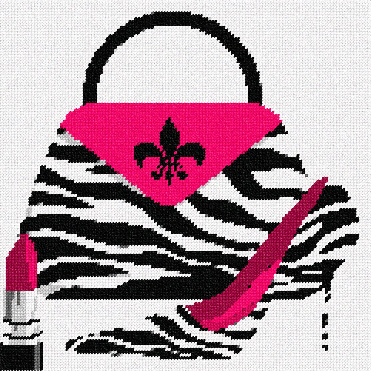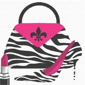 It's a purse, high heel shoe, and lipstick zebra ensemble. Animal print accentuates the fuchsia. Fleur de lis too. For that special woman in your life. This design is easy to stitch even for a beginner. It stitches up beautifully with just the right amount of contrast.