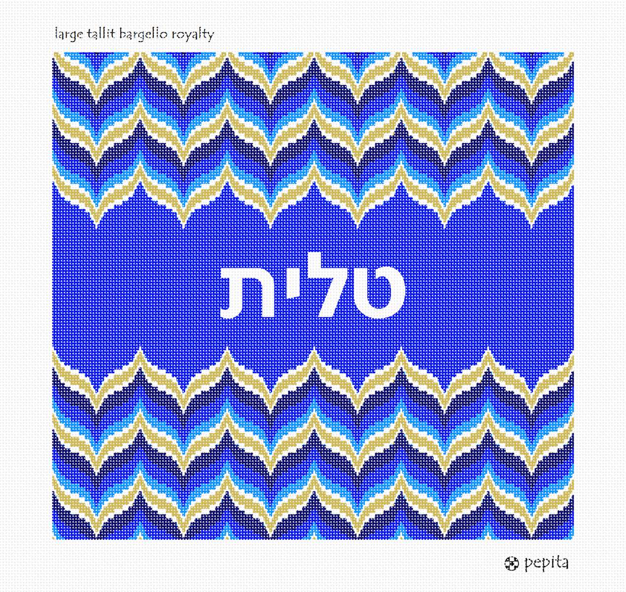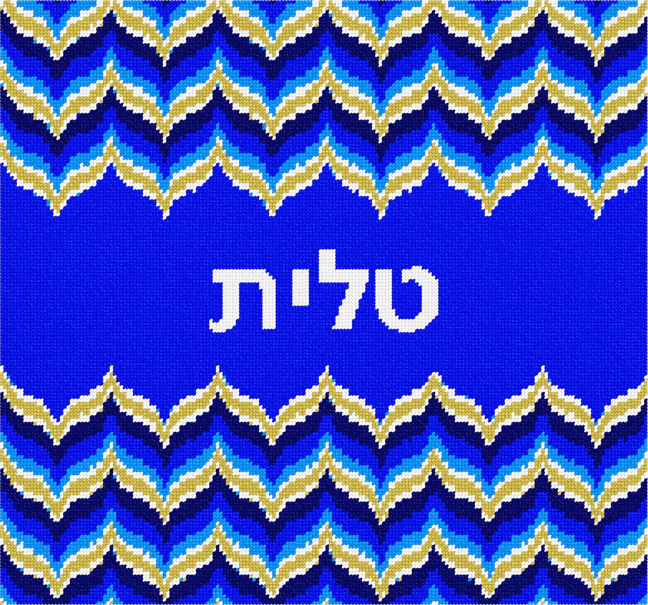 Tallit or koracha in bargello in colors of royalty. Bargello is a type of needlepoint embroidery consisting of upright flat stitches laid in a mathematical pattern to create motifs. The name originates from a series of chairs found in the Bargello palace in Florence, which have a "flame stitch" pattern. Traditionally, Bargello was stitched in wool on canvas. Embroidery done this way is remarkably durable. It is well suited for use on pillows, upholstery and even carpets, but not for clothing. In most traditional pieces, all stitches are vertical with stitches going over two or more threads.