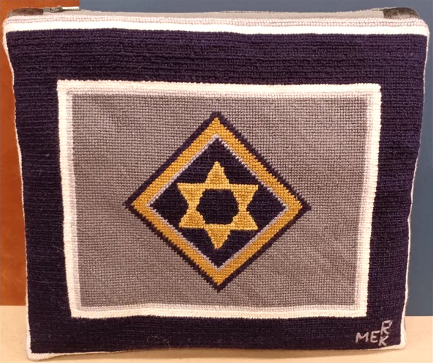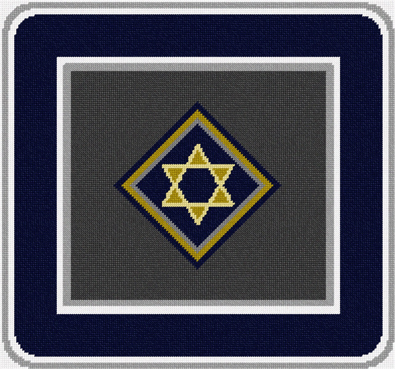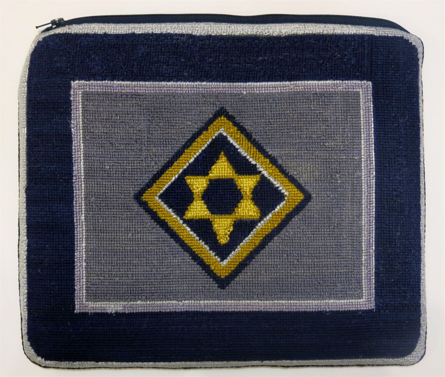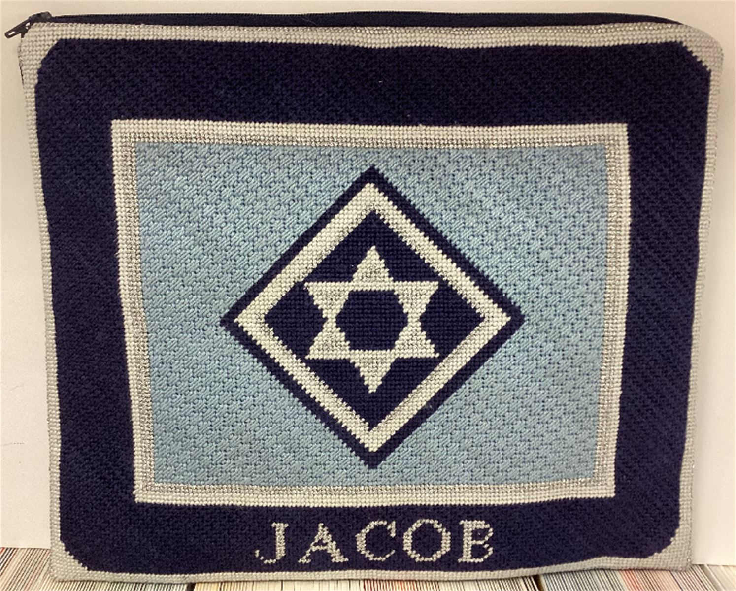 Neat concentric polygons with Star of David in the center. Tallit bag design using interlocking rectangles and diamonds surrounding a Star of David. The Star of David or Magen David (literally, Shield of David), as it is referred to in Hebrew, is the most common symbol for expressing Jewish identity today. The Hebrew name for the symbol – a hexagram formed by two overlapping triangles, one pointed upward and the other downward – comes from its supposed resemblance to King David’s shield. However, use of the Star of David as a Jewish symbol only became widespread in 17th-century Europe, when it was used displayed on synagogues to identify them as Jewish places of worship. You stitch the front. After it is completely stitched, it is sent to a professional finisher who adds a lining, back, and matching zipper. See coordinating tefillin bag design.