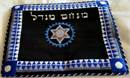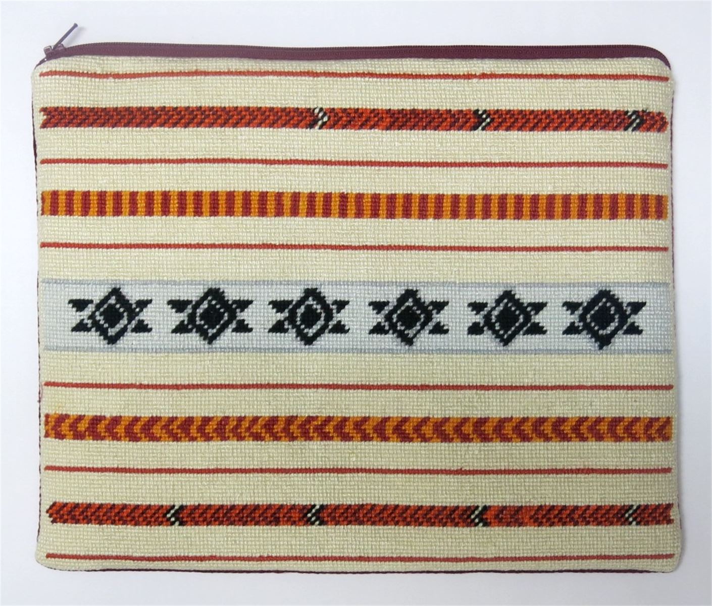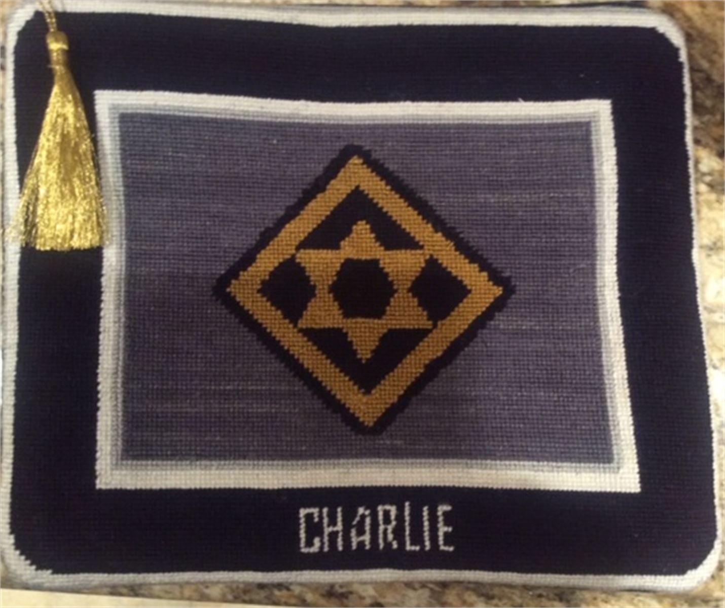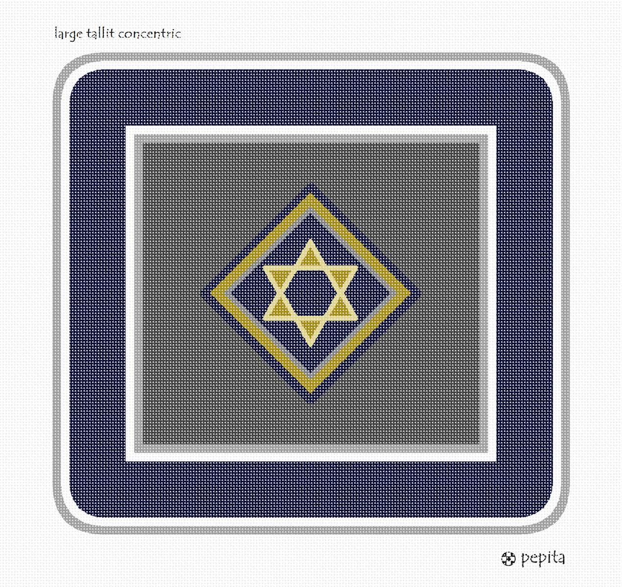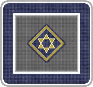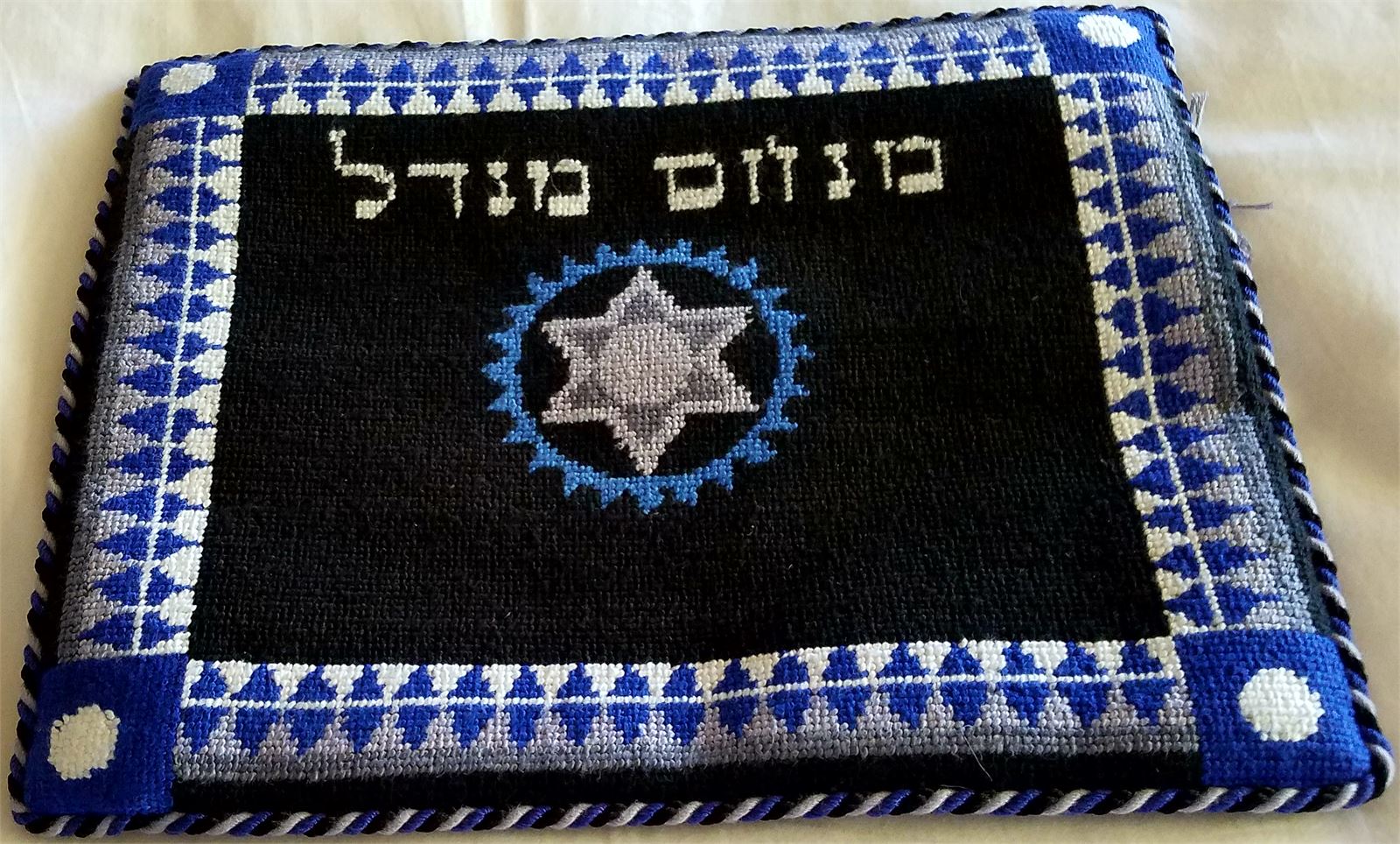 Neat concentric polygons with Star of David in the center. Tallit bag design using interlocking rectangles and diamonds surrounding a Star of David. The Star of David or Magen David (literally, Shield of David), as it is referred to in Hebrew, is the most common symbol for expressing Jewish identity today. The Hebrew name for the symbol – a hexagram formed by two overlapping triangles, one pointed upward and the other downward – comes from its supposed resemblance to King David’s shield. However, use of the Star of David as a Jewish symbol only became widespread in 17th-century Europe, when it was used displayed on synagogues to identify them as Jewish places of worship. You stitch the front. After it is completely stitched, it is sent to a professional finisher who adds a lining, back, and matching zipper. See coordinating tefillin bag design.