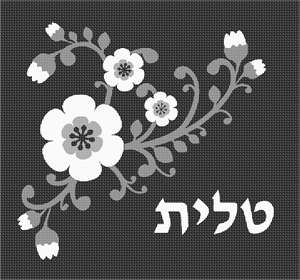 Tallit designed with a floral motif in shades of blue and pink against a solid navy background. This is a modern, neat design. You stitch the front. After it is completely stitched, it is sent to a professional finisher who adds a lining, back, and matching zipper. There is a matching siddur cover available for this design.