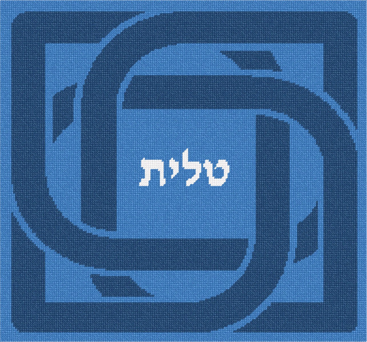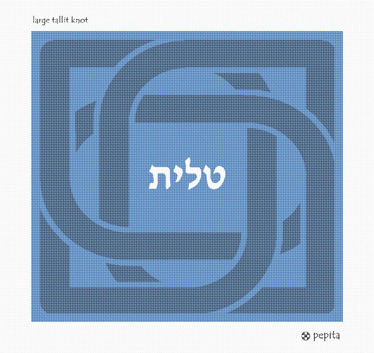 Nice design featuring a square knot shape. Geometrics are very vogue in tallit and tefillin bags today. You stitch the front. After it is completely stitched, it is sent to a professional finisher who adds a lining, back, and matching zipper. See coordinating tefillin bag.