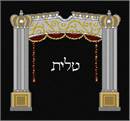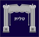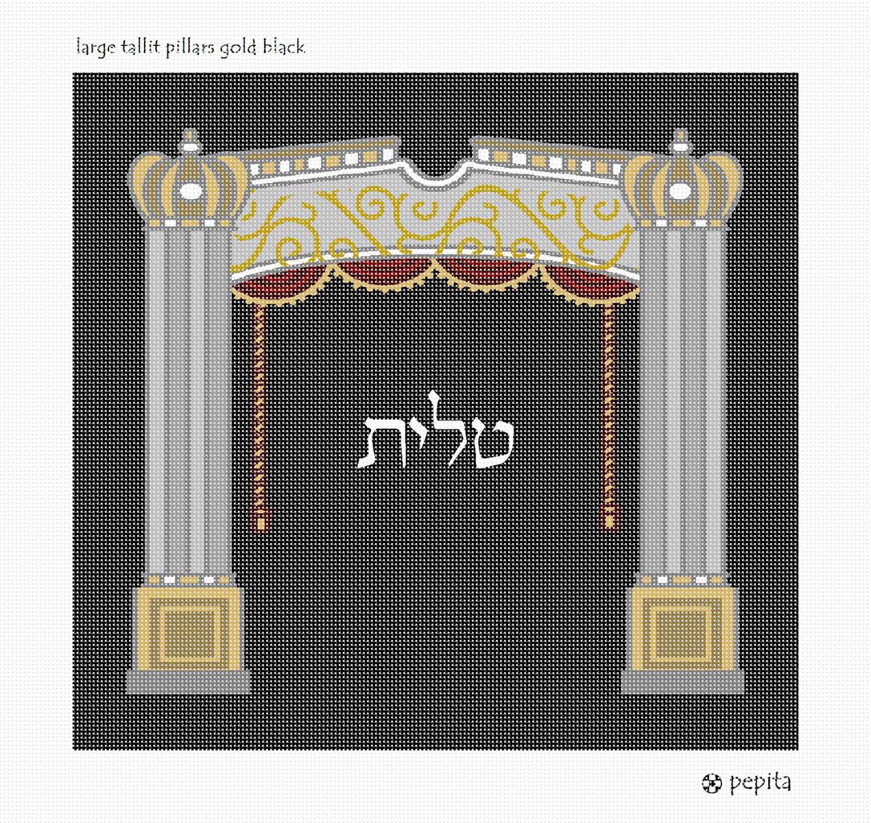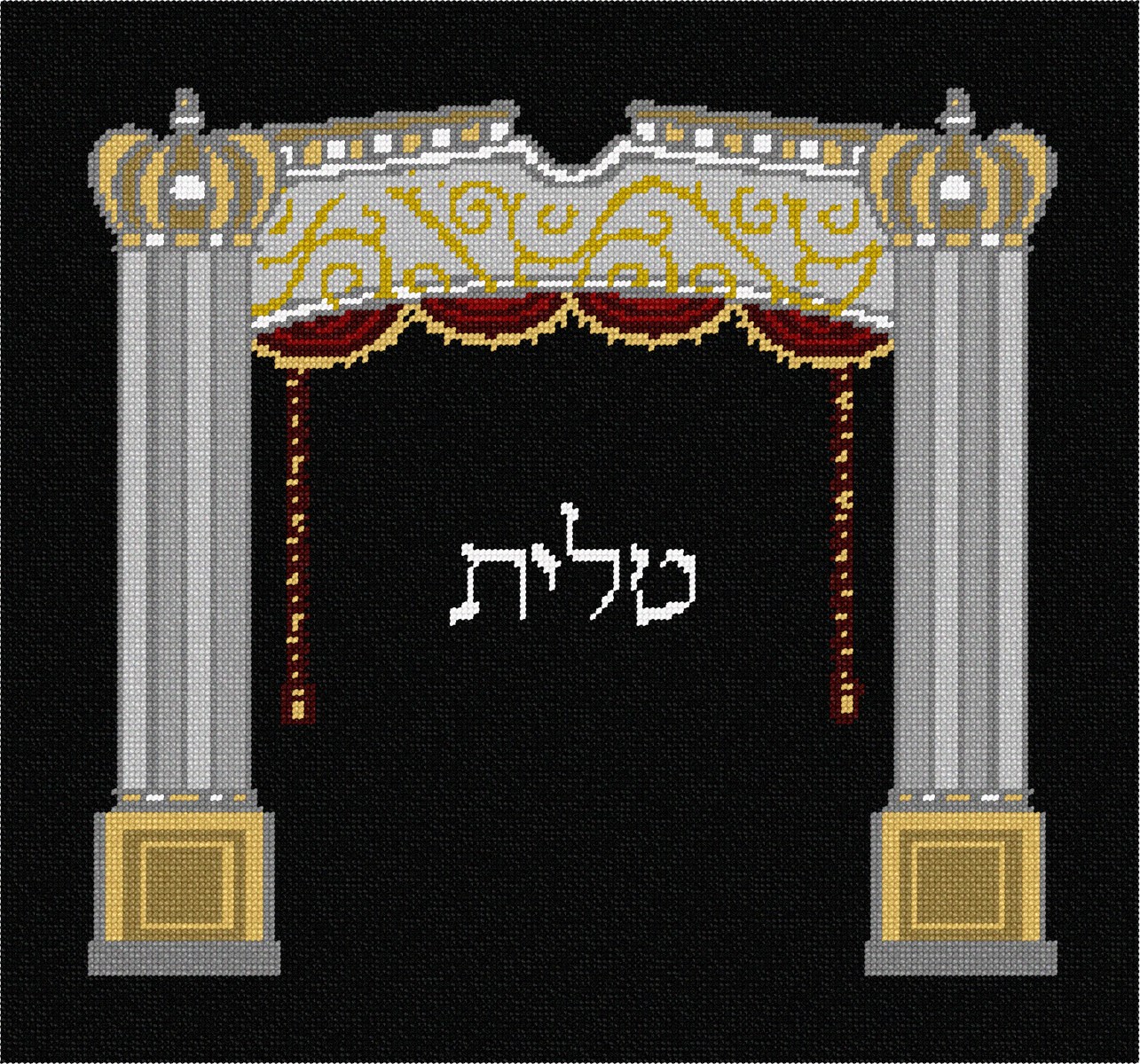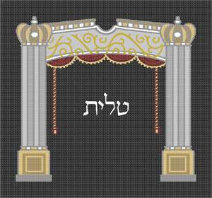 This is a classic design found on many tallit bags. Pillars, an arch, drapes, and a pair of bell pulls, all stitched in silver thread against a deep navy blue background. The name is in the center.