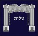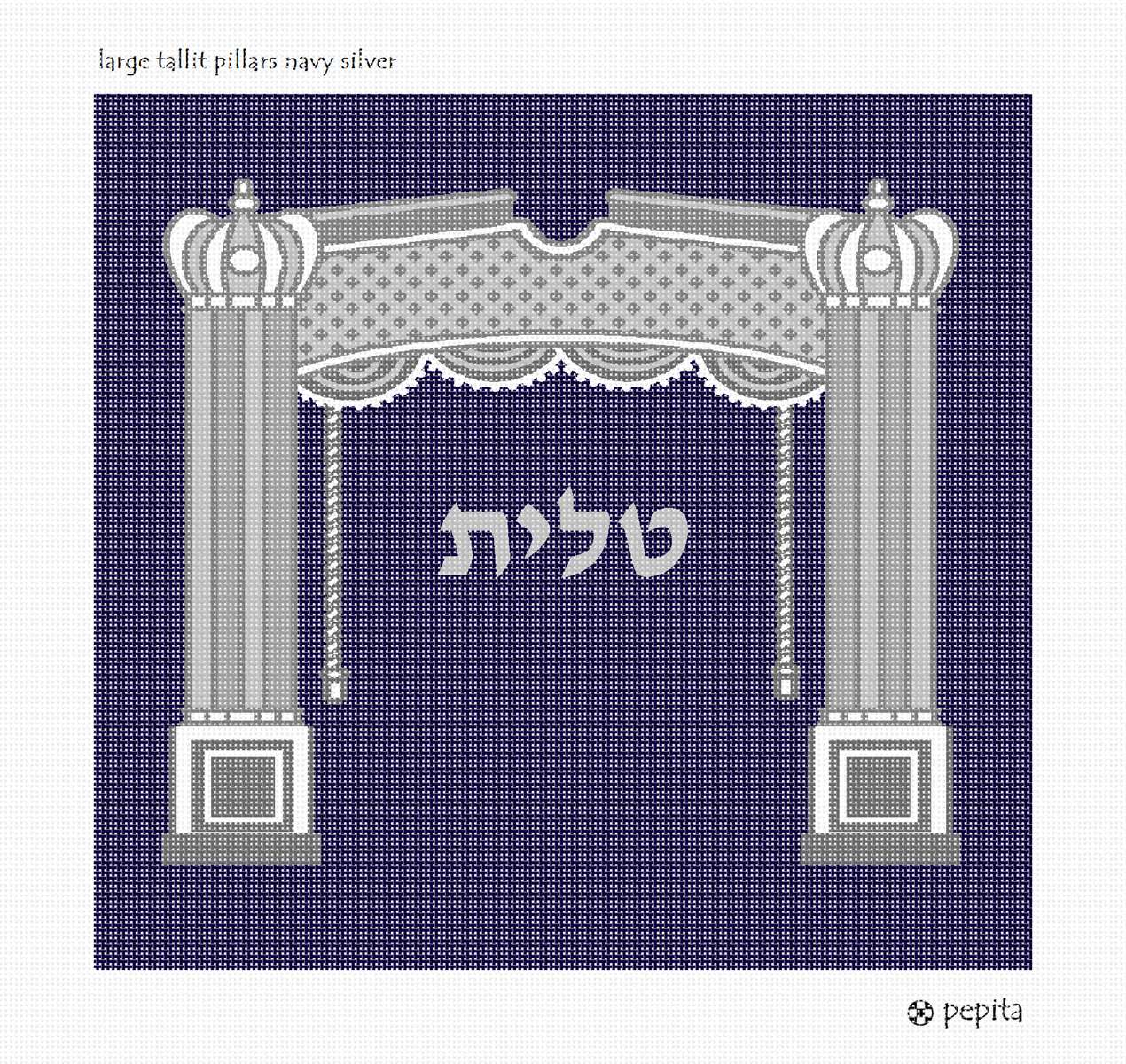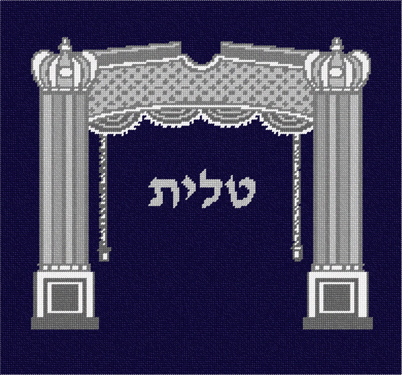 This is a classic design found on many tallit bags. Pillars, an arch, drapes, and a pair of bell pulls, all stitched in silver thread against a deep navy blue background. The name is in the center.