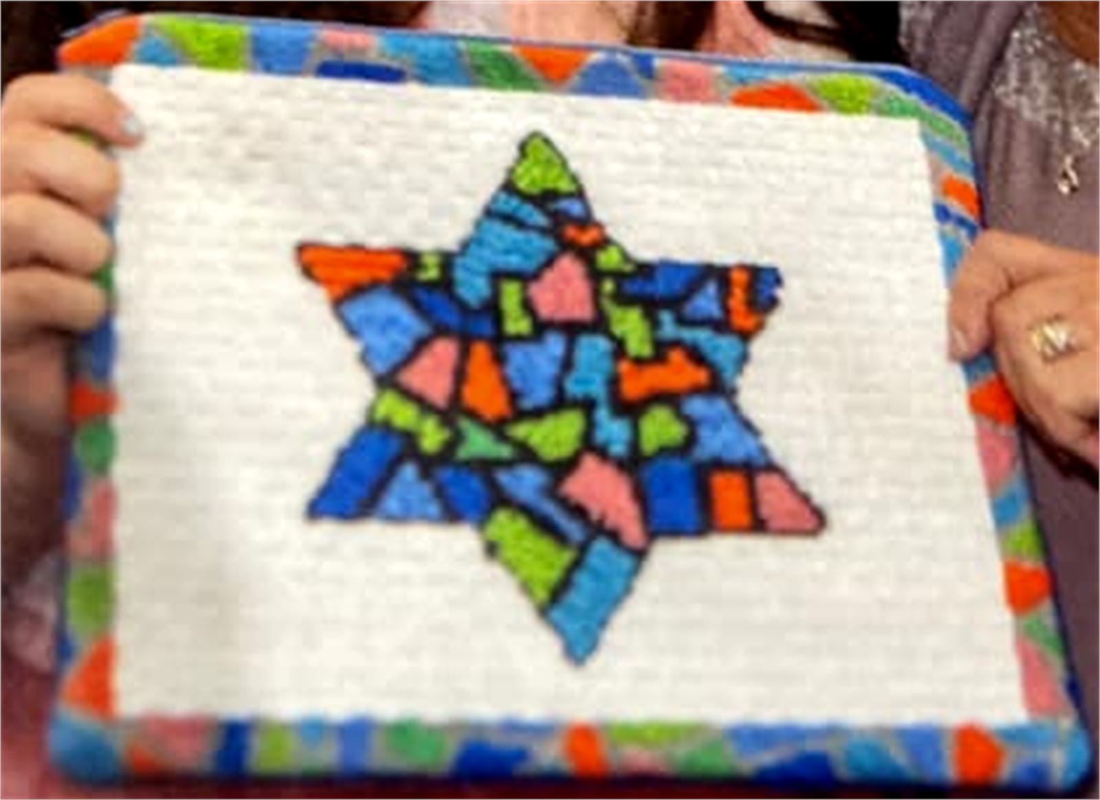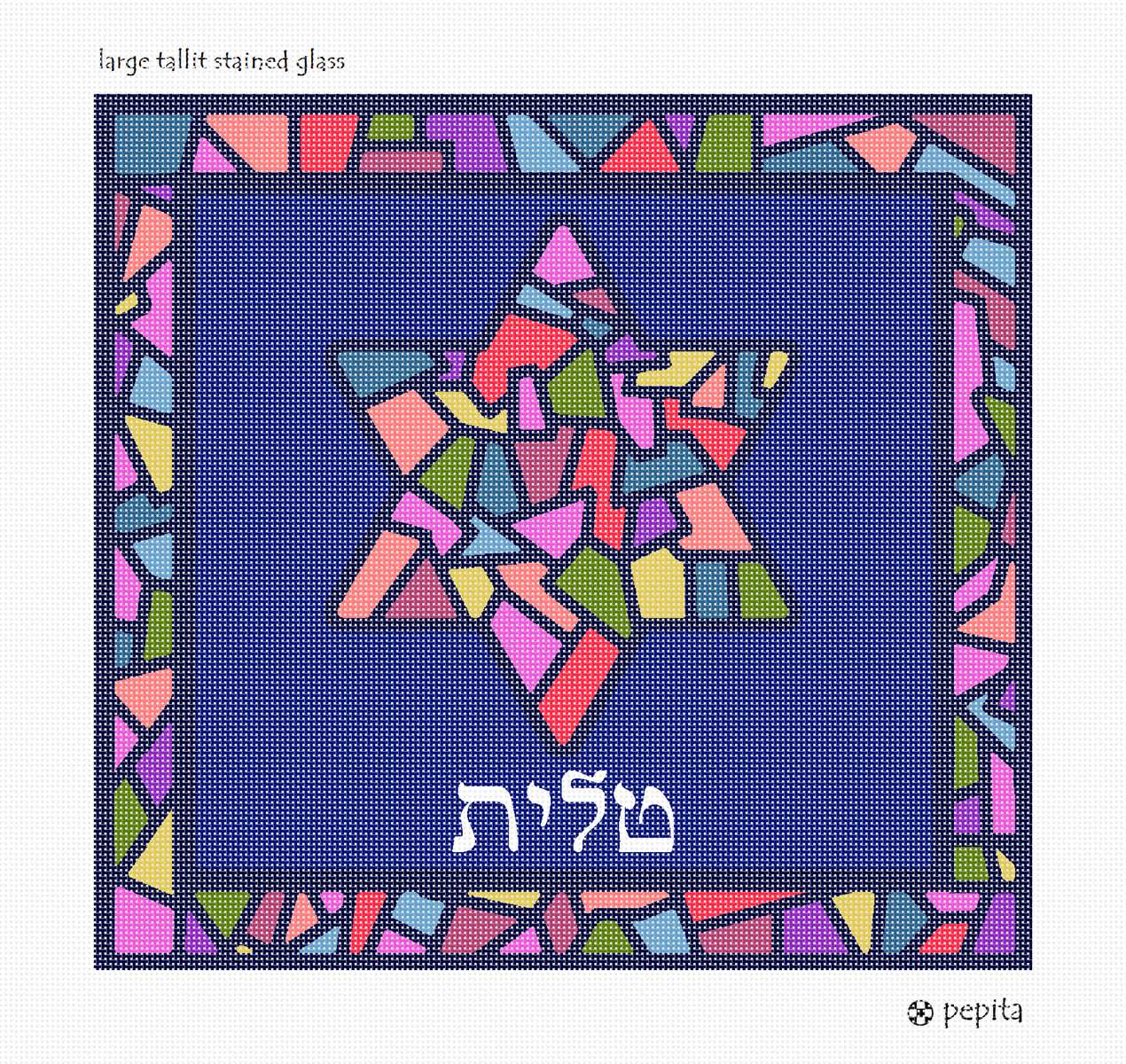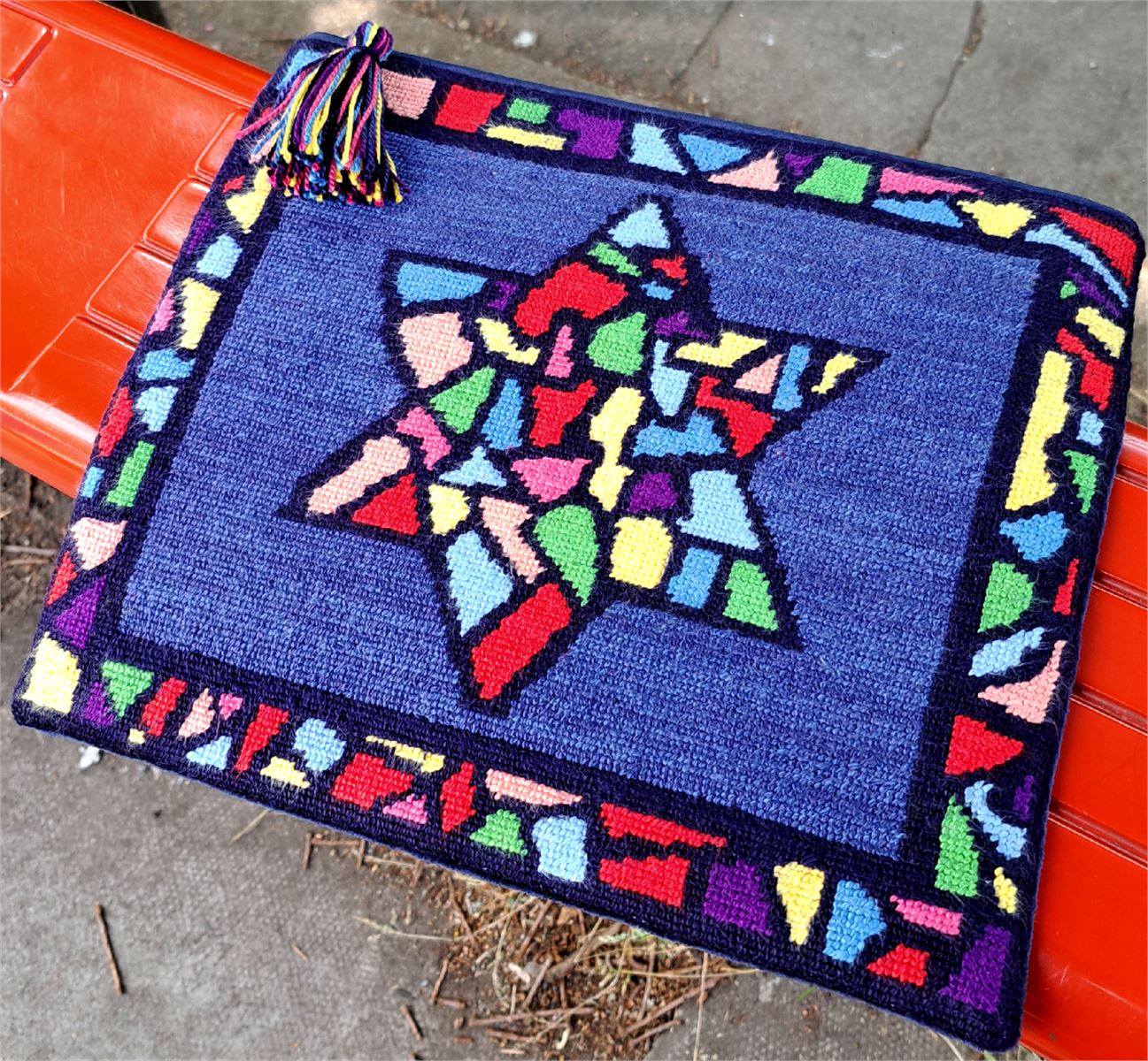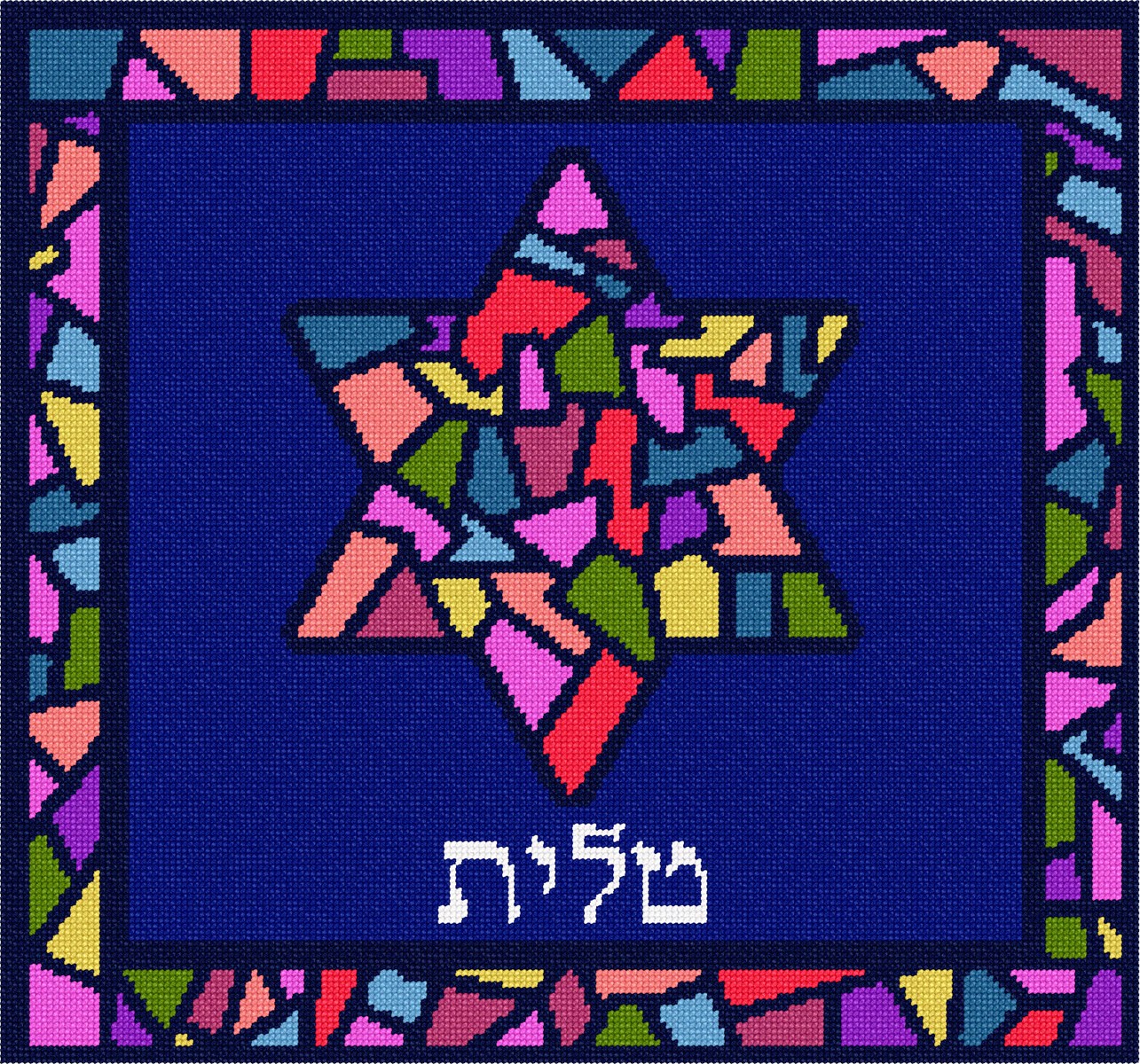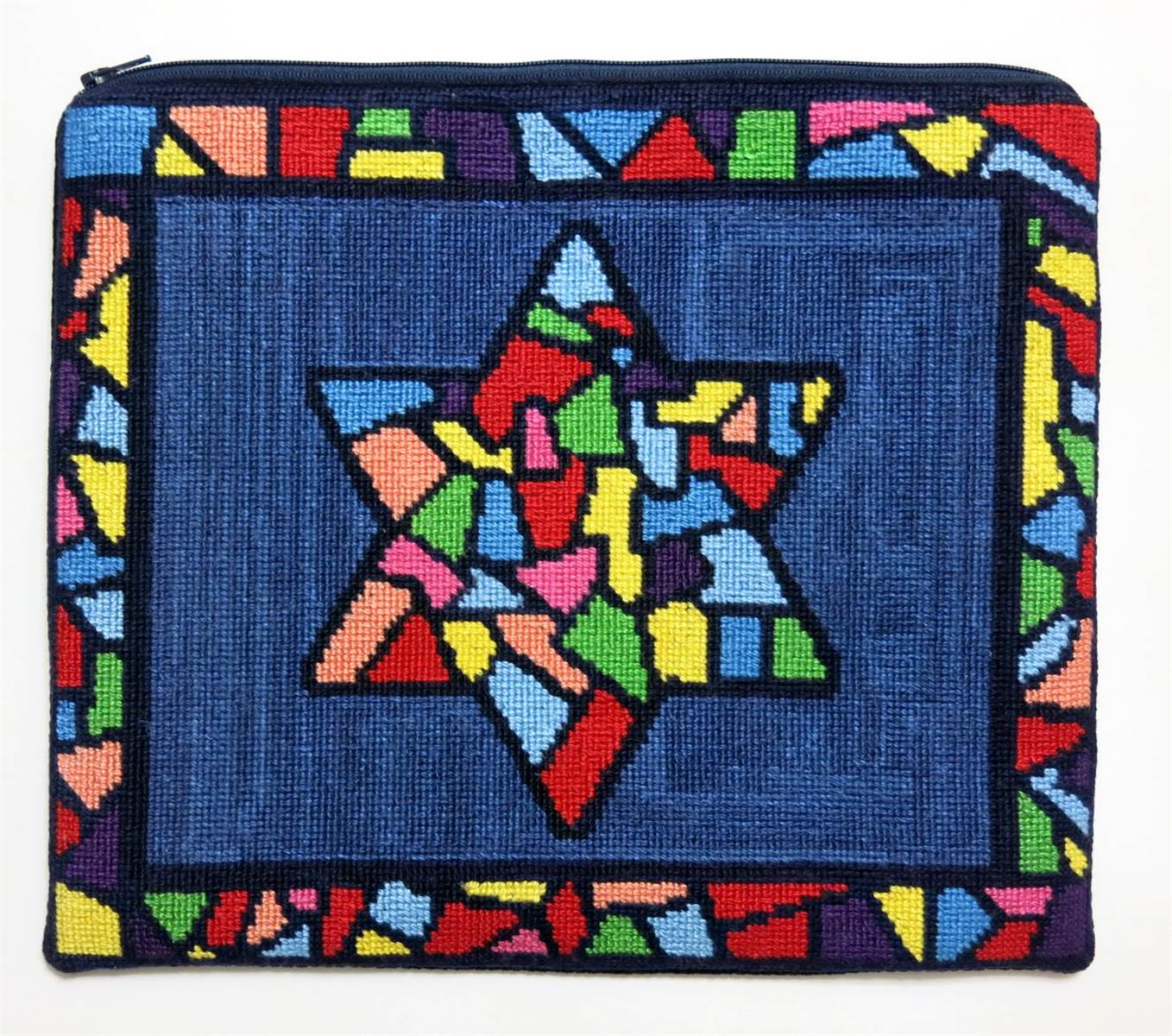 Tallit bag with a stained glass theme design. Stained glass design is very popular on many Judaica items. You stitch the front. After it is completely stitched, it is sent to a professional finisher who adds a lining, back, and matching zipper.