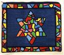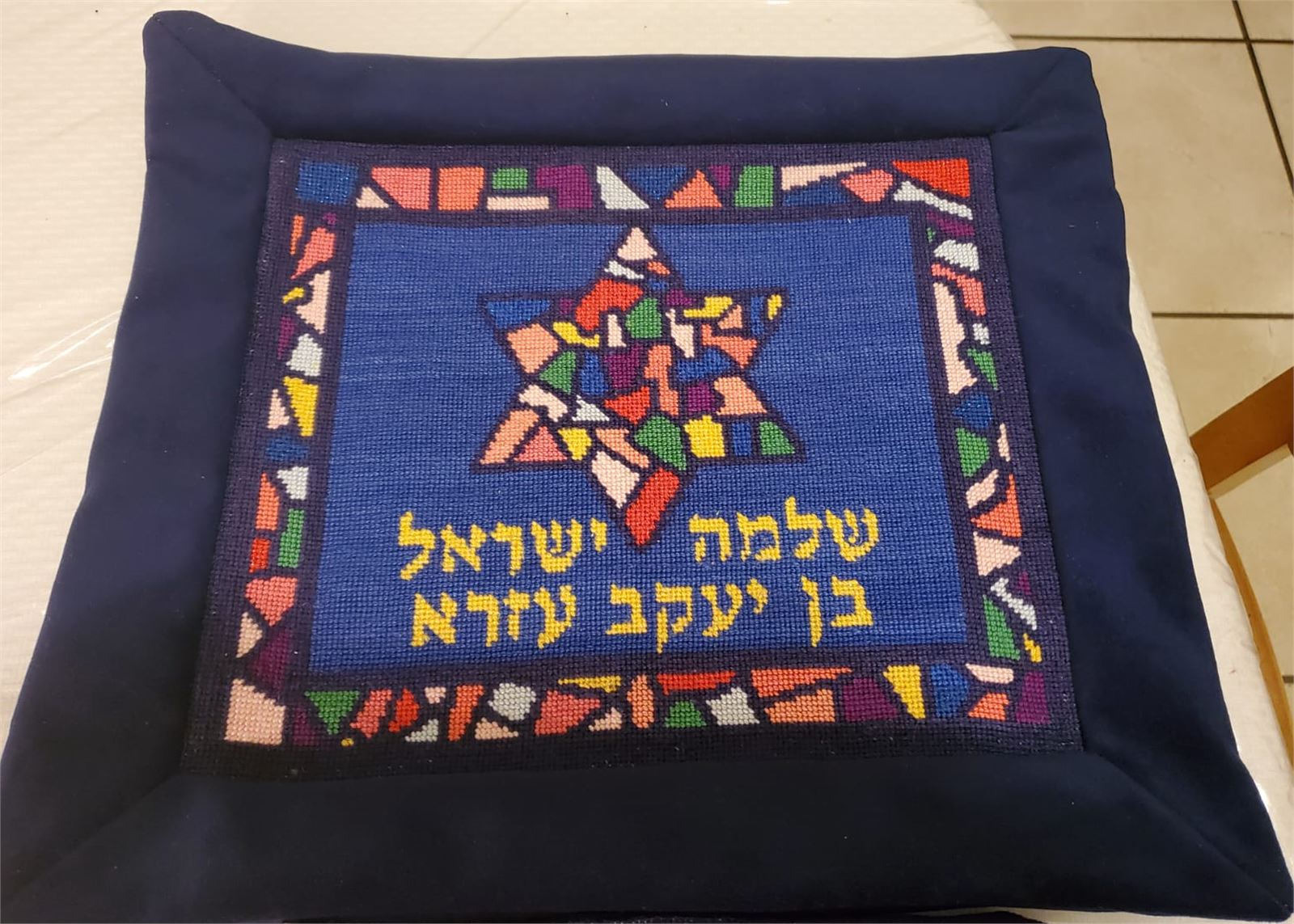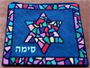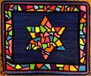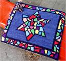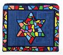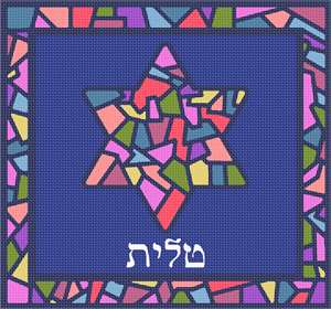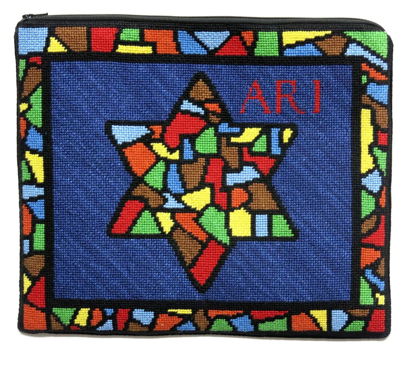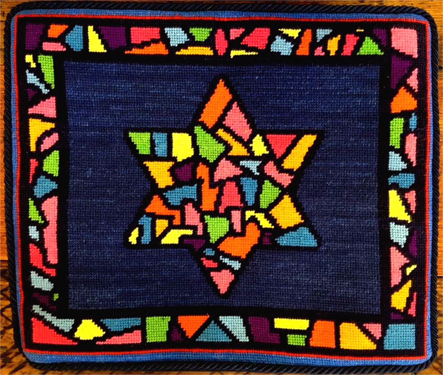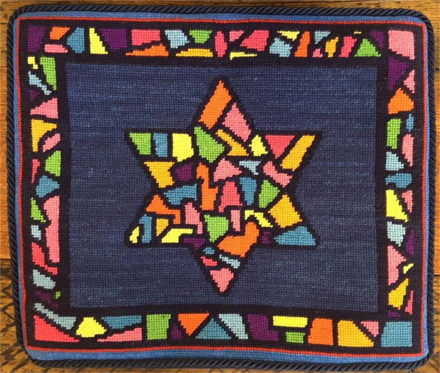 Tallit bag with a stained glass theme design. Stained glass design is very popular on many Judaica items. You stitch the front. After it is completely stitched, it is sent to a professional finisher who adds a lining, back, and matching zipper.