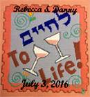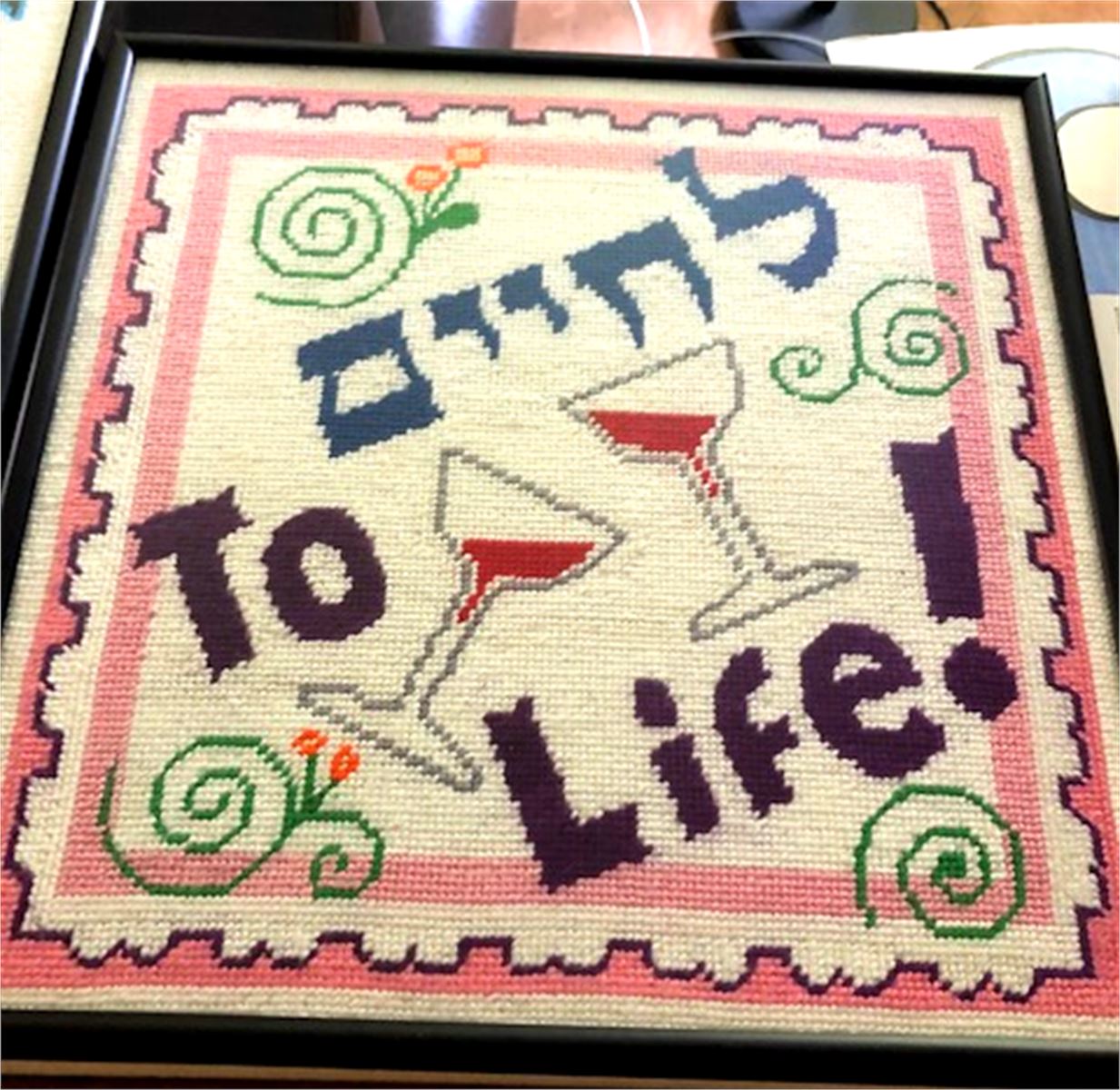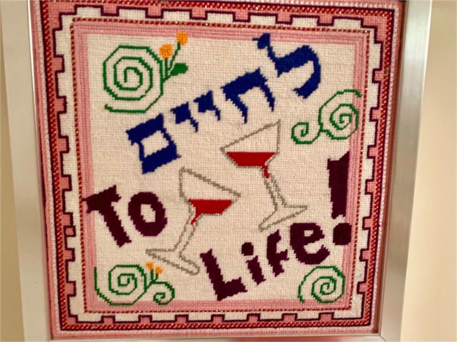Two wine glasses click together in a Jewish toast, "L'Chaim! To Life!"