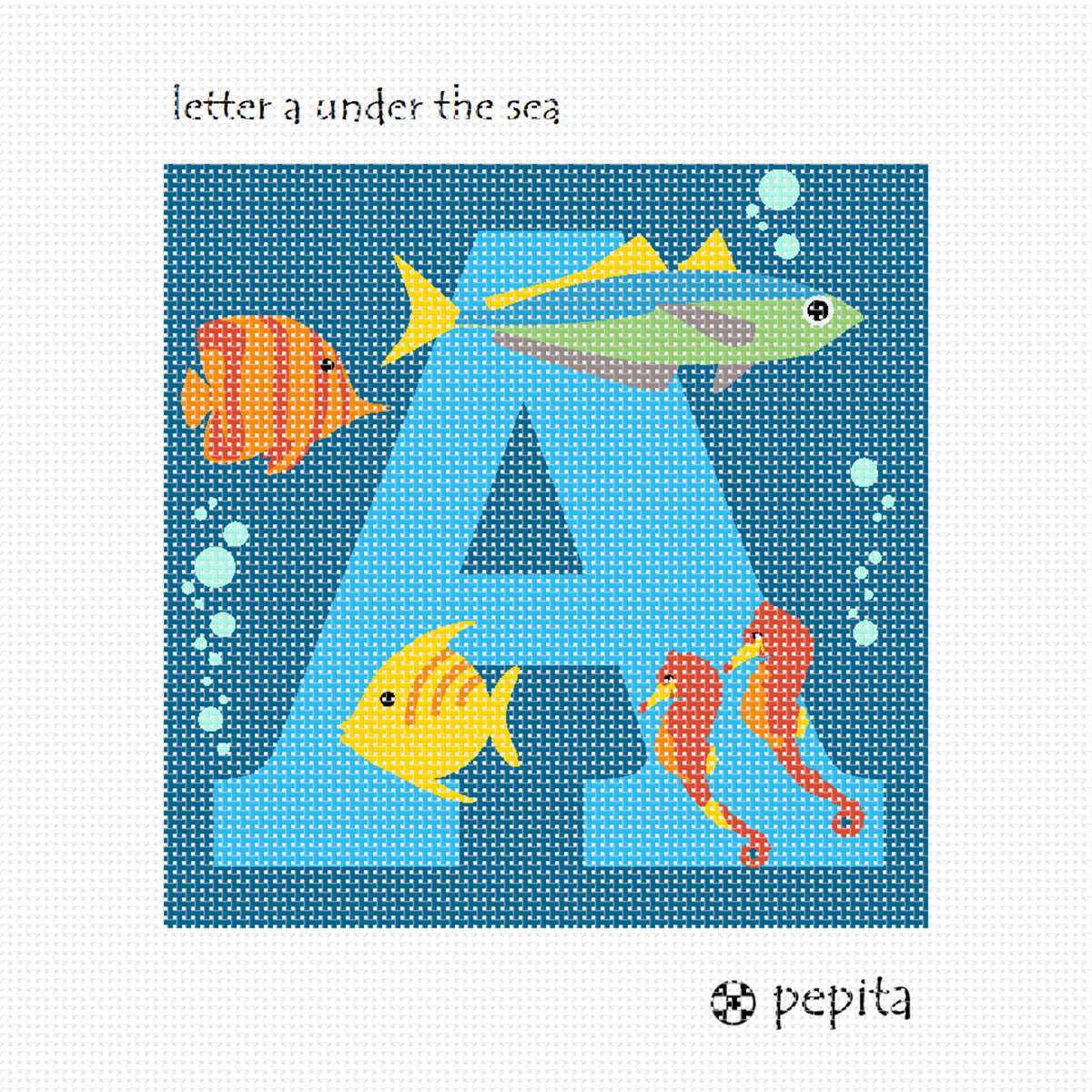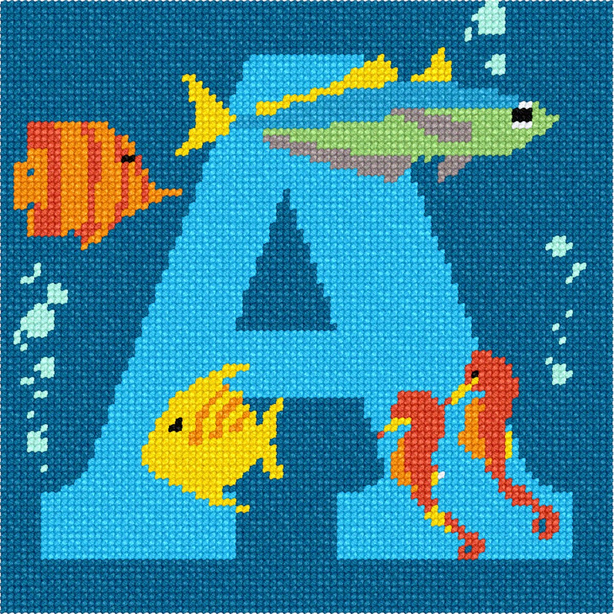 Many sea creatures call the ocean home. From giant whales to tiny tadpoles, marine life is active and fascinating for children and adults alike. All the animals interact and live together in the underwater ecosystem. Seahorses dance while schools of fish gracefully swim amongst the coral reefs. Stitch this letter A for your favorite budding marine biologist.