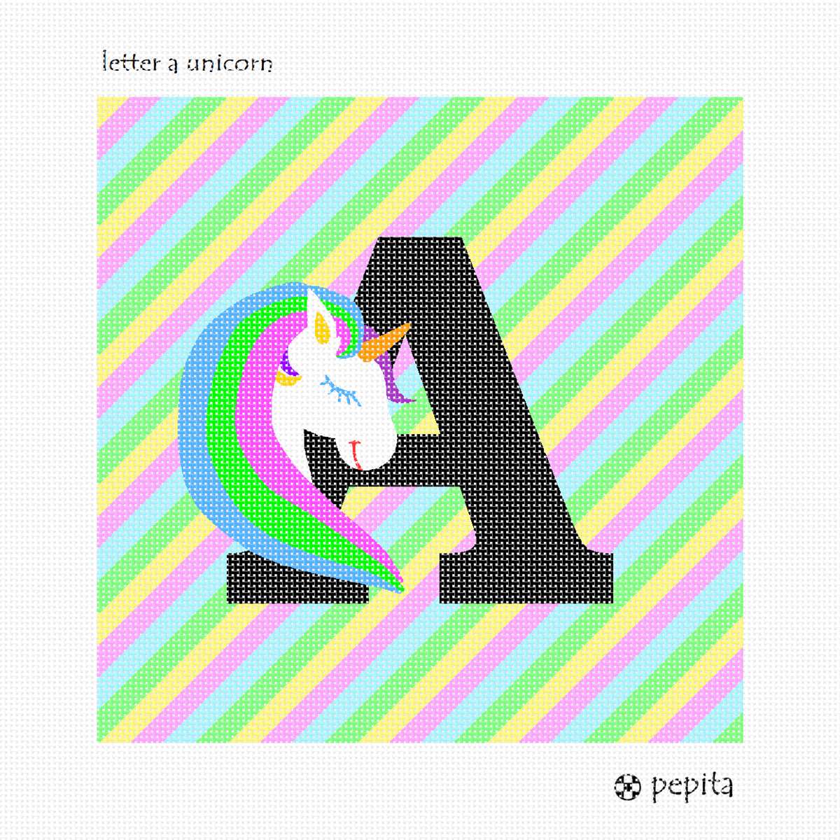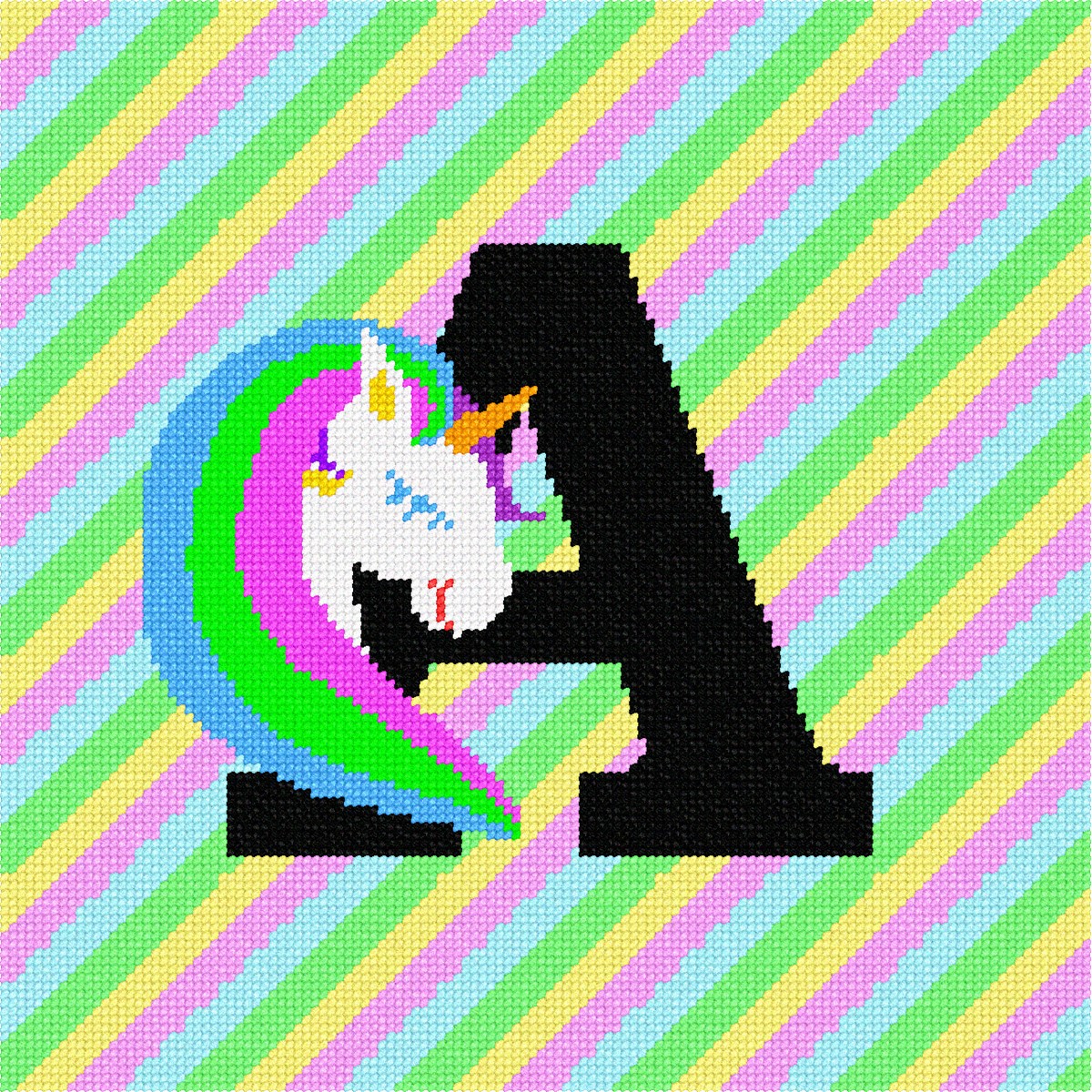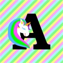 The capital letter A with a colorful and magical unicorn against a stripey background.