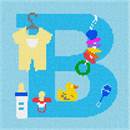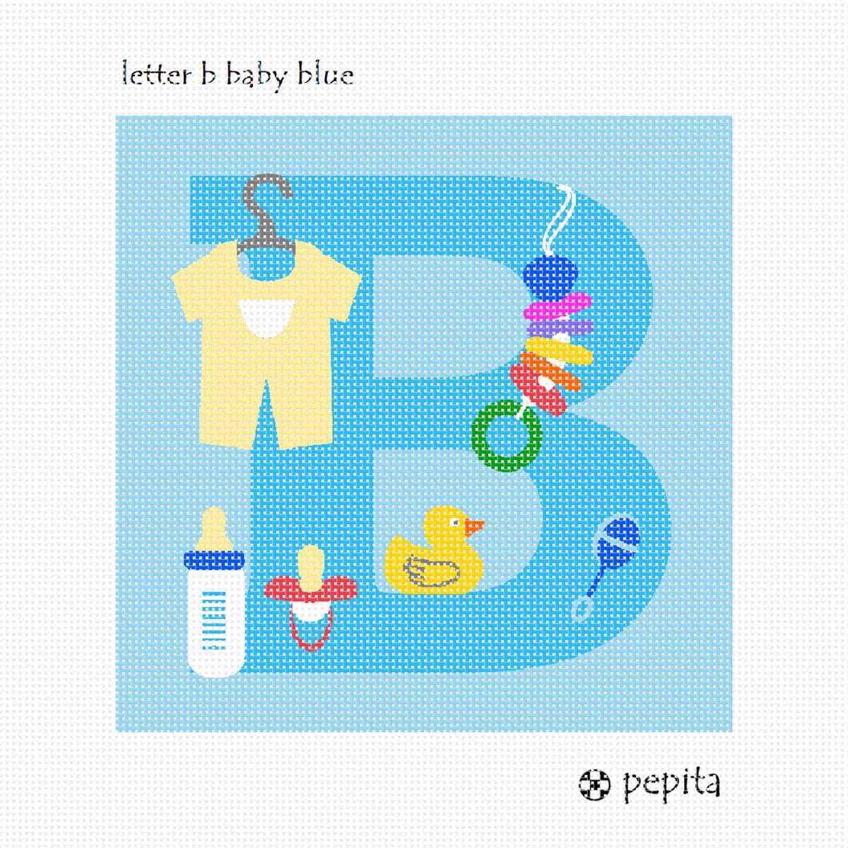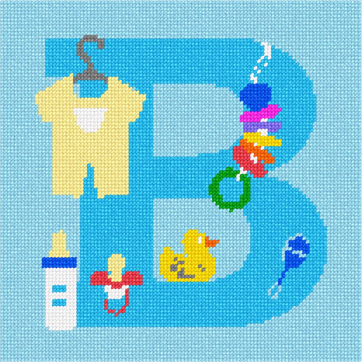Alphabet initial with a blue baby theme. A onesie on a hanger, a baby toy, bottle, pacifier, rattle, and rubber duckie decorate this letter B. Available in any letter of the ABC.