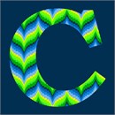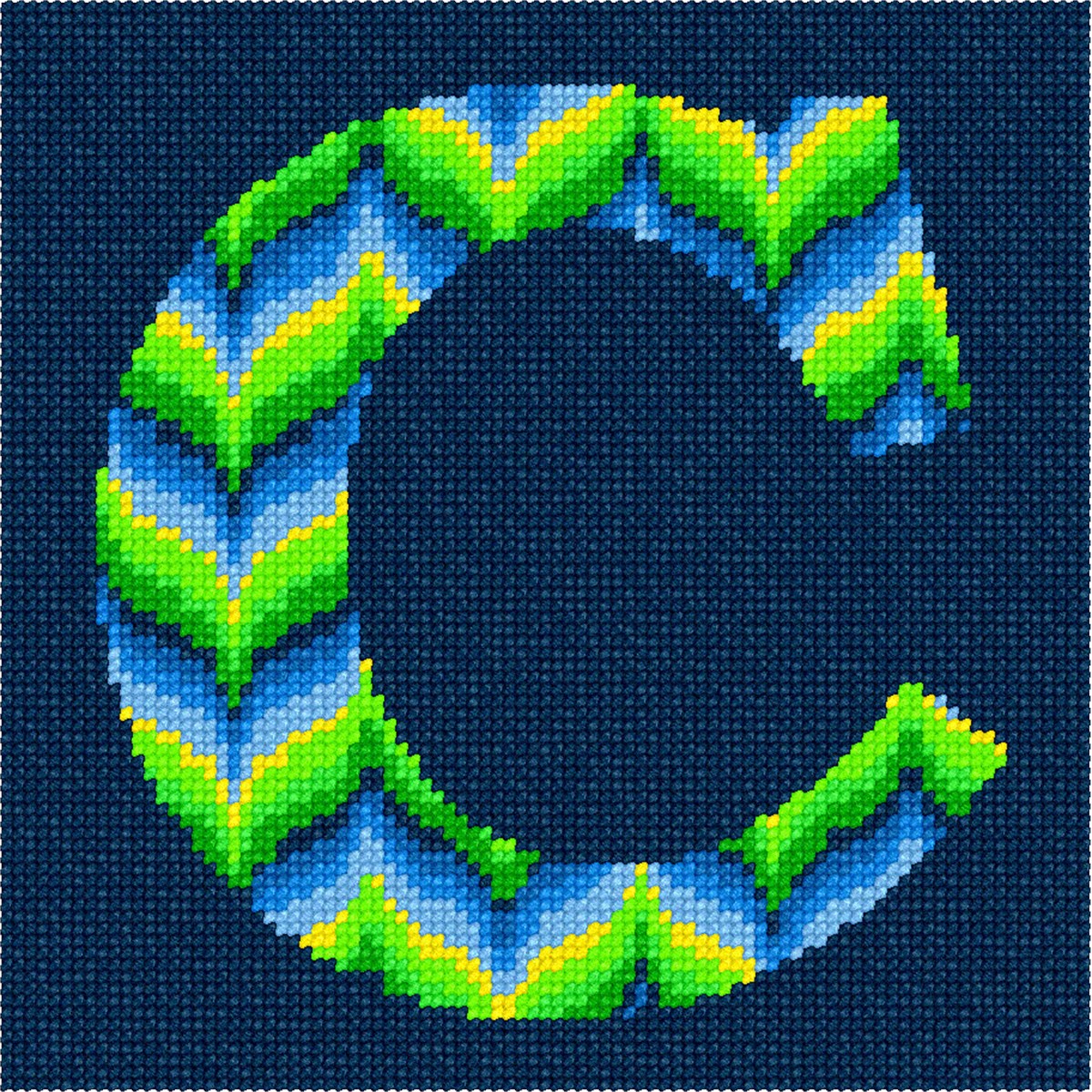Alphabet in Bargello. Bargello is a type of needlepoint embroidery consisting of upright flat stitches laid in a mathematical pattern to create motifs. The name originates from a series of chairs found in the Bargello palace in Florence, which have a "flame stitch" pattern. Traditionally, Bargello was stitched in wool on canvas. Embroidery done this way is remarkably durable. It is well suited for use on pillows, upholstery and even carpets, but not for clothing. In most traditional pieces, all stitches are vertical with stitches going over two or more threads.