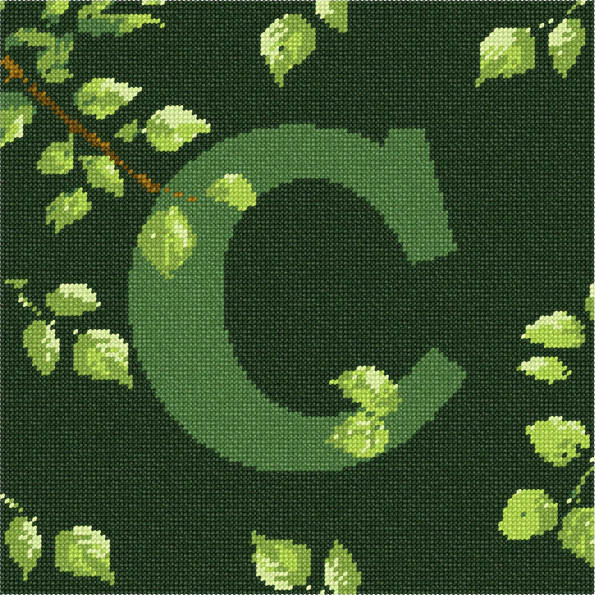 Alphabet letters surrounded by foliage. They are leaves and branches almost resembling ivy. The Letter C blends in perfectly with the green coloring. This is available in all letters of the alphabet. This would make a perfect pillow as a gift for anyone. This is a timeless design.