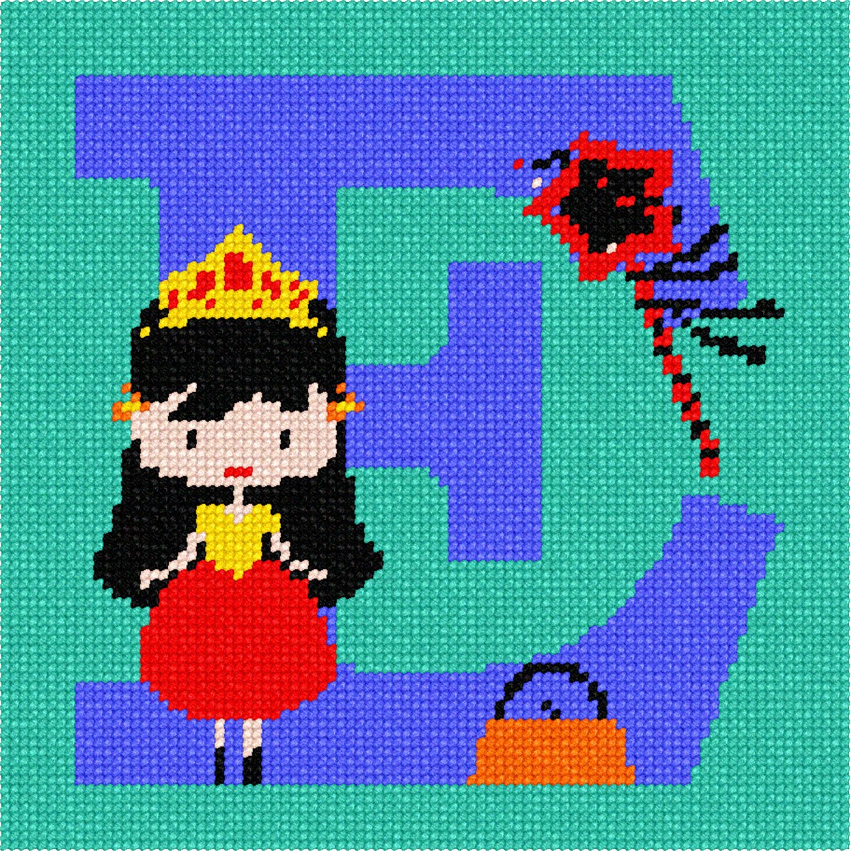 Girls are into princesses. This princess wears a beautiful pink crown. Her magic wand has magic dust stars fluttering about. Her purse is ready for a day out or for a night of dancing at the ball. Stitch an initial alphabet princess for the special princess in your life.