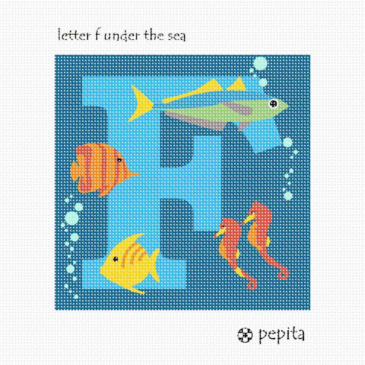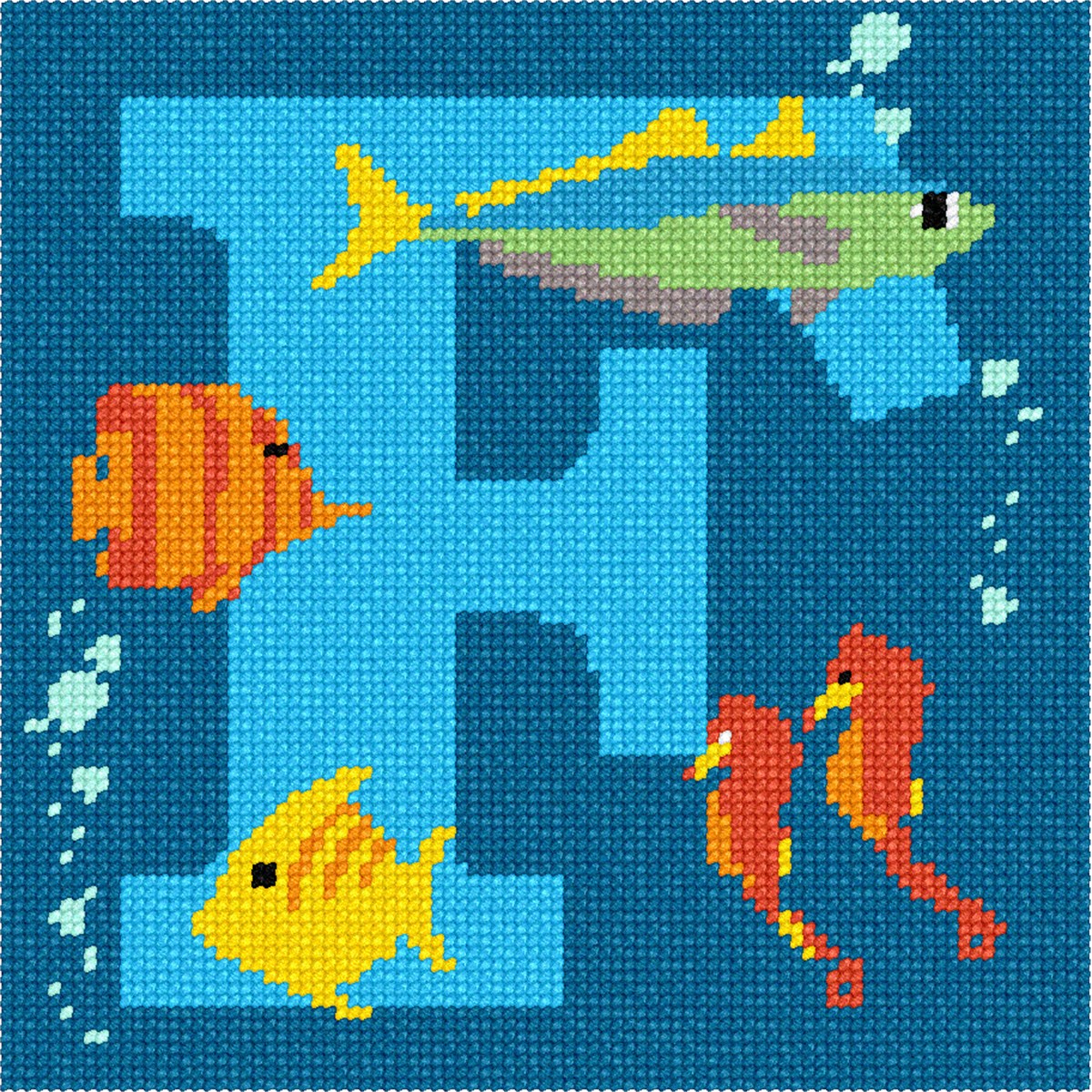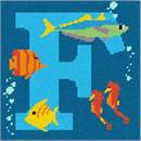 Many sea creatures call the ocean home. From giant whales to tiny tadpoles, marine life is active and fascinating for children and adults alike. All the animals interact and live together in the underwater ecosystem. Seahorses dance while schools of fish gracefully swim amongst the coral reefs. Stitch this letter F for your favorite budding marine biologist.