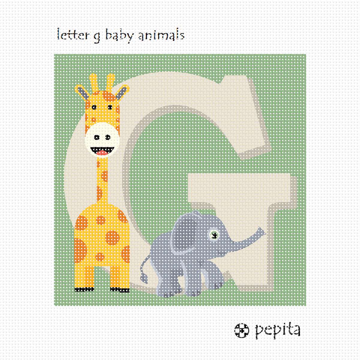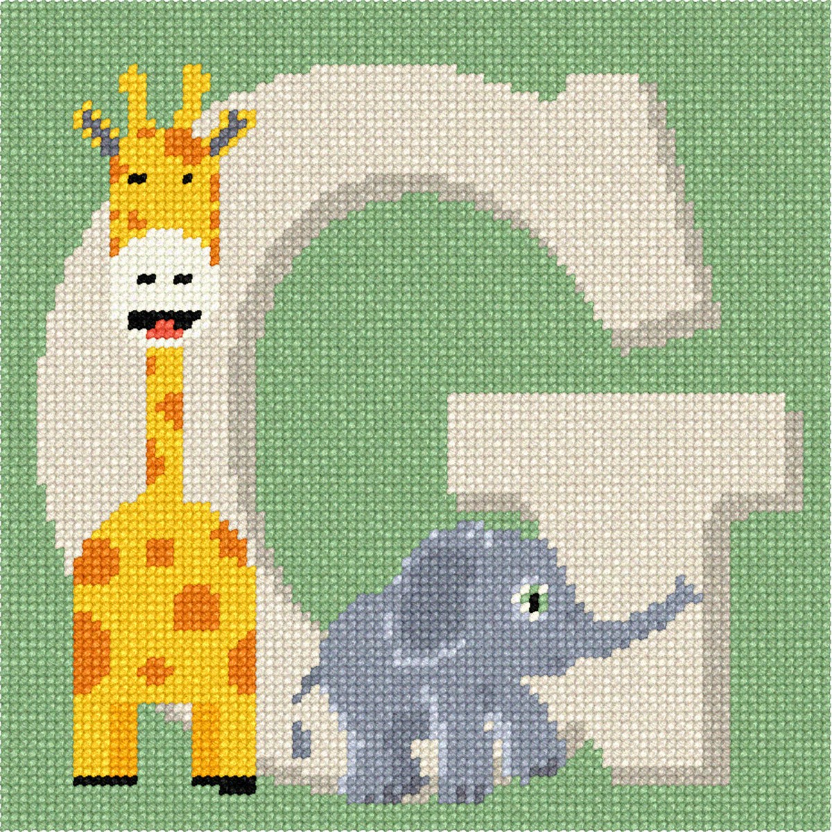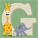 Alphabet initials to match safari theme nursery decor. This unisex design is adorable for any baby room. The tall giraffe and happy elephant will delight the stitcher as well as the baby. See coordinating lavender design.