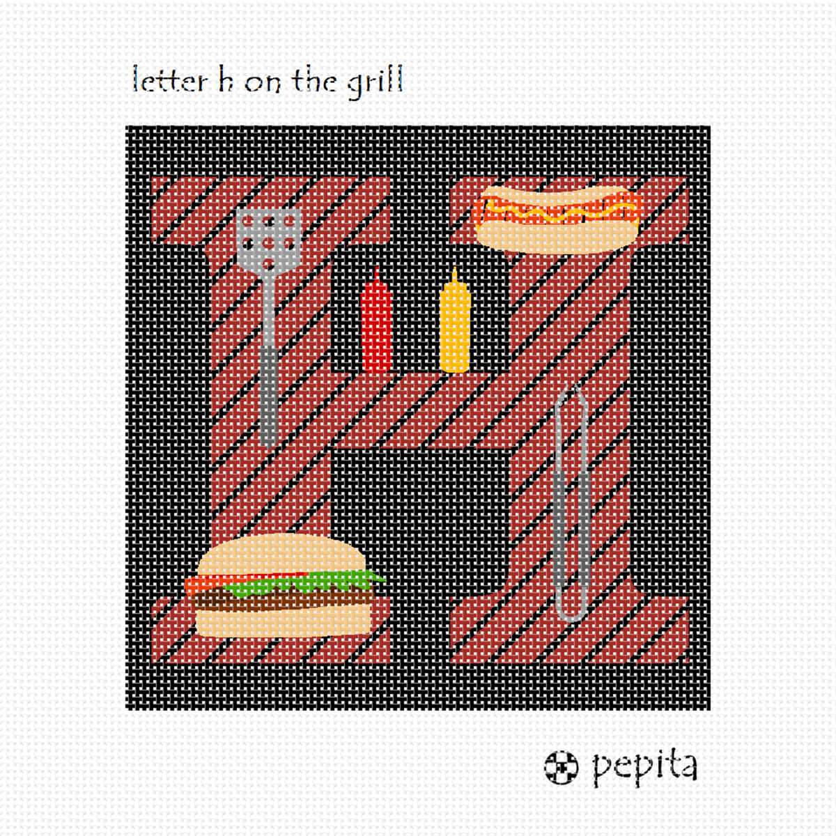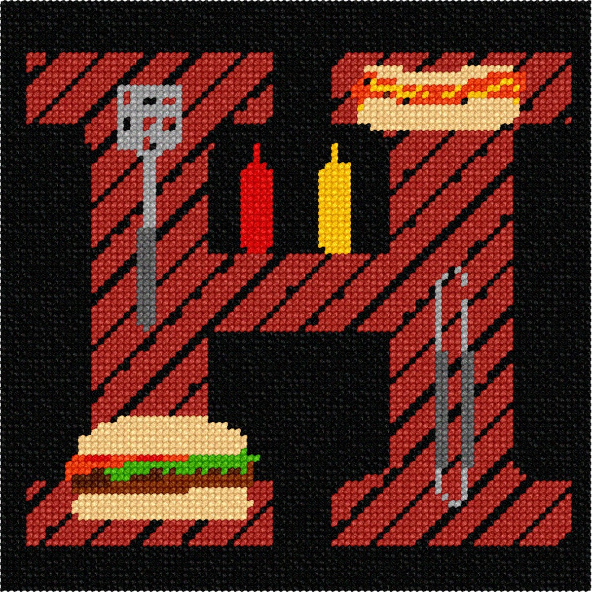 For the barbecue and grill aficianodo in your life. Stitch this alphebet letter with ketchup, mustard, hamburger, frank, and grill tools all sitting on a sizzling red hot grill.