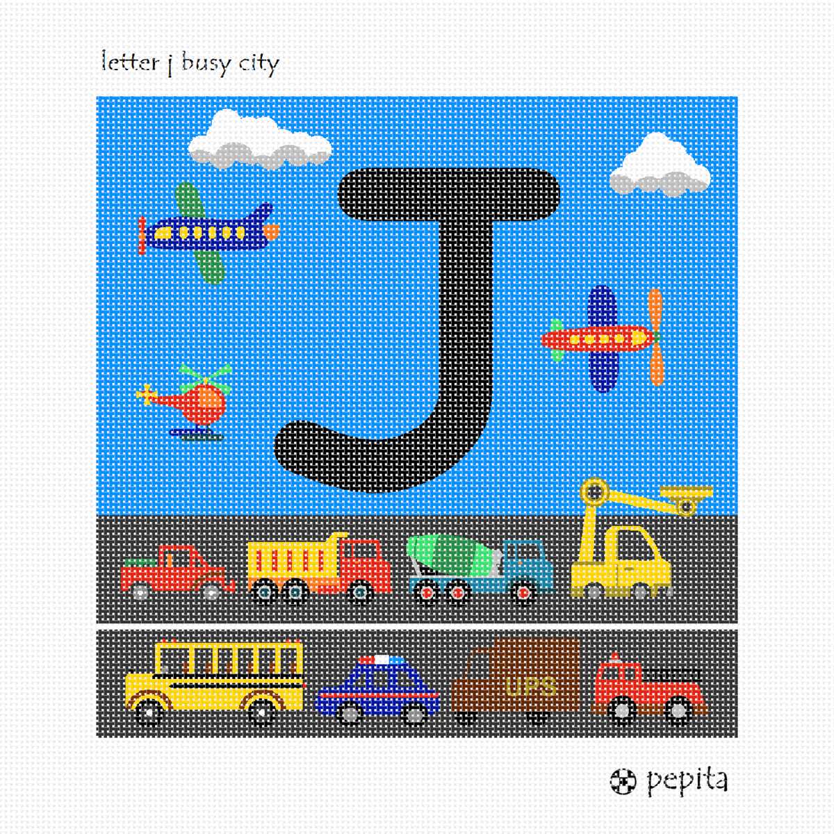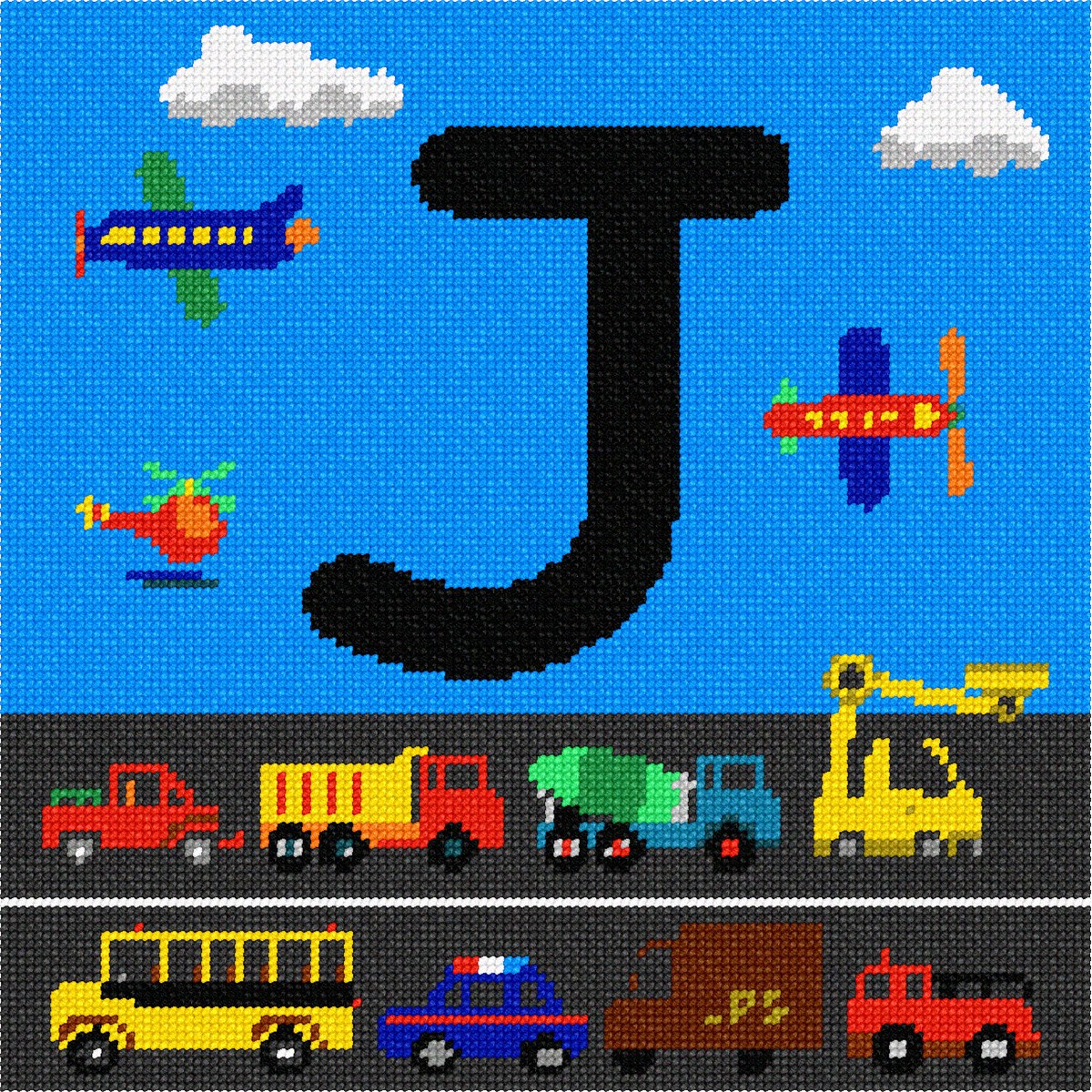 This Letter C is happening! An excavator, dump truck, fire engine, police car, pickup truck, mail truck, cement mixer, and a school bus are all riding along the highway. Helicopters and airplanes are flying in the sky. It is one busy day in this city. This is a perfect holiday gift to stitch for the little or big boy in your life who is fascinated by cars, trucks, and all things that go. Available in all the letters of the alphabet.