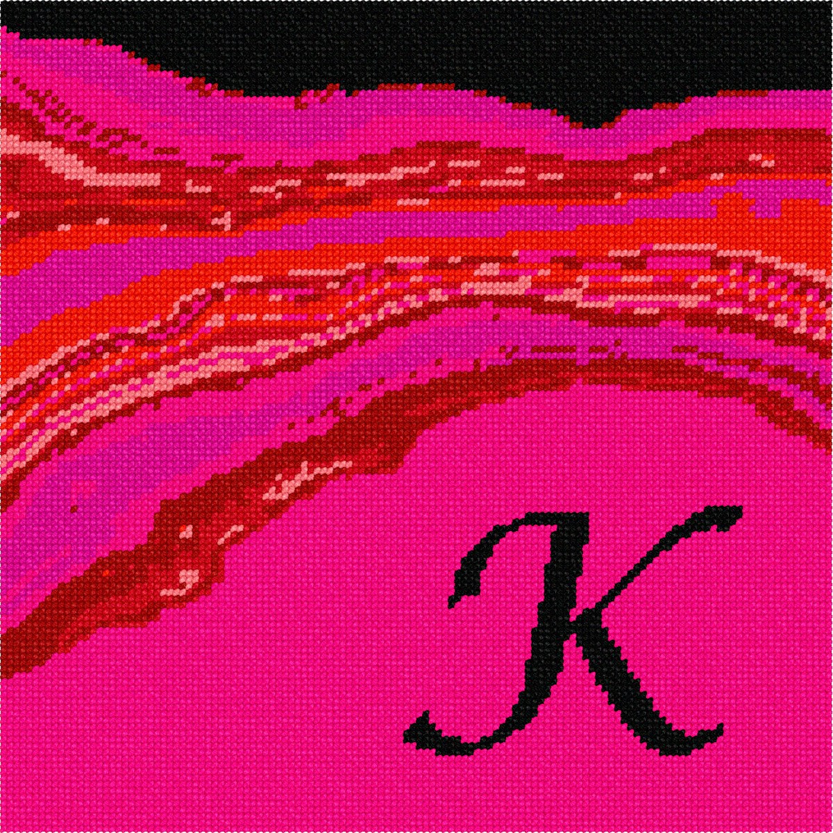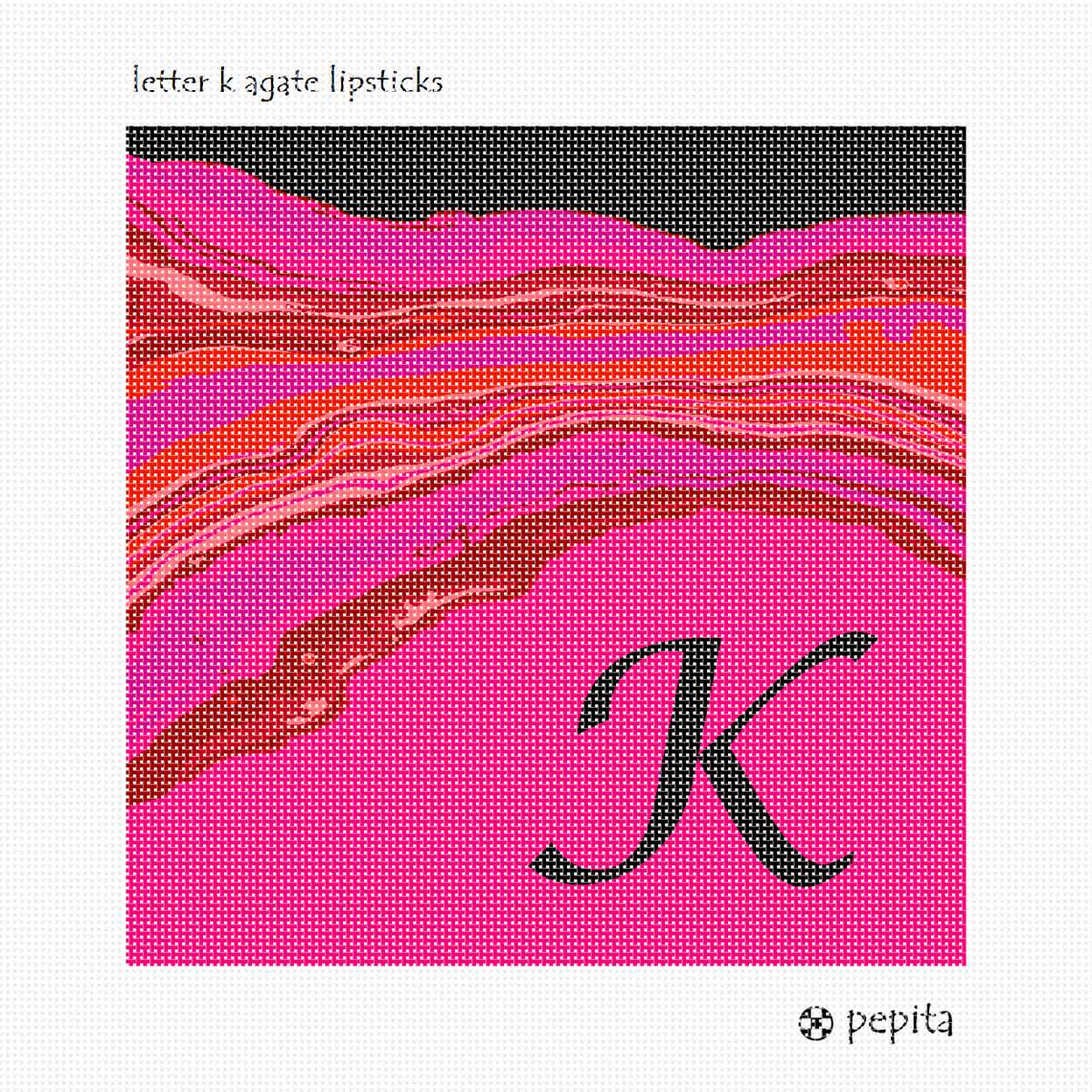 Letter K in bright lipstick and makeup shades. Perfect to stitch as a needlepoint pillow for a beloved person with the initial K.