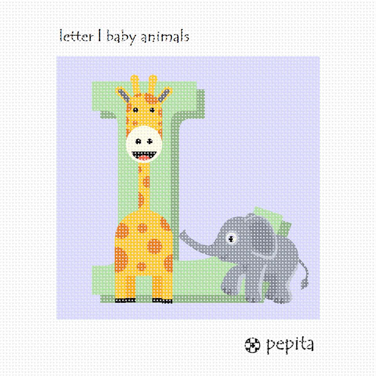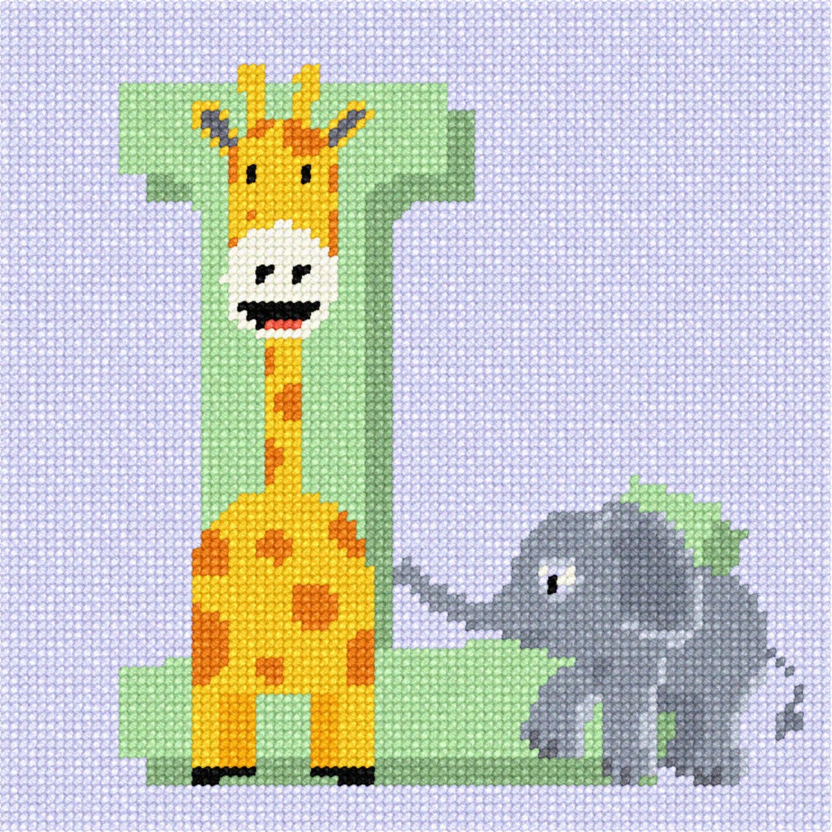 Alphabet initials to match safari theme nursery decor. This unisex design is adorable for any baby room. The tall giraffe and happy elephant will delight the stitcher as well as the baby. See coordinating lavender and sage designs. This is available in any English Alphabet letter.