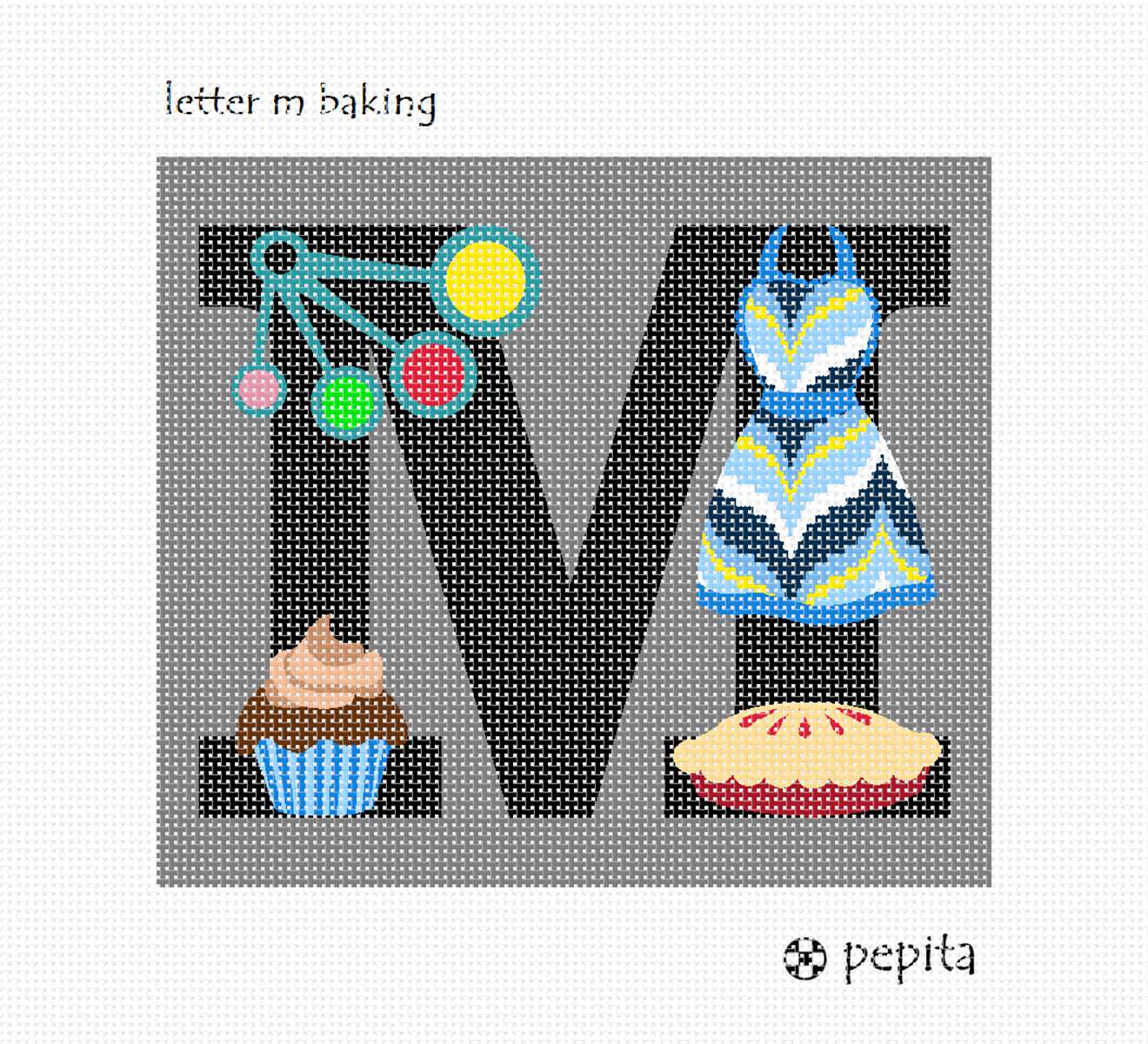 For the person in your life who loves to bake. A bargello apron, cupcake, and pie along with measuring spoons adorn this lovely letter of the alphabet. This is an adorable gift for the cake decorator, baker, or bakery owner.