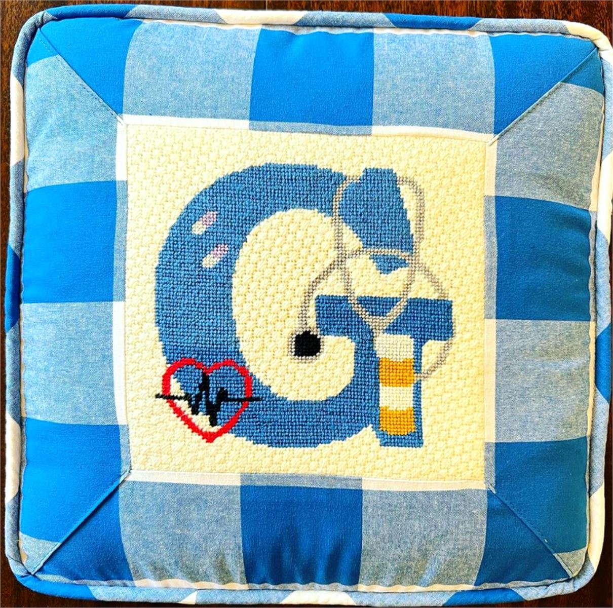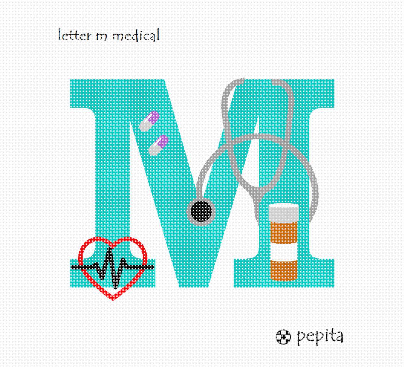 Stitch this needlepoint for your favorite person in the medical profession. Stethoscope, pills, medicine bottle, and heart icon adorn this letter M that is the color of today's surgical scrubs. Adorable! Perfect as a gift for someone in medical school or in residency.