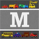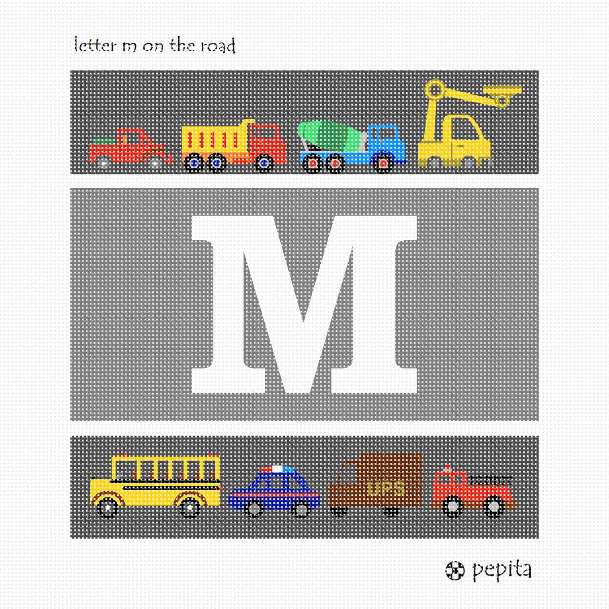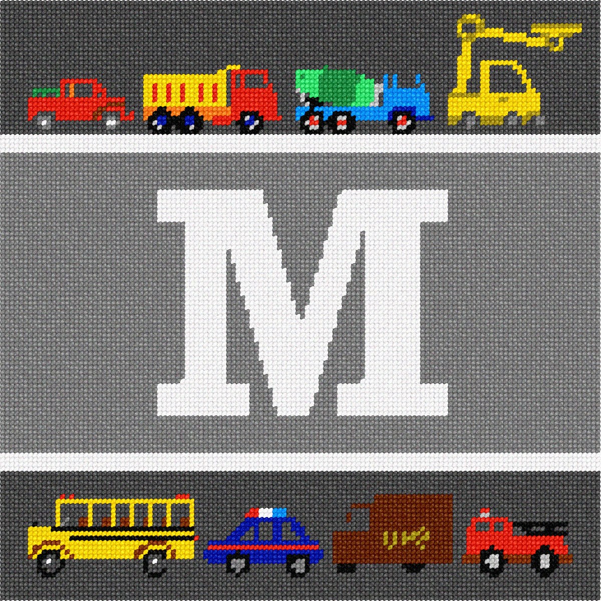 An excavator, dump truck, fire engine, police car, pickup truck, mail truck, cement mixer, and a school bus are all riding along the highway. Stitch for your favorite littly guy with the initial M. Available in any letter of the alphabet.