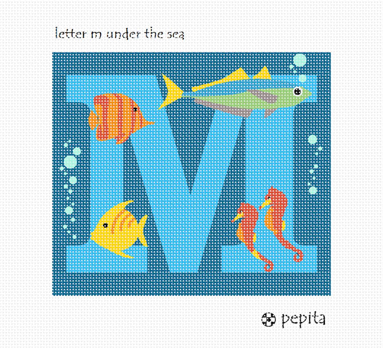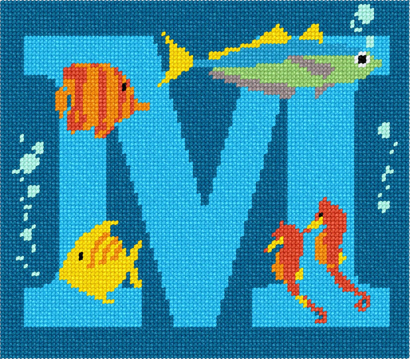 Many sea creatures call the ocean home. From giant whales to tiny tadpoles, marine life is active and fascinating for children and adults alike. All the animals interact and live together in the underwater ecosystem. Seahorses dance while schools of fish gracefully swim amongst the coral reefs. Stitch this letter M for your favorite budding marine biologist.