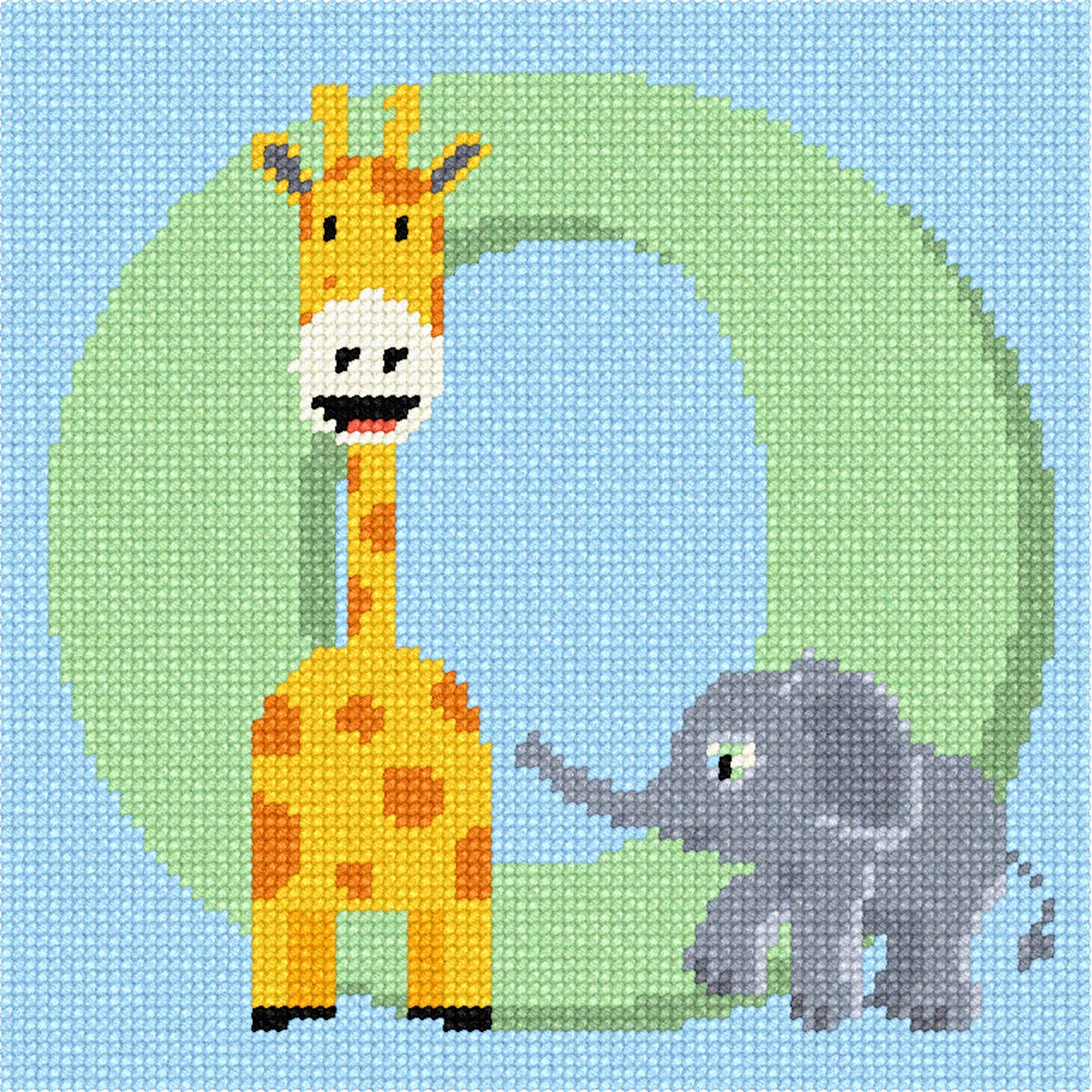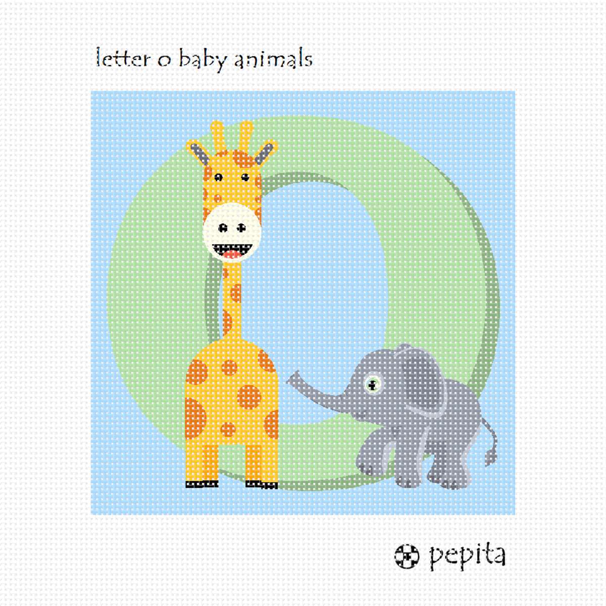 Alphabet initials to match safari theme nursery decor. This unisex design is adorable for any baby room. The tall giraffe and happy elephant will delight the stitcher as well as the baby. See coordinating lavender and sage designs. This is available in any English alphabet letter.