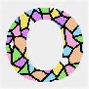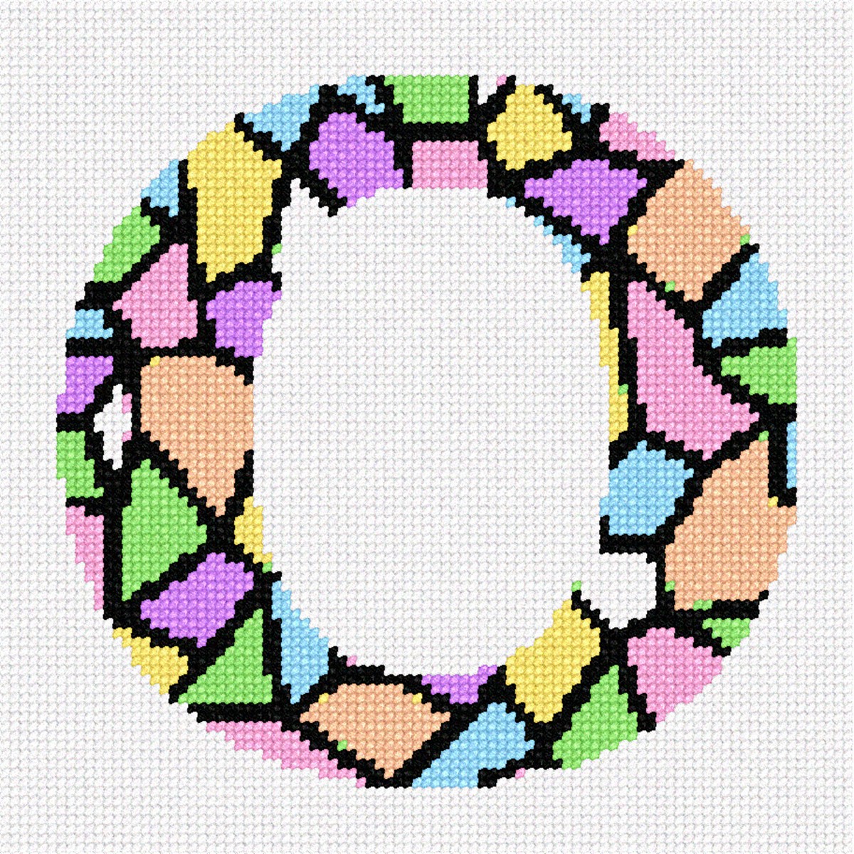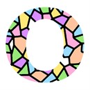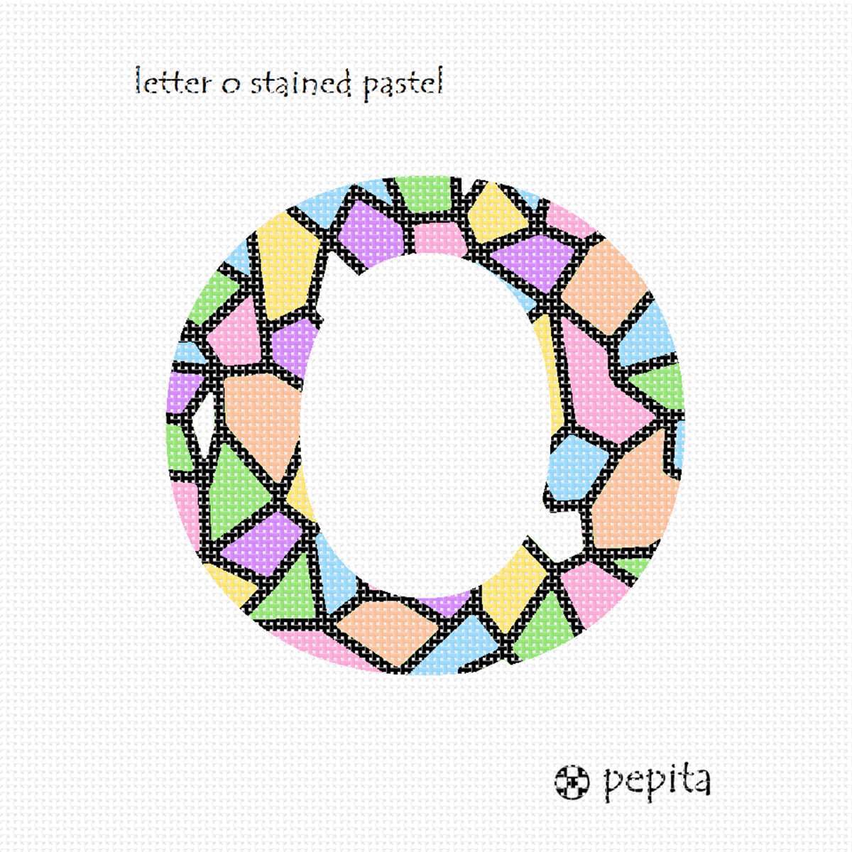 The subject is a stylized letter "O" composed of intricate stained glass-like pastel panels, creating a striking mosaic effect. The color palette features soft pinks, blues, greens, and purples, evoking a sense of tranquility and whimsy. Delicate black outlines accentuate each segment, adding bold contrast and a touch of sophistication to the composition.