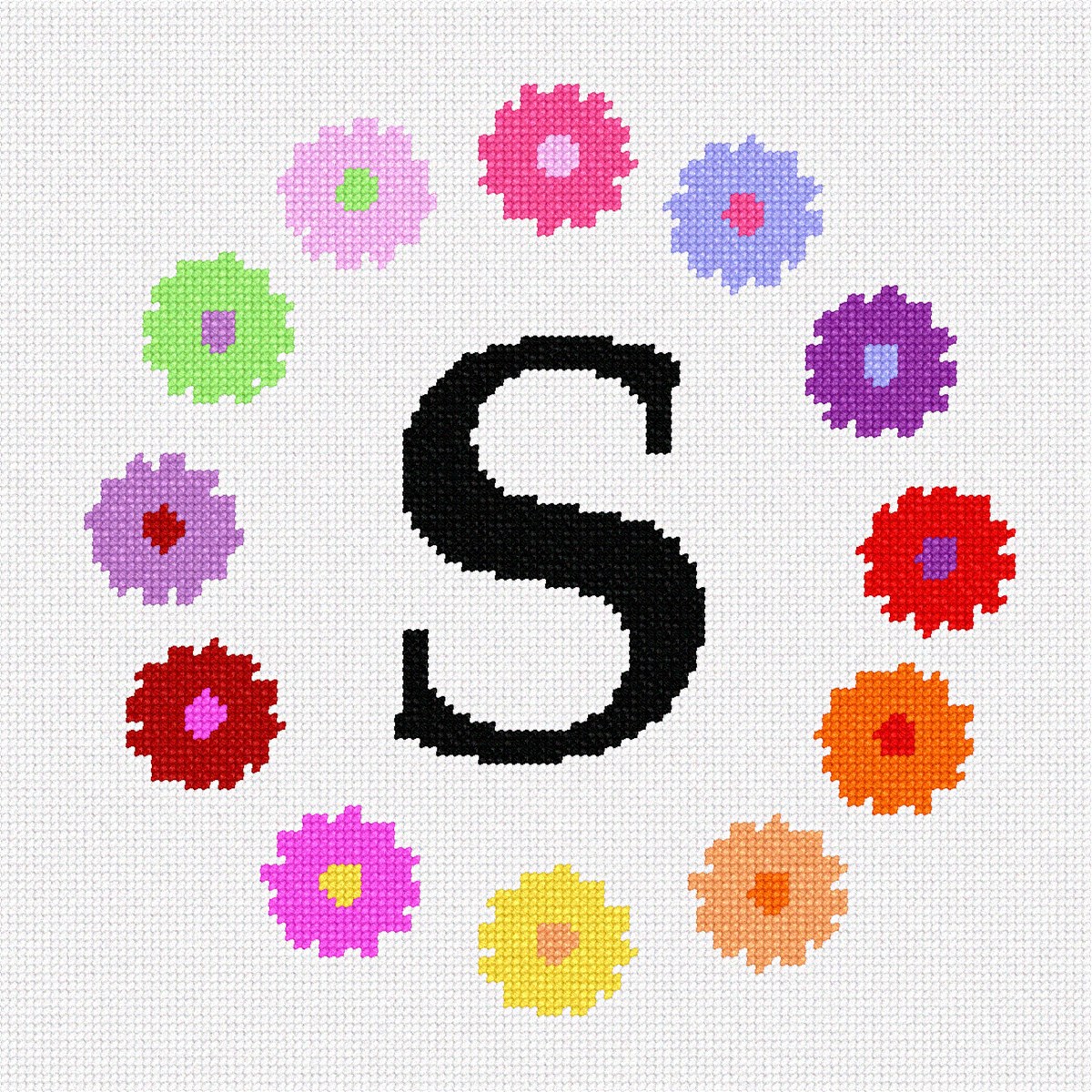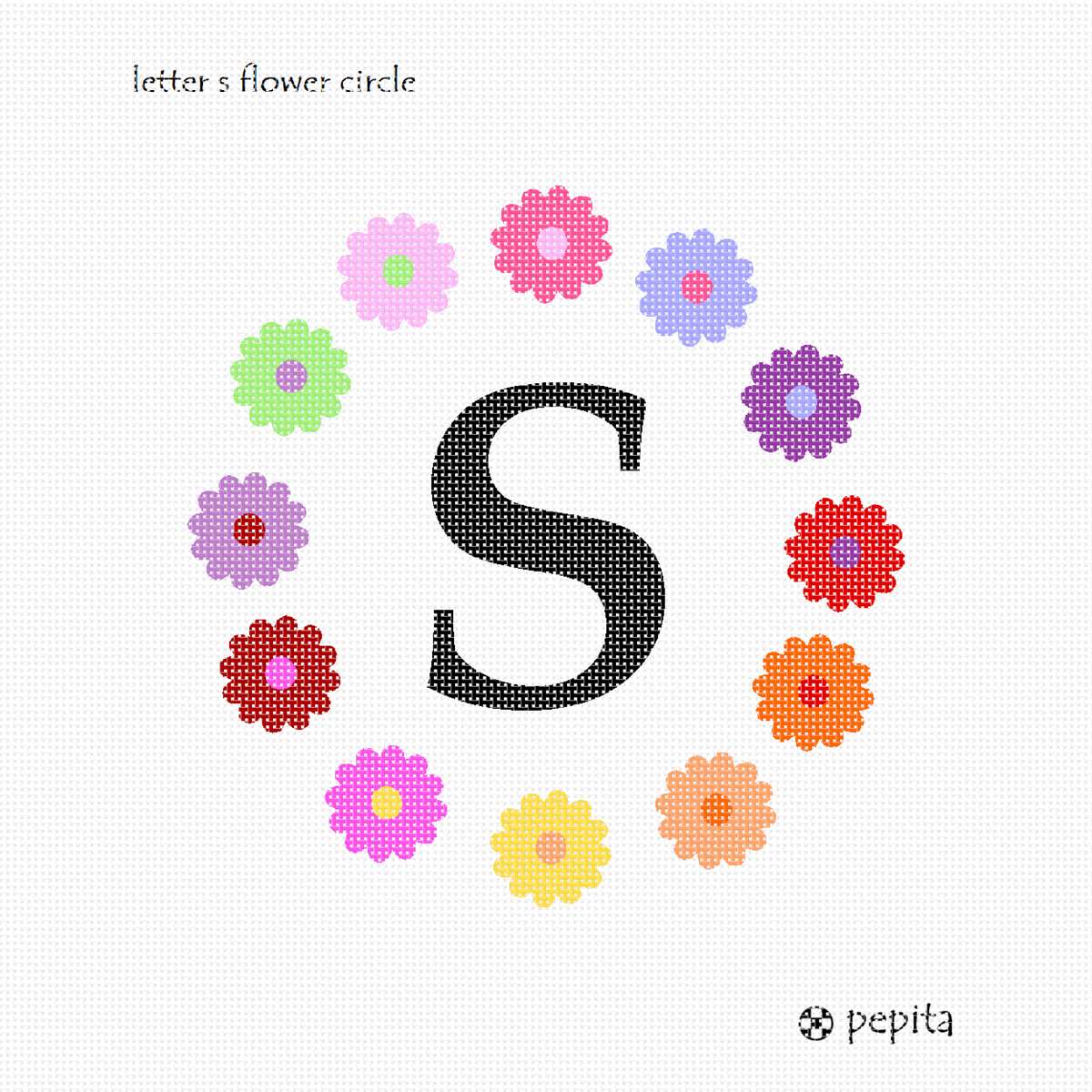The Letter S in the center of a wreath of whimsy flowers in a circle. This would make a fantastic personalized needlepoint pillow. About 100 languages use the same alphabet like in English which makes it one of the most widely used alphabets in the world. While some languages have a few more and others a few less, they all share the 23 core letters originally found in the Roman alphabet. The most commonly used letter is the letter E. The letter J was the most recent letter to be added to the alphabet, appearing in print as a distinct letter for the first time in 1633. A sentence which contains all 26 letters of the English alphabet is called a pangram. A famous pangram is: “The quick brown fox jumps over the lazy dog.” but there are even shorter ones such as: “Pack my box with five dozen liquor jugs.” Every letter of the alphabet has a wild, or at least interesting, story, often going back thousands of years. You can look it up on Wikipedia.