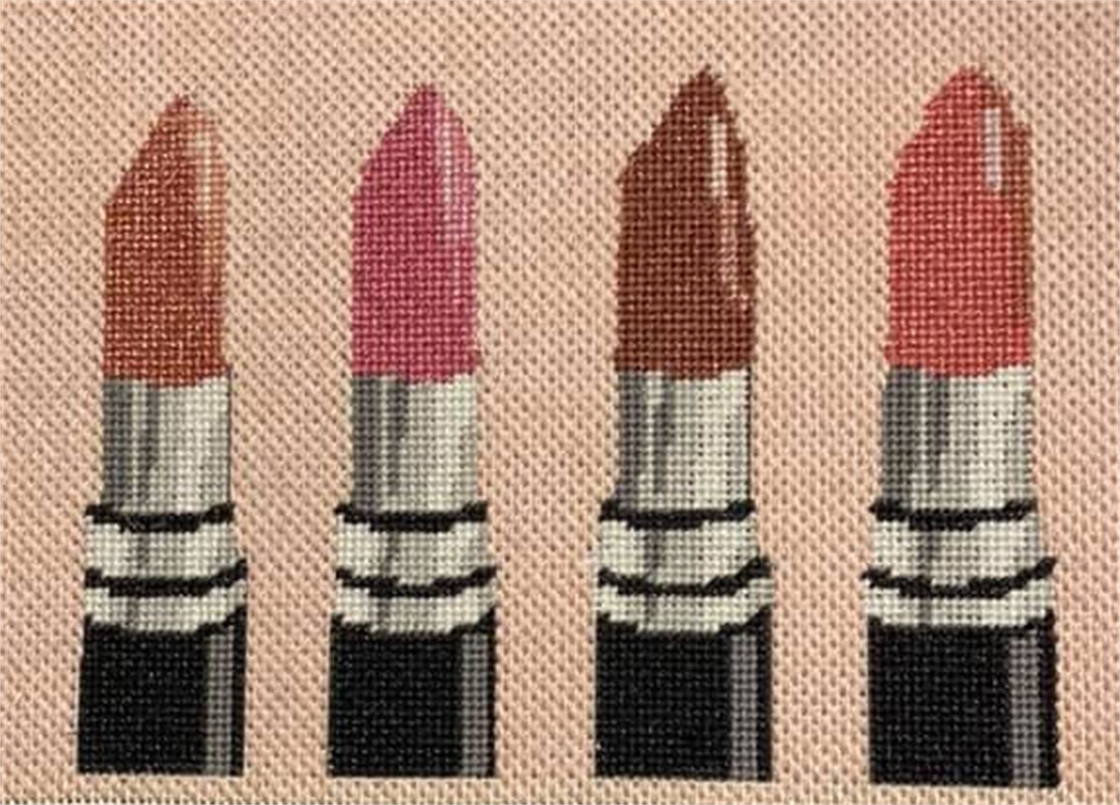 Which color lipstick will you wear today? Enjoy stitching this sophisticated posh design. The "lipstick effect" is a psychological phenomenon in which wearing makeup can boost an individual's confidence, increase self-esteem, and make them feel more physically attractive. Cosmetics help us play up our best features and hide our flaws. This design was featured in Needlepoint Now Magazine.