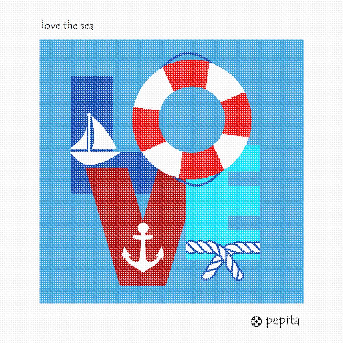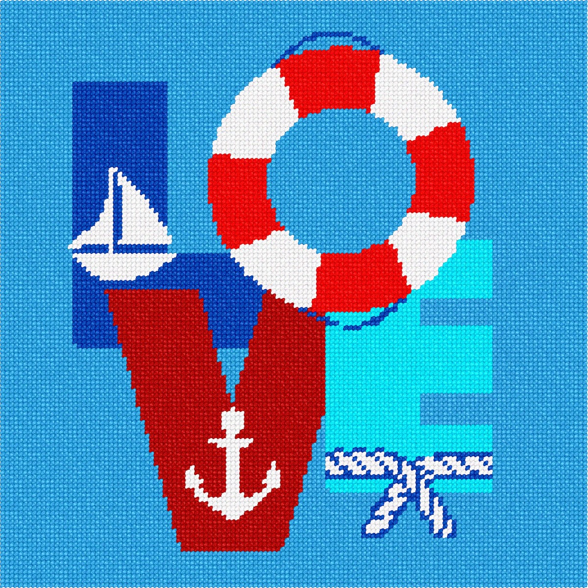 The word LOVE with a nautical theme: a lovely sailboat, anchor, rope, and floating ring make this needlepoint a favorite. A great gift for anyone who loves boats, sailing, oceans, yachts, and water sports.